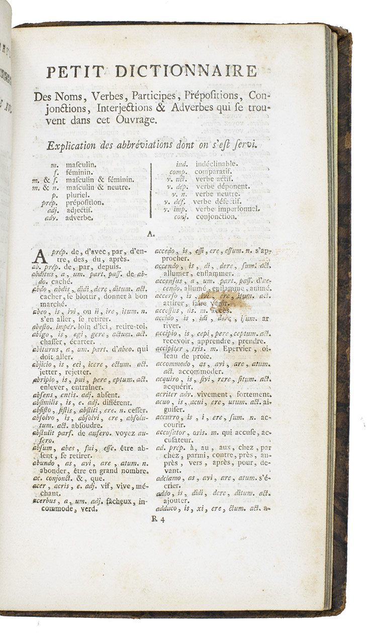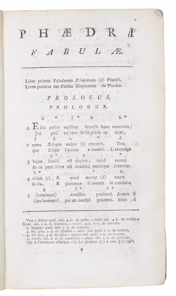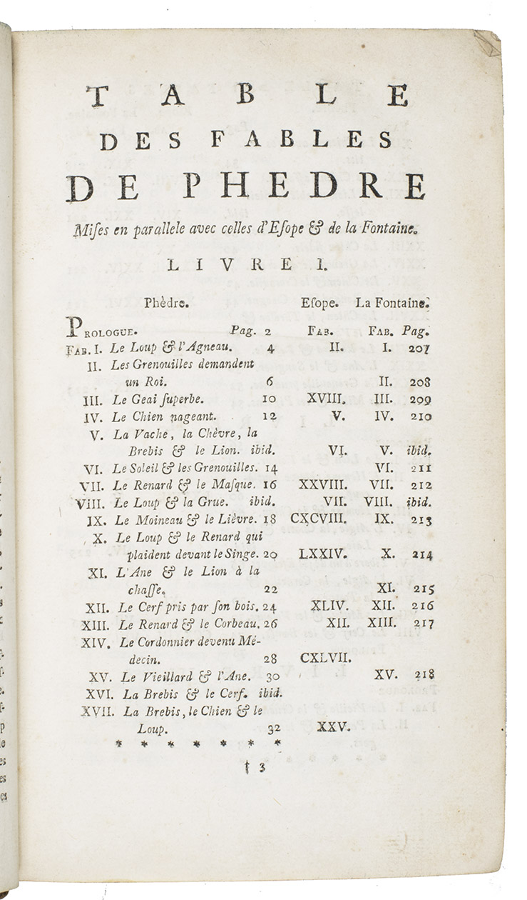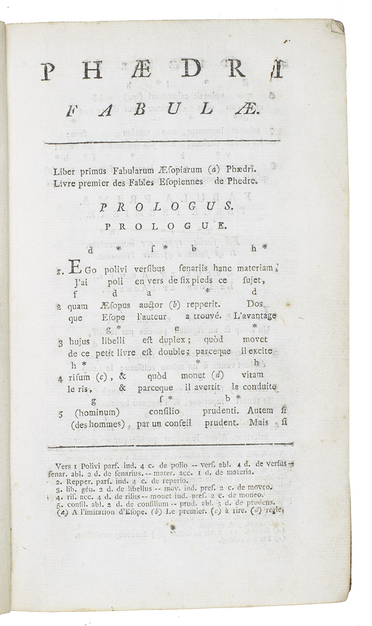Amsterdam reprint of an edition published in Rouen of this interesting School edition of the Phaedrus fables (pp. 1-205) in Latin verses with notes underneath and a French translation in prose on facing pages, together with a choice collection of 49 fables of De La Fontaine, numbered after the related Phaedrus fable, and followed by an extensive dictionary of words etc. occurring in the fables.