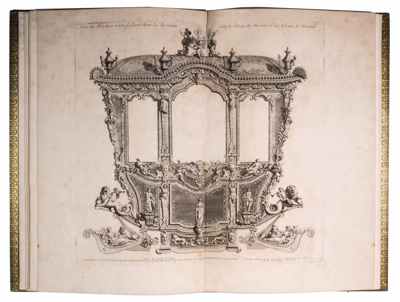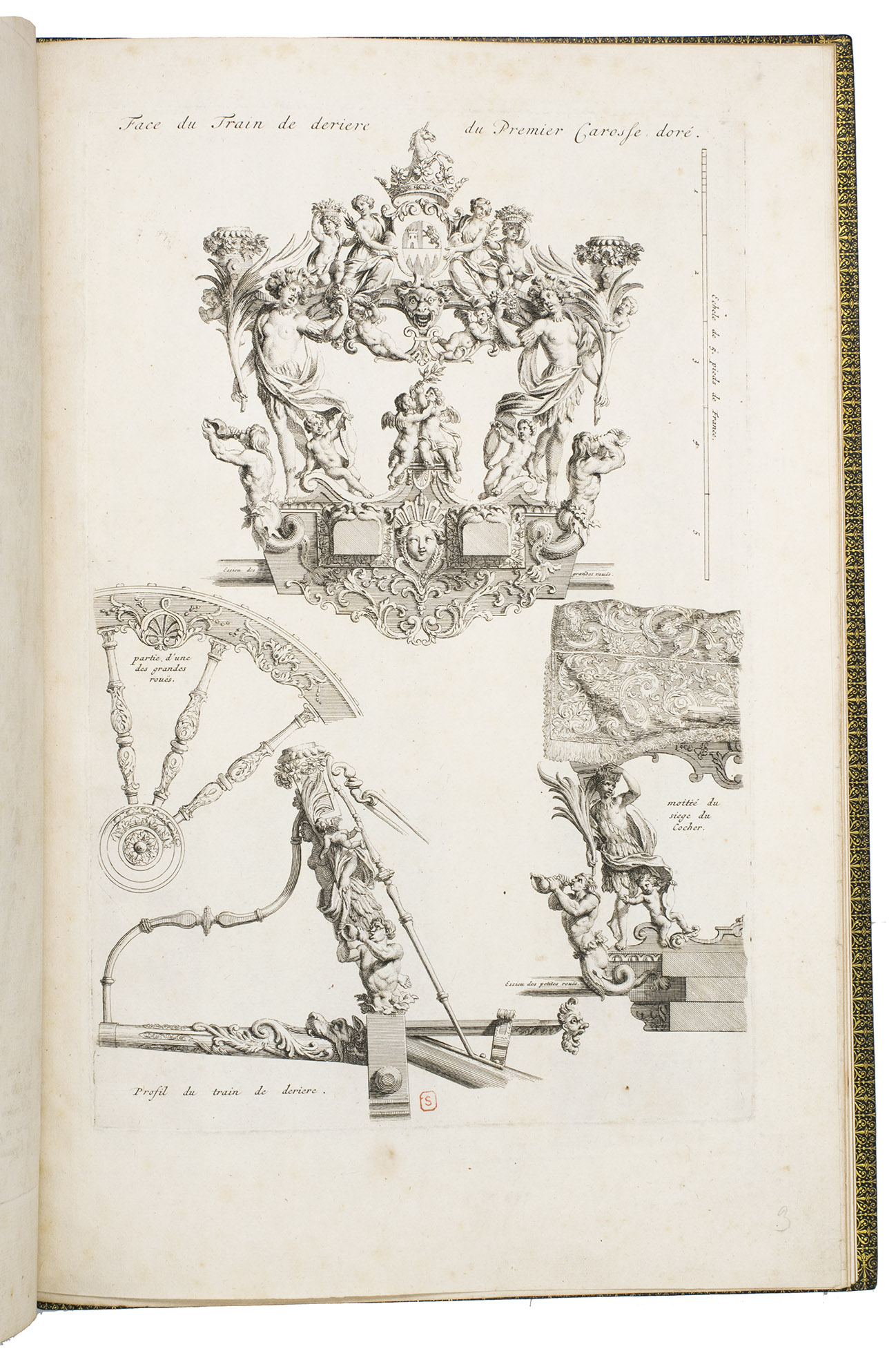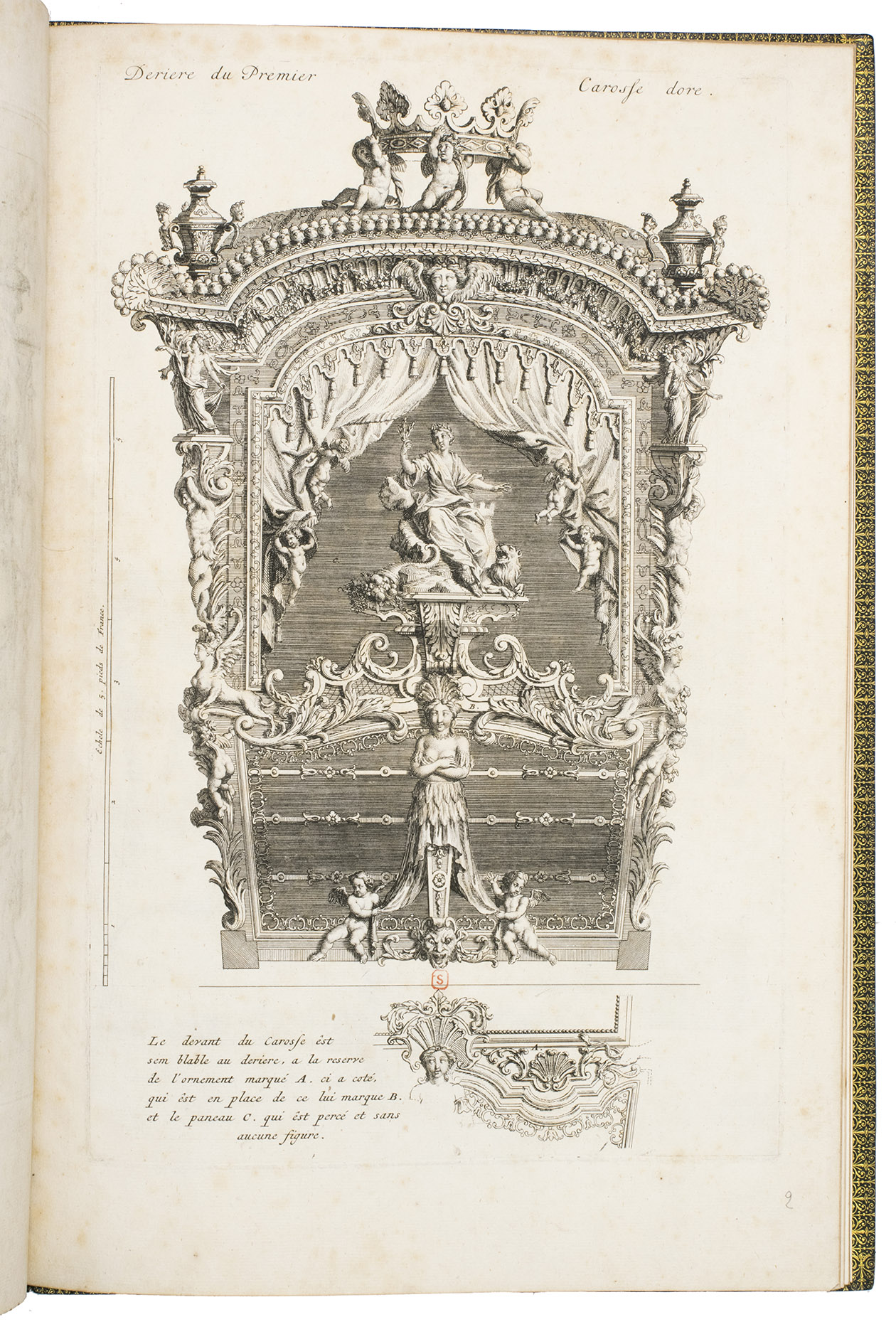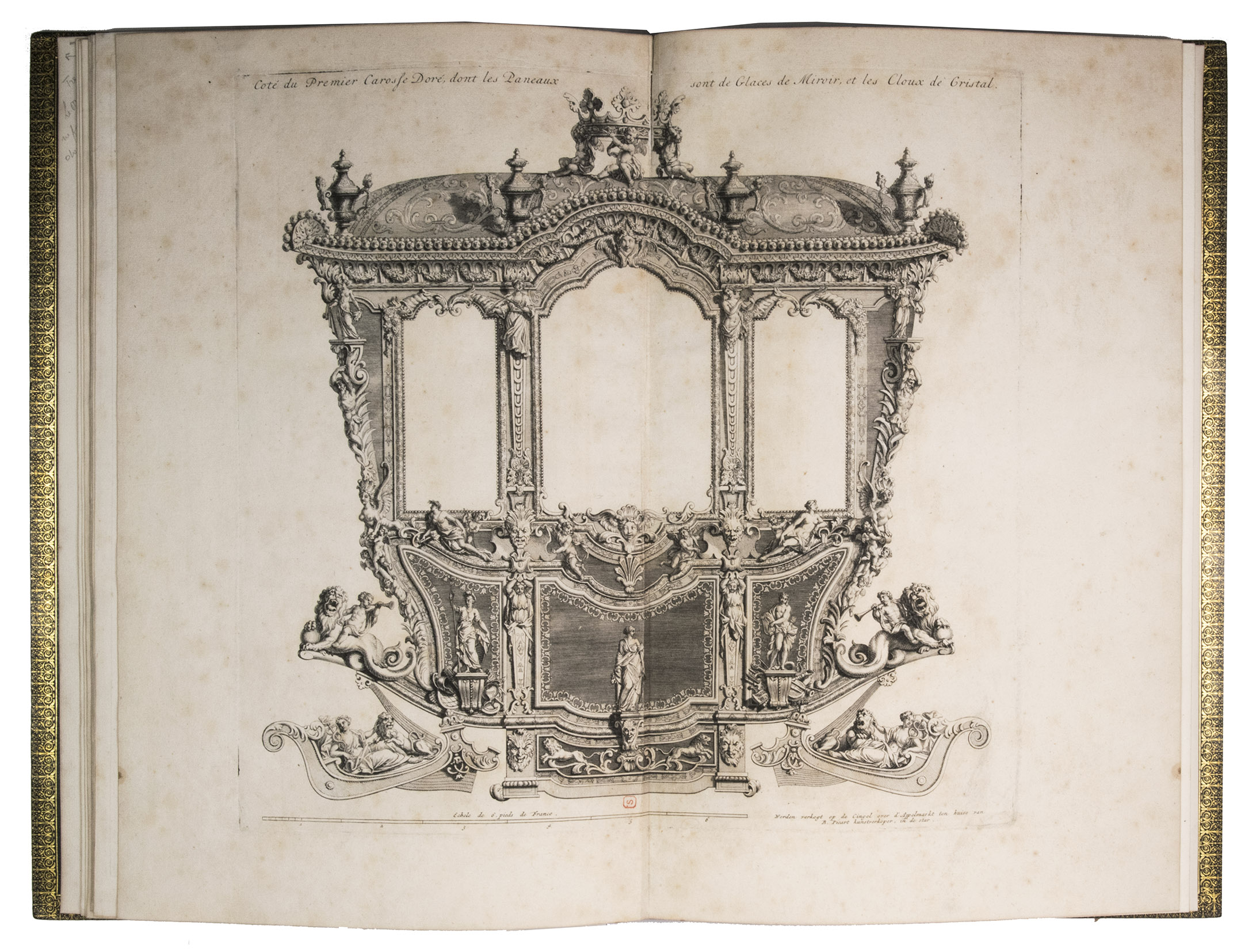 Rare first and only edition of a series of prints illustrating the ornate sculptural coach used for the entry of the Duke of Osuna into the Dutch city of Utrecht in 1713, and a title-page decorated in the same style. The sixth 6th Duke of Osuna, Francisco de Paula Téllez-Girón y Benavides (1678-1716), visited Utrecht as the Spanish delegate for the peace negotiations that resulted in the Treaty of Utrecht, which helped end the War of the Spanish Succession. The Duke is known to have given several extravagant feasts during his stay of two years. The carriage has a so-called "Boulle" floor, which was also used for John V of Portugal's coach used during the parade in Lisbon of about 1715.