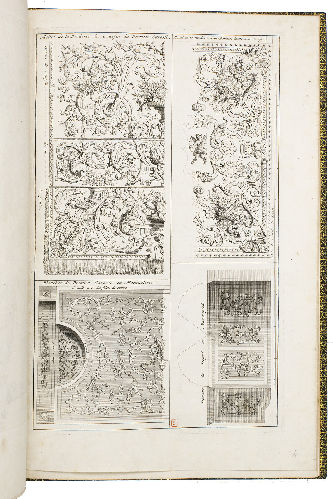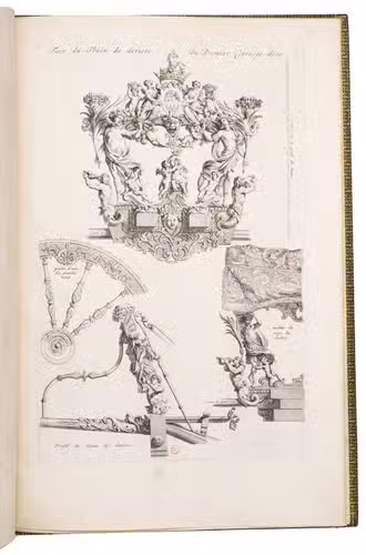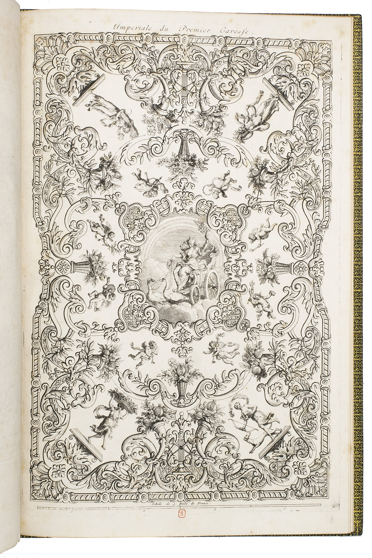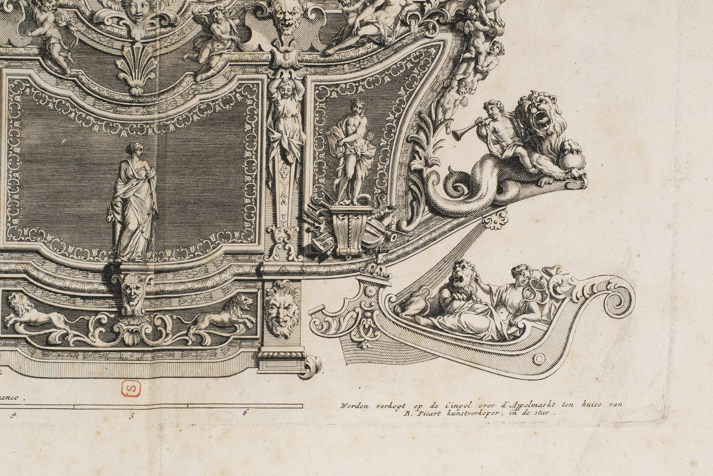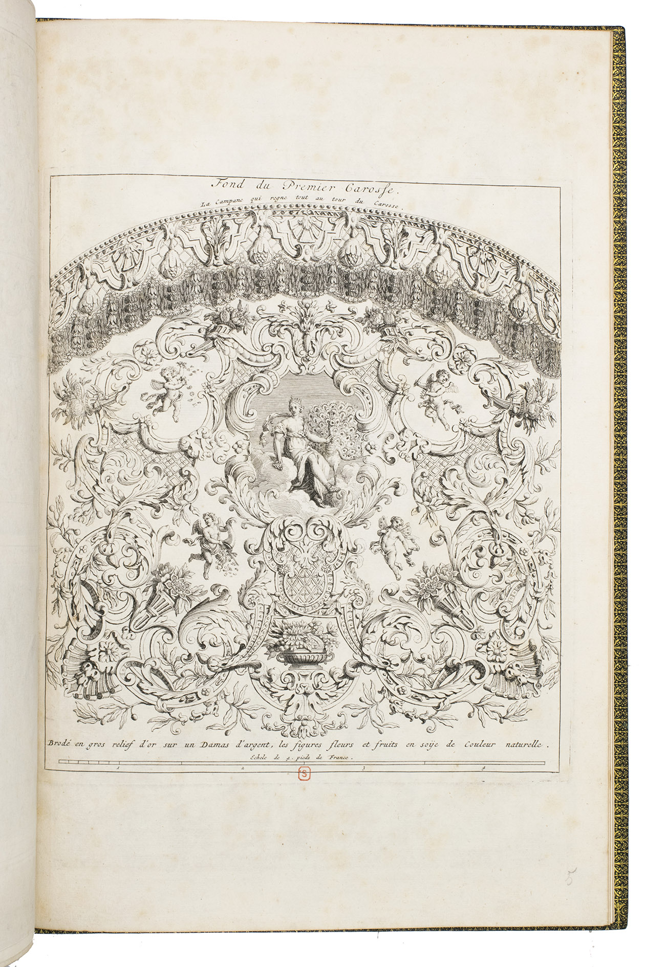 Rare first and only edition of a series of prints illustrating the ornate sculptural coach used for the entry of the Duke of Osuna into the Dutch city of Utrecht in 1713, and a title-page decorated in the same style. The sixth 6th Duke of Osuna, Francisco de Paula Téllez-Girón y Benavides (1678-1716), visited Utrecht as the Spanish delegate for the peace negotiations that resulted in the Treaty of Utrecht, which helped end the War of the Spanish Succession. The Duke is known to have given several extravagant feasts during his stay of two years. The carriage has a so-called "Boulle" floor, which was also used for John V of Portugal's coach used during the parade in Lisbon of about 1715.