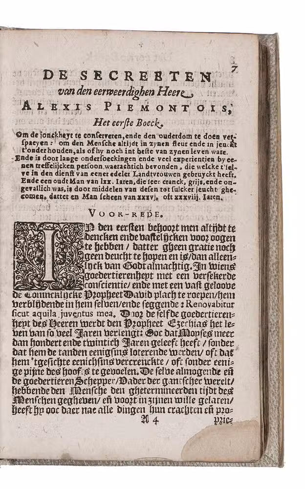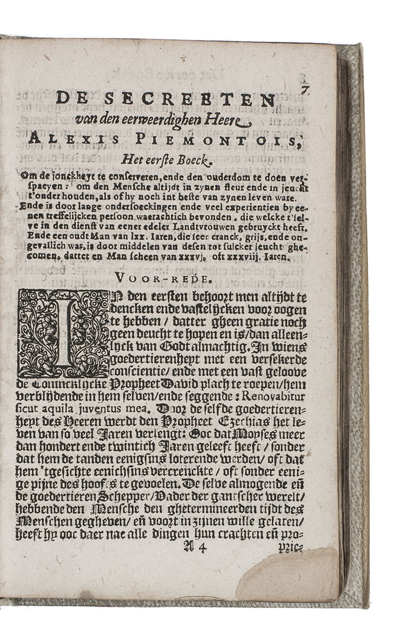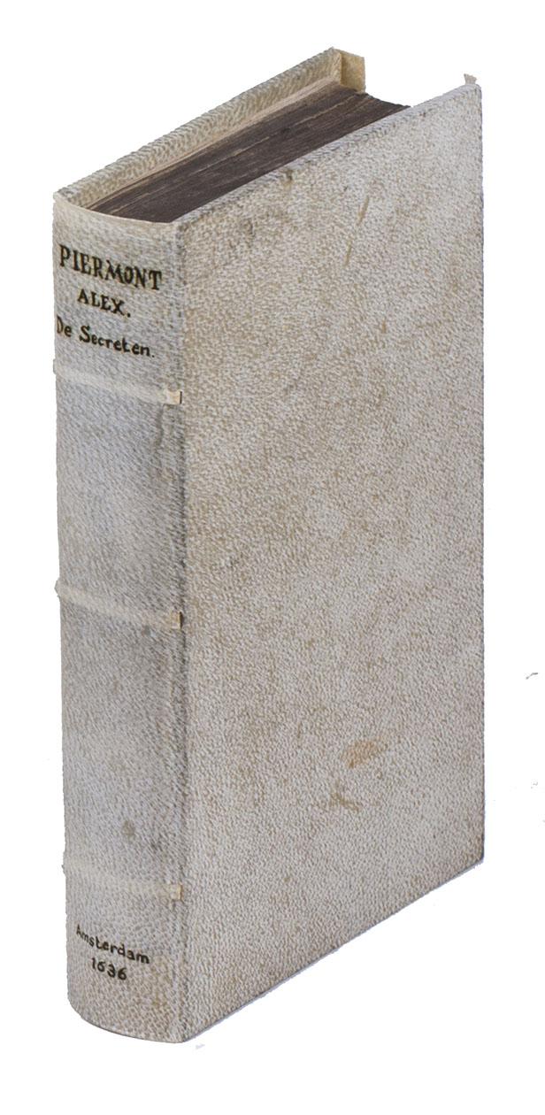 Rare sixth edition of the Dutch translation of an immensely popular book of secrets, compiled by Alexis of Piedmont. It is generally supposed that Piedmont is the pseudonym of the Italian humanist Girolamo Ruscelli (1500-1566), since Ruscelli mentions in a later work that he and other humanists had founded an "Academy of Secrets" that had published the Secreti. "Books of secrets and experiments had been prominent in medieval manuscripts and were to flare forth again in the second half of the [16th] century in the Secreti of Alessio of Piedmont, of which Ferguson listed 56 edition between its first appearance in 1557 [in Venice] and the end of the century" (Thorndike). It gives numerous "secrets", ranging from how to dye leather, to how to cure sick horses, clean paintings and whiten teeth. Besides these more convenient secrets, there are some occult passages, informing the reader how to dream wildly or how "to write letters on someone's skin that can never be removed". "No treatise better illustrates the popular or household practice of applied chemistry, of the arts, and of medicine..." (Ferguson).