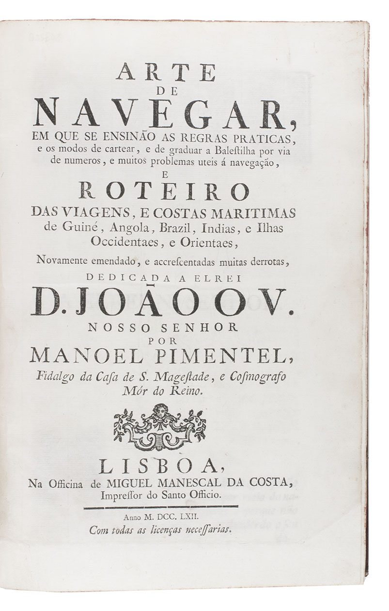 Arte de navegar, em que se ensinão as regras praticas, e os modos de cartear, e de graduar a Balestilha por via de numeros, e muitos problemas uteis aì navegação, e roteiro das viagens, e costas maritimas de Guineì, Angola, Brazil, Indias, e Ilhas Occidentaes, e Orientaes ...