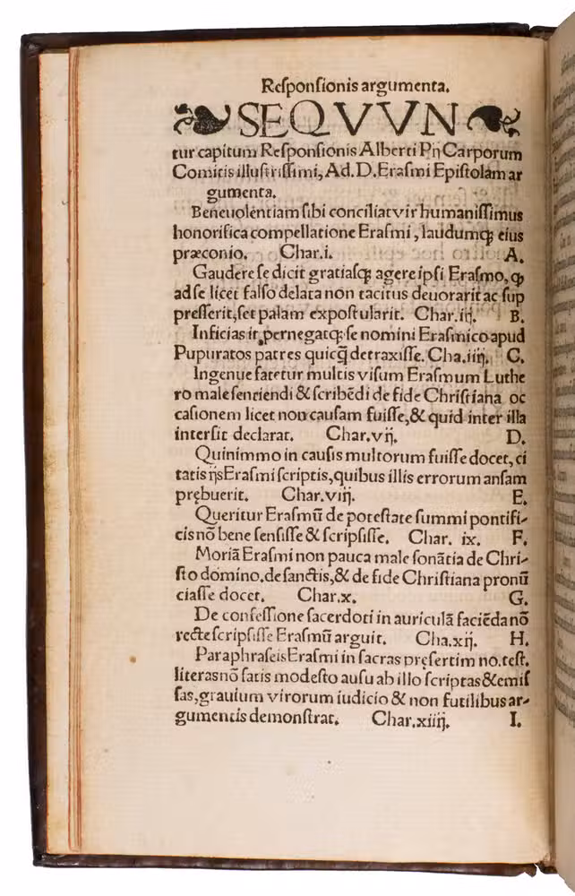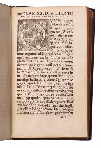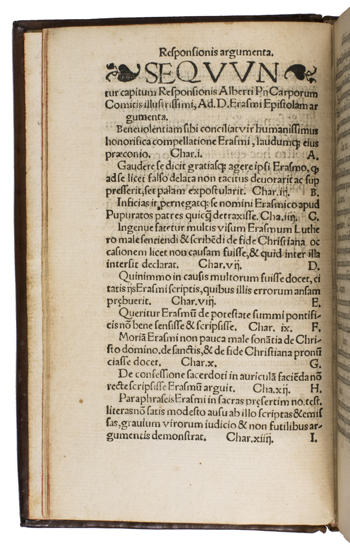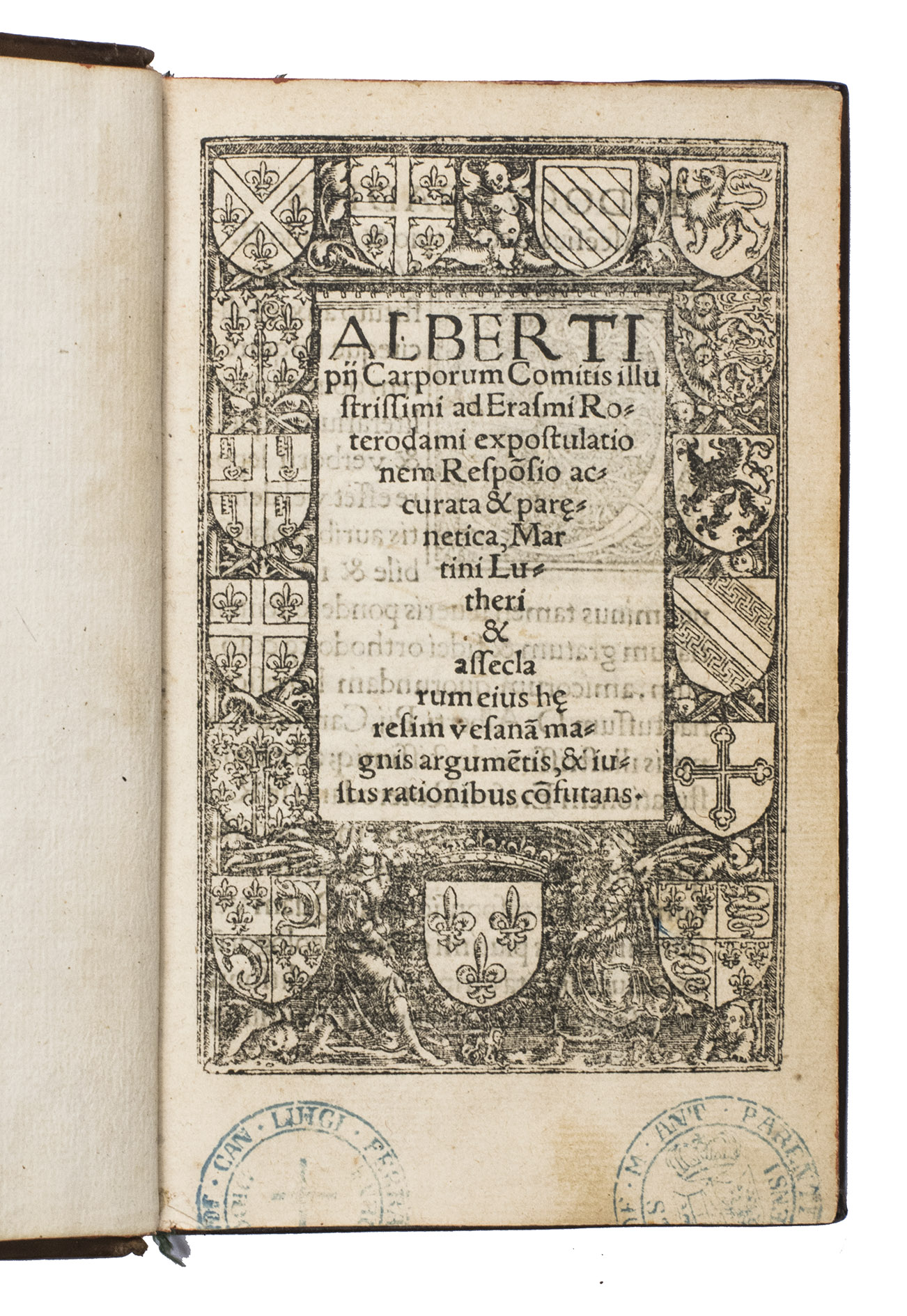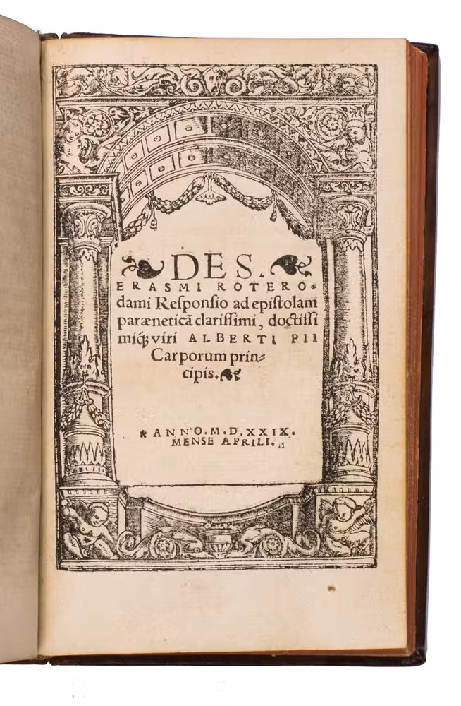 Ad 1: Unrecorded issue of the 1529 edition of Alberto Pios attack on Erasmus. Alberto III Pio (1475-1531), Prince of Carpi and a staunch defender of Catholic orthodoxy, composed this treatise as a direct attack on Erasmus and his theological ideas. In it, Pio accuses Erasmus of undermining the foundations of the Christian faith, sowing doubt about traditional theology, and indirectly aiding the cause of Luther and his followers. The work not only denounces Erasmuss ideas but also presents a systematic refutation of Lutheran "heresies".