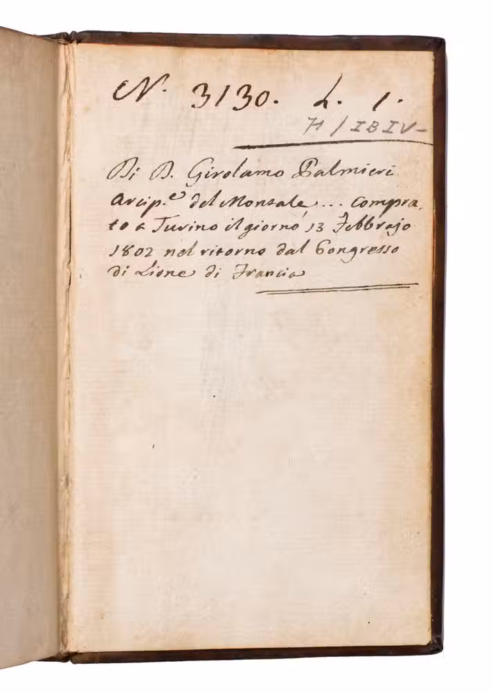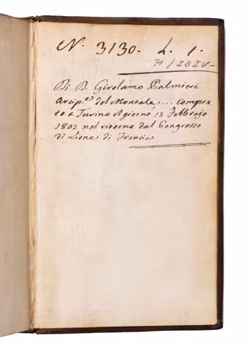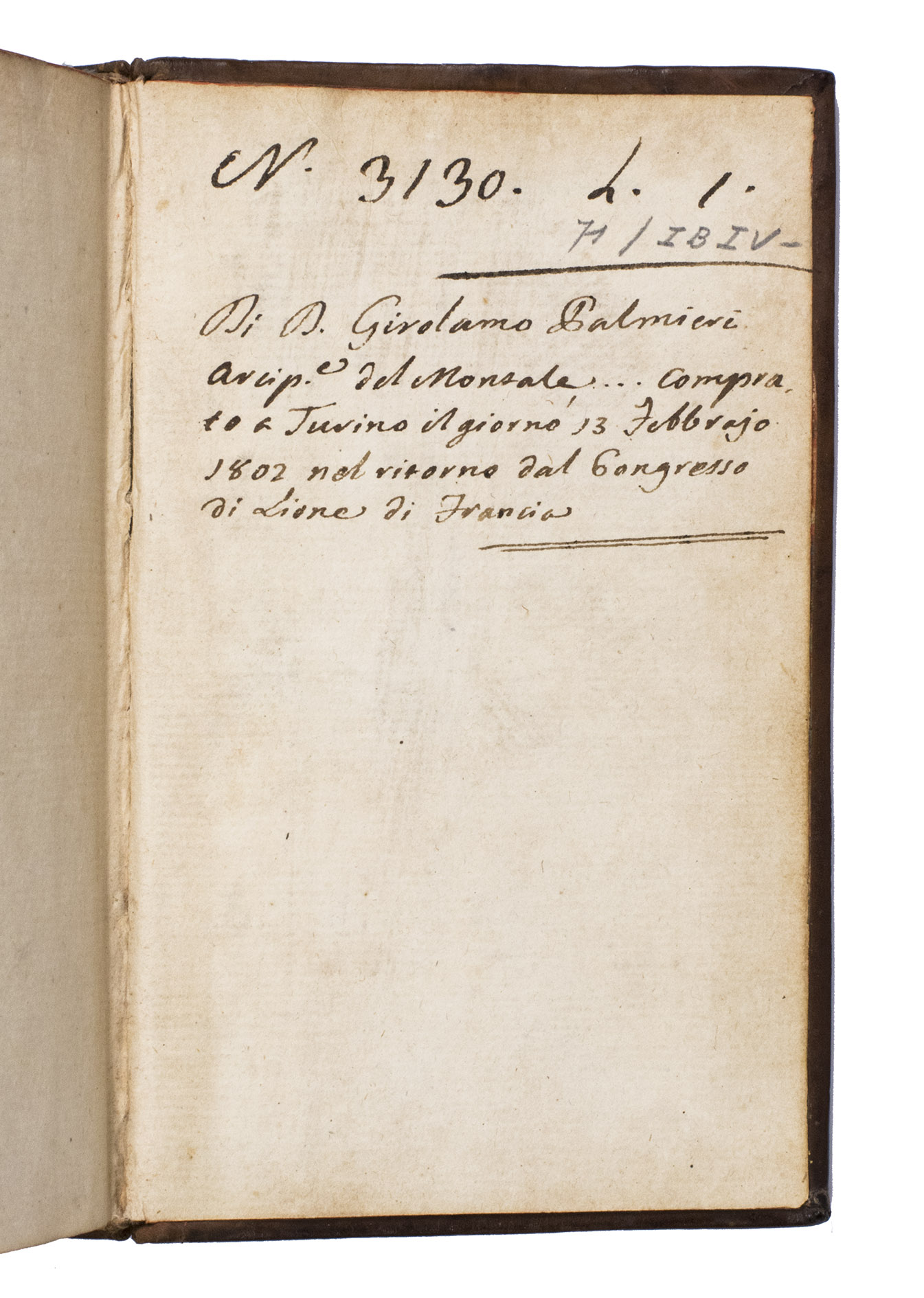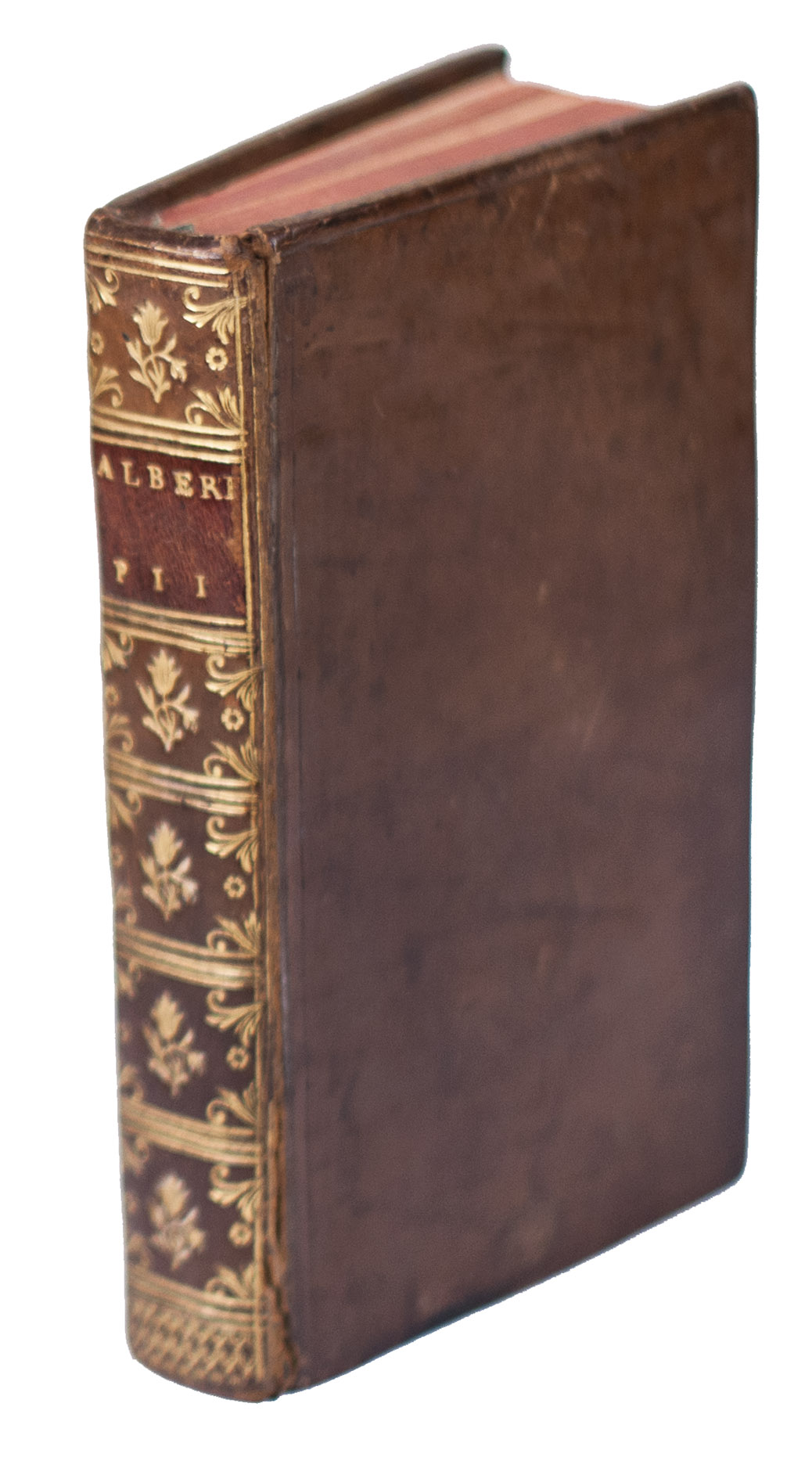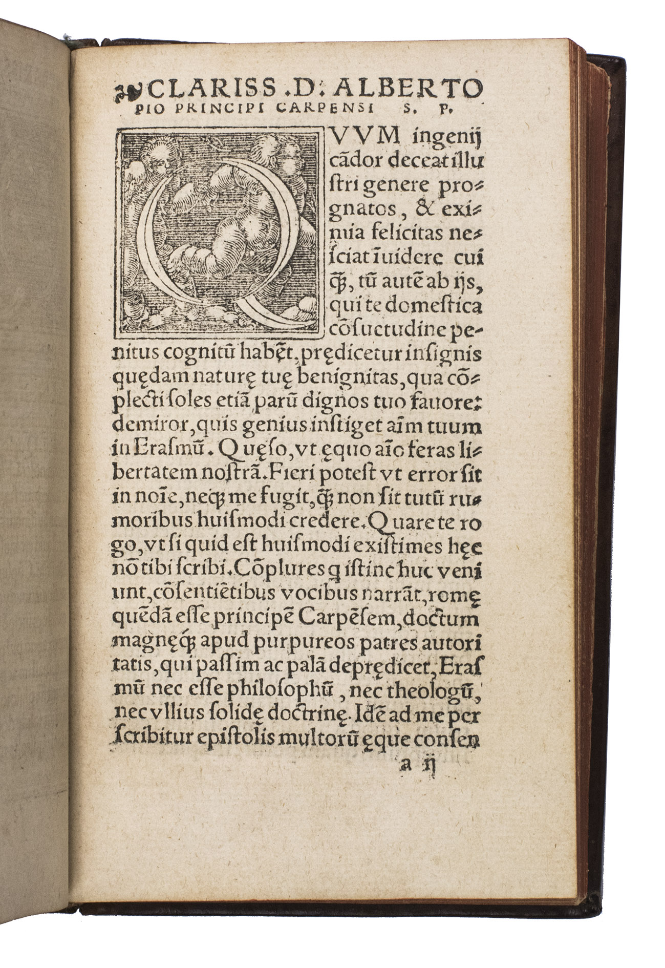 With manuscript owners inscriptions in brown ink on the verso of the first free flyleaf and the recto of the final free flyleaf. With 2 blue round censor stamps on both the title page of ad 1 and the blank verso of the last leaf of ad 2 of the Diocese of Modena, Italy. The text of both works is occasionally lightly underlined and/or struck through. The boards are slightly scratched and rubbed, the front hinge is slightly weakened at the head and foot of the spine, very slightly browned throughout. Otherwise in good condition. Casini, La prima sessione del Collegio elettorale dei dotti in Bologna nel 1802, p. 34; Ad 1: this ed. not in BM STC Italian; De Reuck; EDIT 16; OPAC SBN; USTC; Vander Haeghen; WorldCat; cf. Donker, De Correspondentie van Desiderus Erasmus 15 Brieven 2082 - 2203 (2017), p. 11; Minnich, N. H. Alberto Pio's Defense of Scholastic Theology, A Companion to Biblical Humanism and Scholasticism in the Age of Erasmus, 2008, p. 277; for the dated 1529 issue: USTC 181155 (1 copy); WorldCat 125165062 (3 copies); Ad 2: Bezzel 1780; BM STC French p. 154; USTC 184864; Vander Haeghen I p. 175; not in de Reuck.