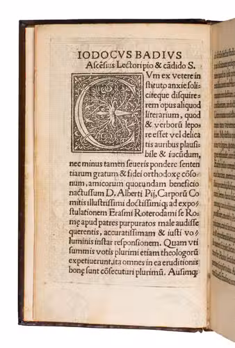 The work opens with a preface by the Parisian printer-humanist Jodocus Badius (1462-1535), who praises Pios work for its learning, orthodoxy, and Ciceronian eloquence. According to Ad Donker, the treatise first circulated in manuscript form from 1526, though the earliest officially published edition appeared in 1529 (Donker and Minnich). The present volume lacks the colophon dated 1529, it only gives a place date (presumably of the completion of the text) on the last page (Rome, May 1526) and it includes Badius 1529 preface.
