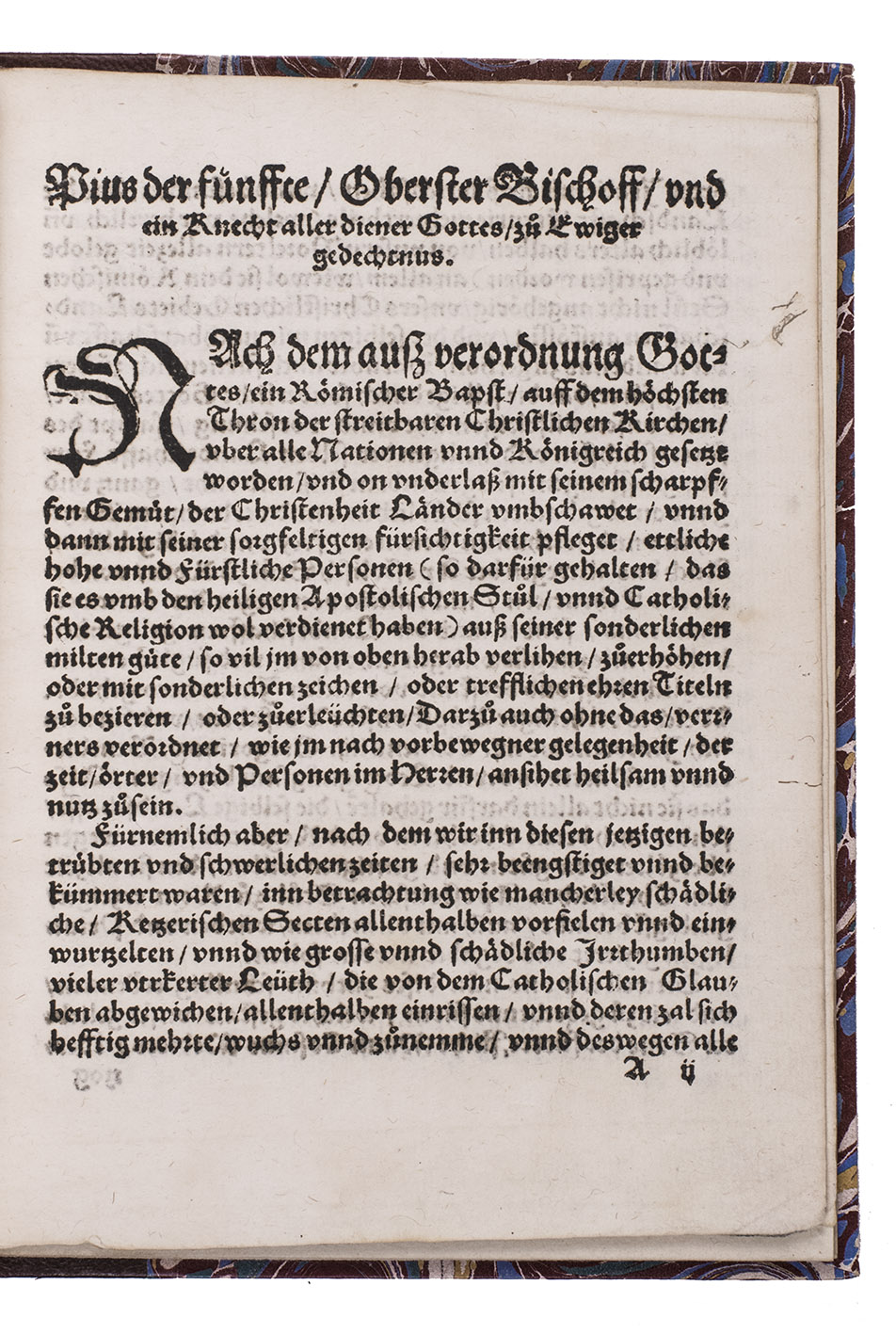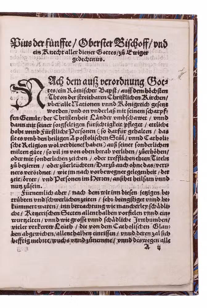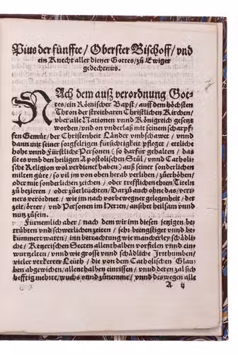 Rare German translation (one of two editions, both dated 1570) of Pope Pius V's Latin papal bull elevating Cosimo I de' Medici, already Duke of Florence, to become the first Grand Duke of Tuscany on 27 August 1569. A descendent of the founder of the great Medici banking family and of the Sforza Dukes of Milan, Cosimo I brought the Medici's to the pinnacle of power with his elevation to Grand Duke and remains famous for both his political ruthlessness and his patronage of the arts. The Herzog August Bibliothek attributes the other edition to the Heidelberg printer Johann Mayer, but the present edition was produced by a different printer.