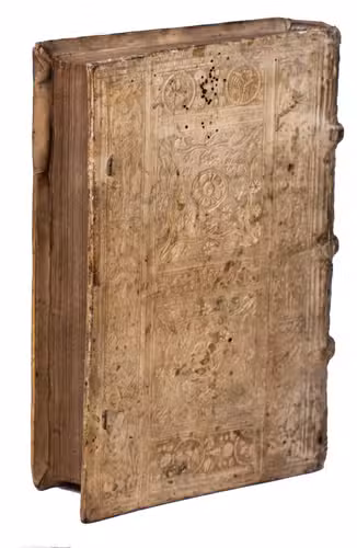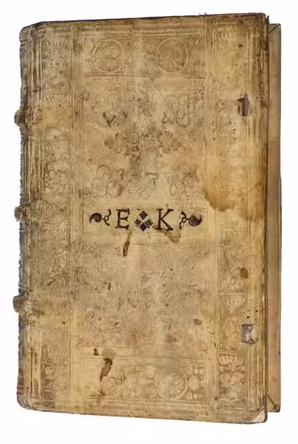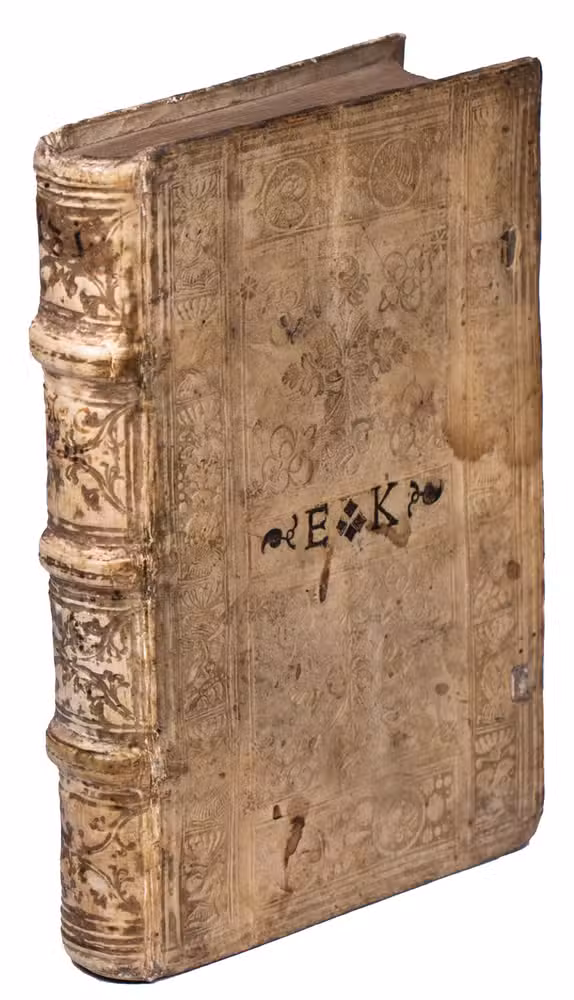 8vo. With several decorated woodcut initials. Contemporary blind tooled pigskin, sewn on 3 supports with the corresponding raised bands on the spine, both boards tooled in a panel design with floral motives in the 2 central panels, surrounded by a border with portraits on the front, and passion scenes and saints on the back, the manuscript initials "E.K" on the front, remnants of white leather closing ties. "494" [=496], [39], [1 blank] pp.