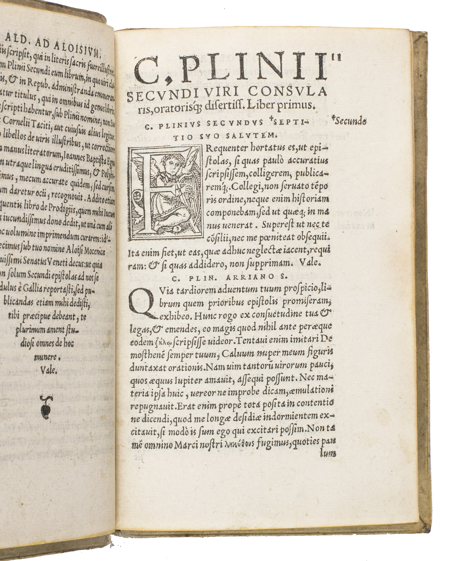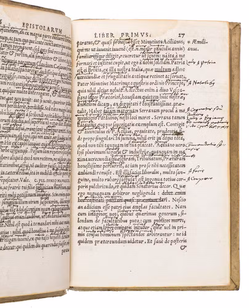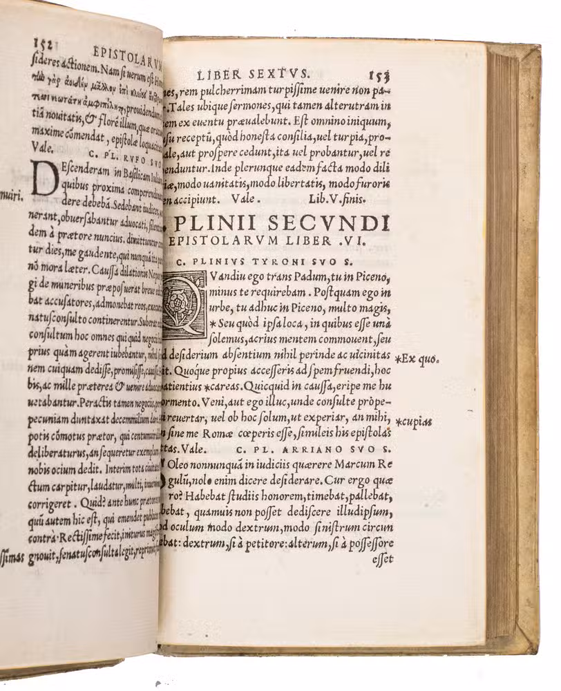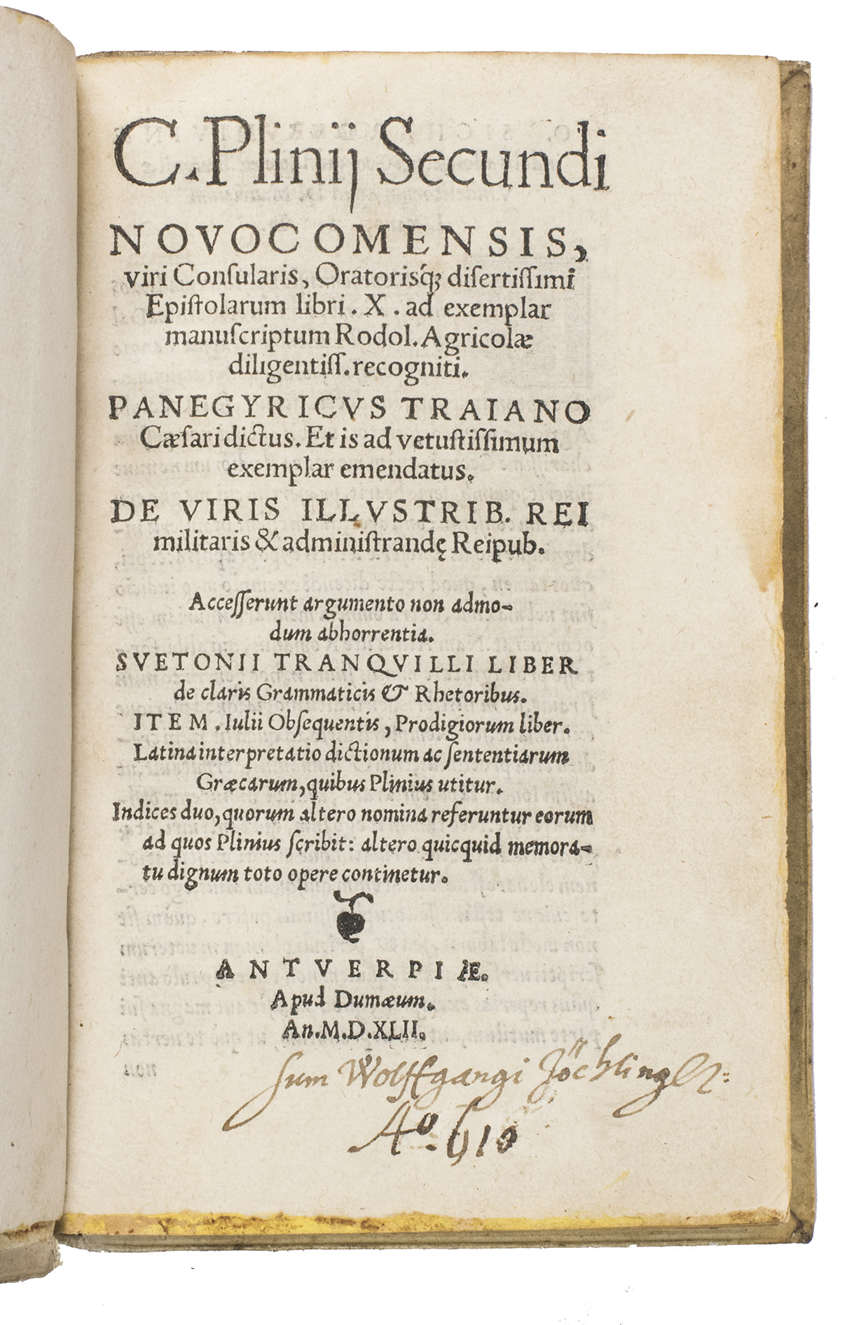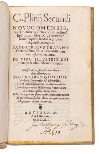 Rare early Antwerp edition of the Letters by Plinius Secundus, in a beautiful contemporary pigskin binding. This edition is virtually a reprint of the edition by Johannes Sichardt published in 1530 by Andreas Cratander at Basel. Sichardt (ca. 1499-1552) was since 1527 professor in Rhetoric in Basel. His dedicatory letter to Georgius Ilsungus (ca. 1510-1580), dated Augsburg, March 1530, is reprinted here also. Although the editio princeps of these famous letters was printed at Venice in 1471, all later editions, including the 1530 edition at Basel, are based on the Aldus edition of 1508 which added many new letters. Also the dedicatory letter by Aldus Manutius to Aloisius Mocenicus, a Venetian senator who had brought some manuscripts of the letters from France to Venice, is re-printed in our present edition.