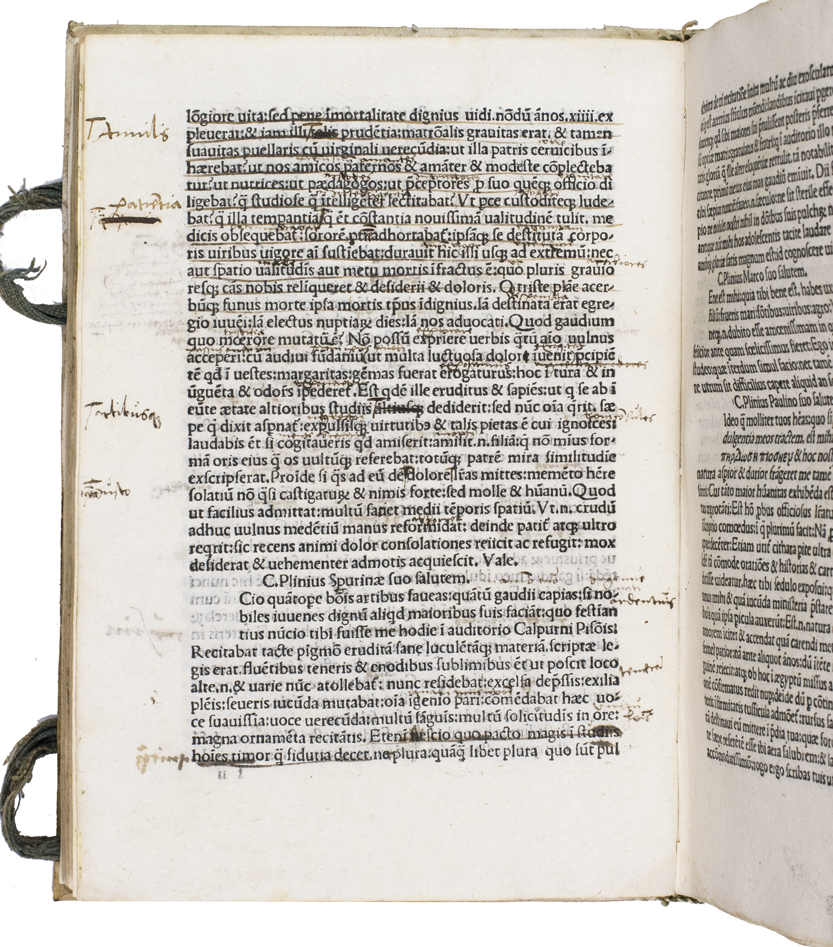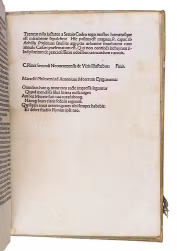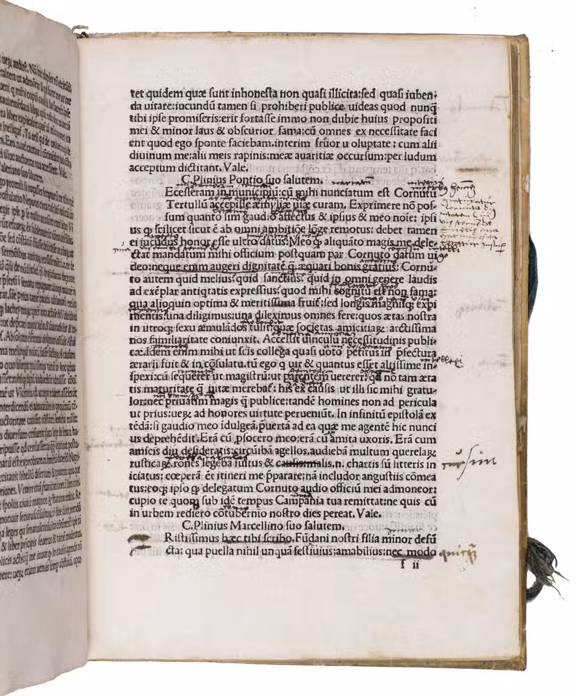 First Venetian edition of three distinct works historically attributed to Pliny the Younger (62-ca. 113 CE). The biggest part of the present work is comprised of Plinys celebrated letters, offering insight into Roman social, domestic, legal, and political life, which were composed between 97 and 112 CE. Books I-IX contain correspondence with friends, colleagues, and prominent figures, while Book X preserves official letters to Emperor Trajan, including queries regarding provincial administration and early Christian communities. Plinys letters are noted for their historical significance, famously including his account of the Vesuvius eruption in 79 CE and the death of his uncle, Pliny the Elder (ca. 23/24-79 CE).