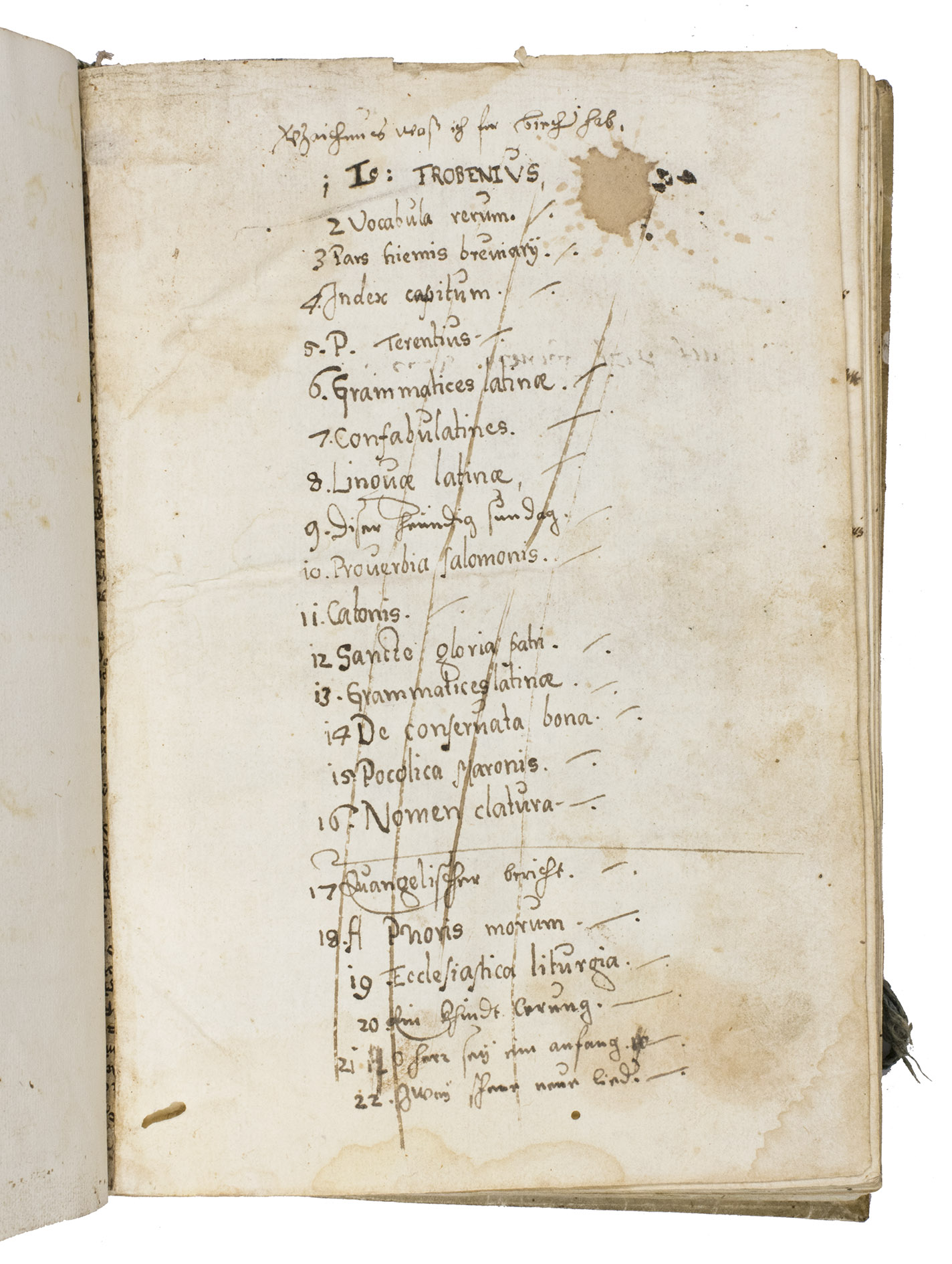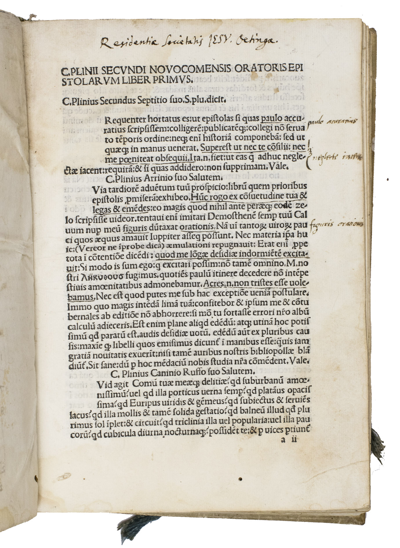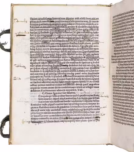 With a manuscript ownership inscription from the Jesuit Library of Oettingen in Bayern, Germany ("Residentia Societatis Iesu Oetingae") in the upper margin of the first printed leaf. The recto of the first blank leaf bears a manuscript list of 22 short book titles, (including, for example: "2. Vocabula rerum, 4. Index capitum, 5. P. Terentius, Grammatices latinae, 11. Catonis, 14. De conservata bona, 15. Pocolica Maronis"). A few early underlinings underlinings and marginal annotations are present throughout. With a small wormhole in the lower margin of the first few leaves (not affecting the text), and some occasional browning and staining throughout. Otherwise in good condition. Early European Books, fra-bnf-ars-00002907-001; Goff P 812; GW M34362; Hain 13117; Harper Cat 769; IDL 3737; ISTC ip00812000; Madsen 3320; Proctor 5129; USTC 991907; WorldCat 711964442.