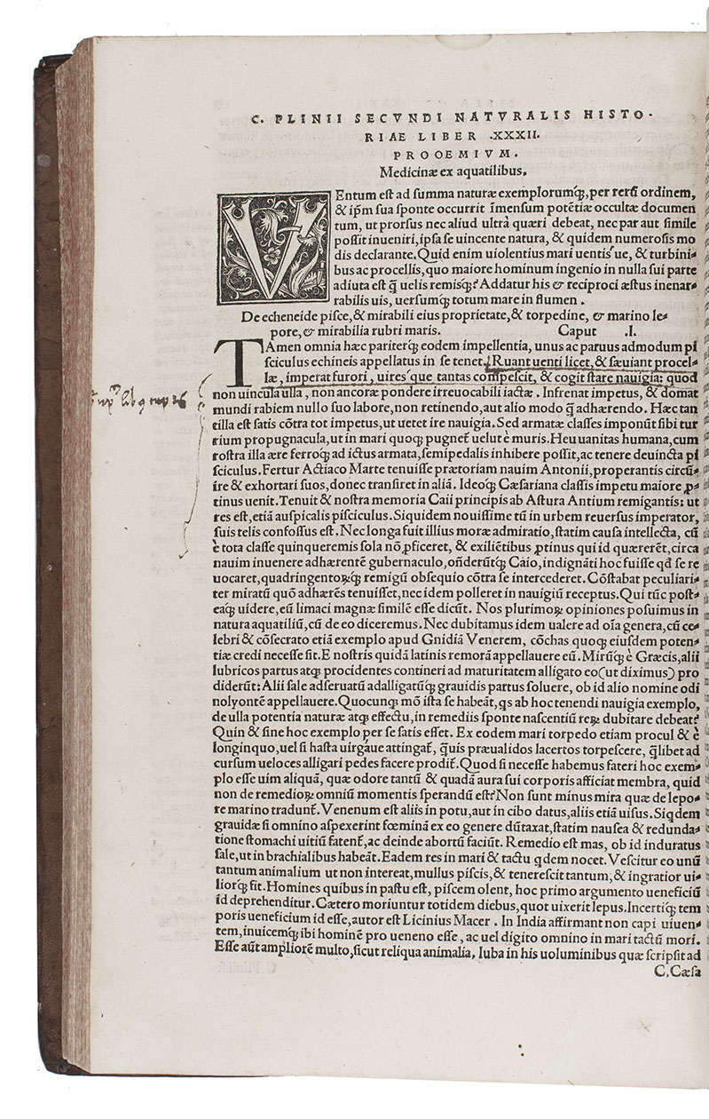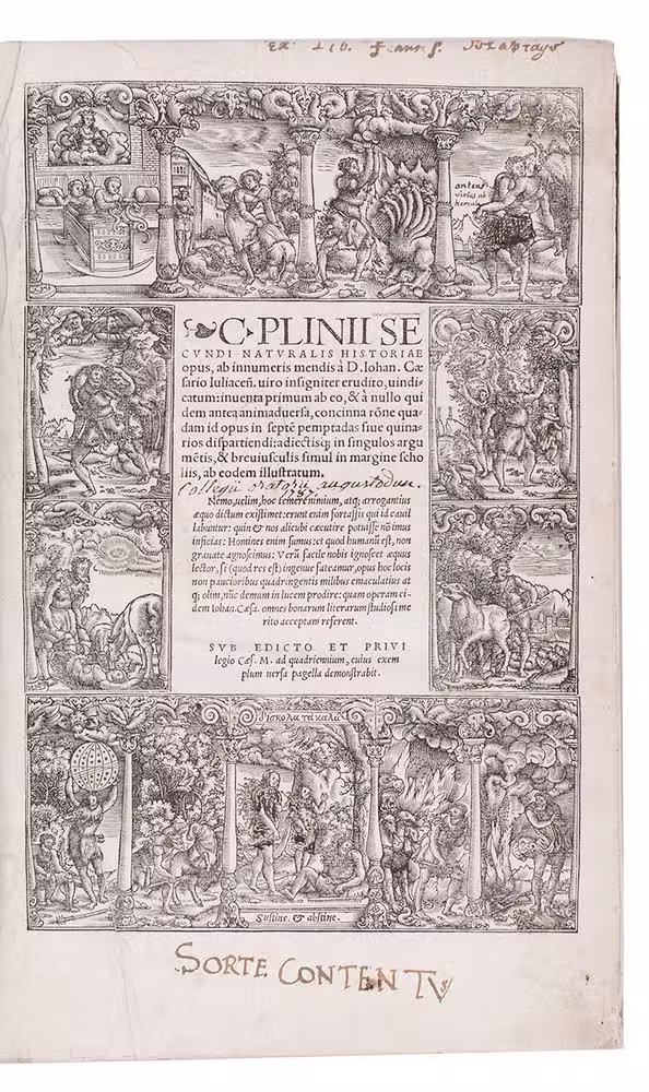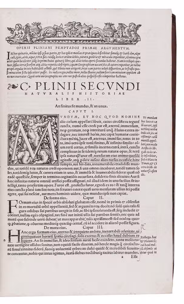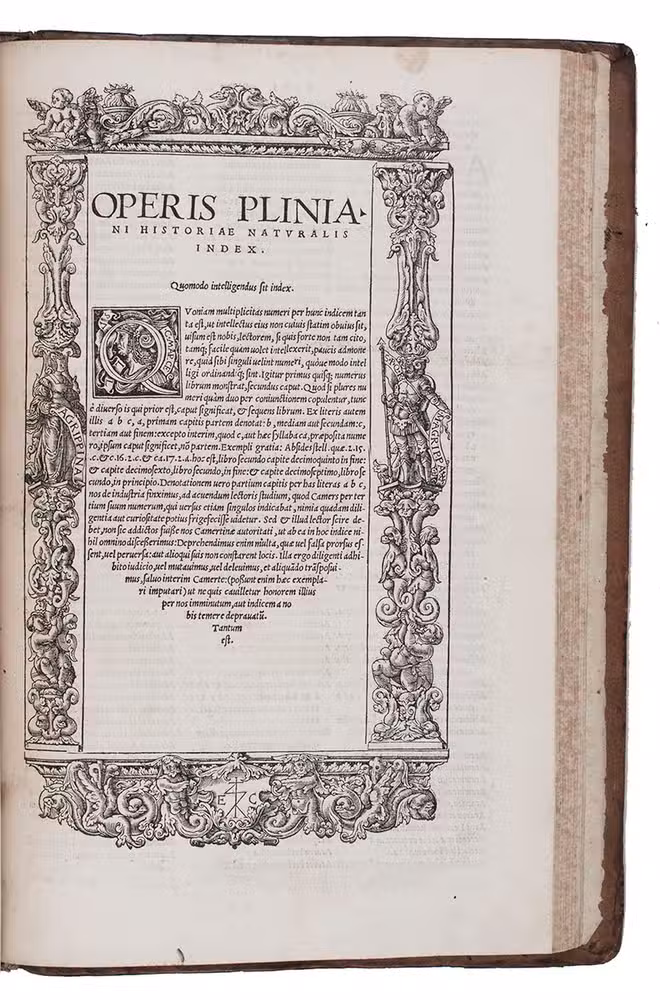 First edition of Plinys Natural history as edited by Johannes Caesarius (1468-1550), a humanist and close friend of Erasmus. Pliny's Natural history is one of the largest single works to have survived from the Roman Empire to the modern day and purports to cover the entire field of ancient knowledge, based on the best authorities available at the time. It encompasses the fields of botany, zoology, astronomy, geology and mineralogy as well as the exploitation of those resources. It remains a standard work for the Roman period and the advances in technology and understanding of natural phenomena at the time. Pliny's accounts of some technical advances are the only sources for those inventions, such as hushing (using water to wash away soil) in mining technology or the use of water mills for crushing or grinding grain. Archaeological excavations have confirmed much of what he wrote.