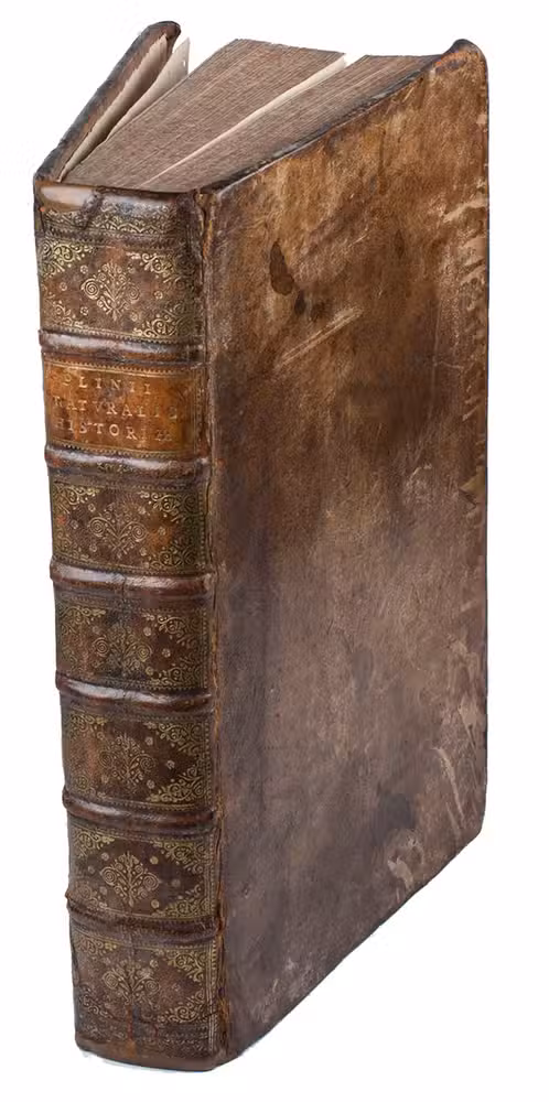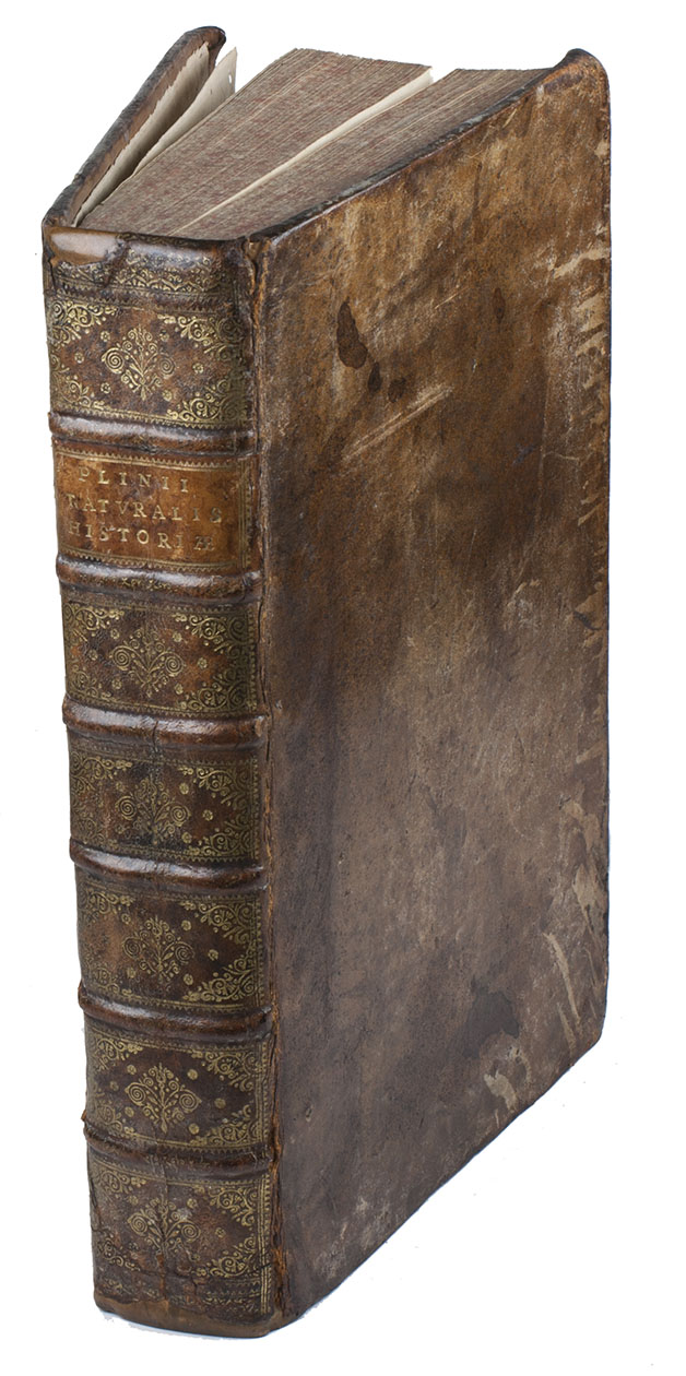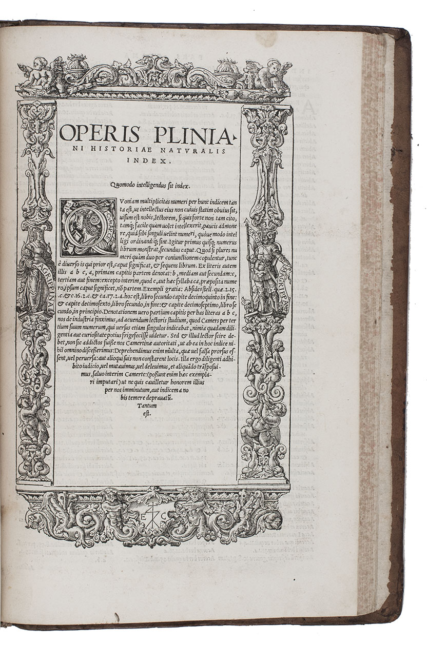 Naturalis historiae opus ... (Colophon: Cologne, Eucharius Cervicornus, 1524). Folio. With both the title page and part-title in a decorated woodcut border in four pieces, further with decorated woodcut initials, and woodcut head- and tailpieces. Late 16th of early 17th-century gold tooled calf, with a red morocco title label on the spine, lettered in gold. [16], 311, [60] ll.