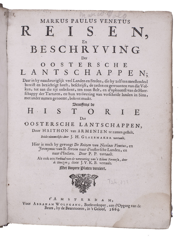 Ad 1: First Dutch edition, translated apparently from a French edition, but supplemented with additional text and notes from other sources, of Marco Polo's account of his voyages from Venice to China and back, and of his numerous voyages within China and elsewhere in Asia, dictated by him in 1298. Polo's account of his voyages remains one of the earliest and most important Western records of Asian history, peoples and culture and for many years remained the primary source for most Europeans' knowledge of the orient. It also records information about 13th-century Asia that has not survived in any other source.