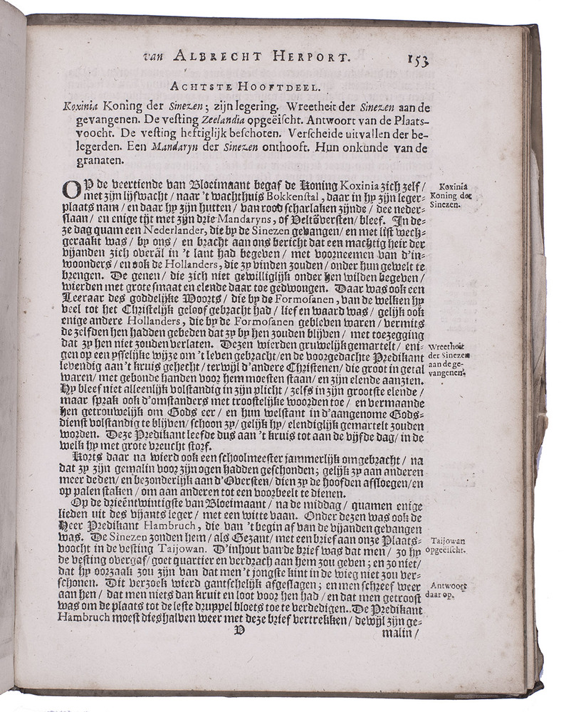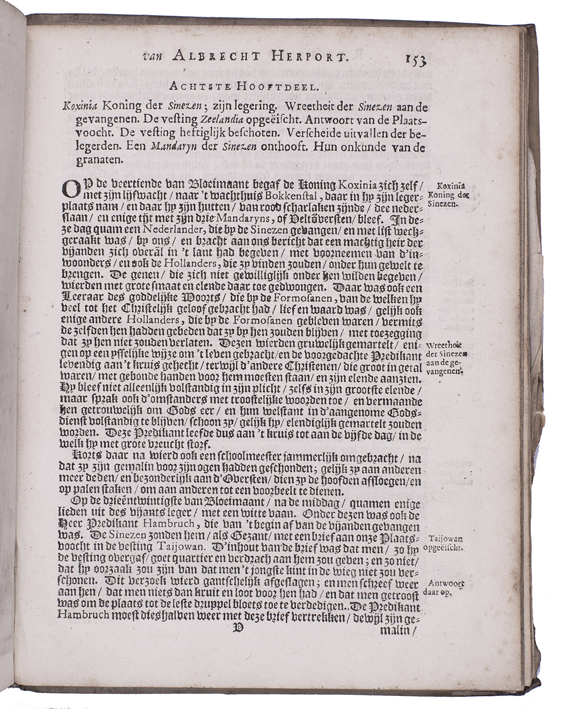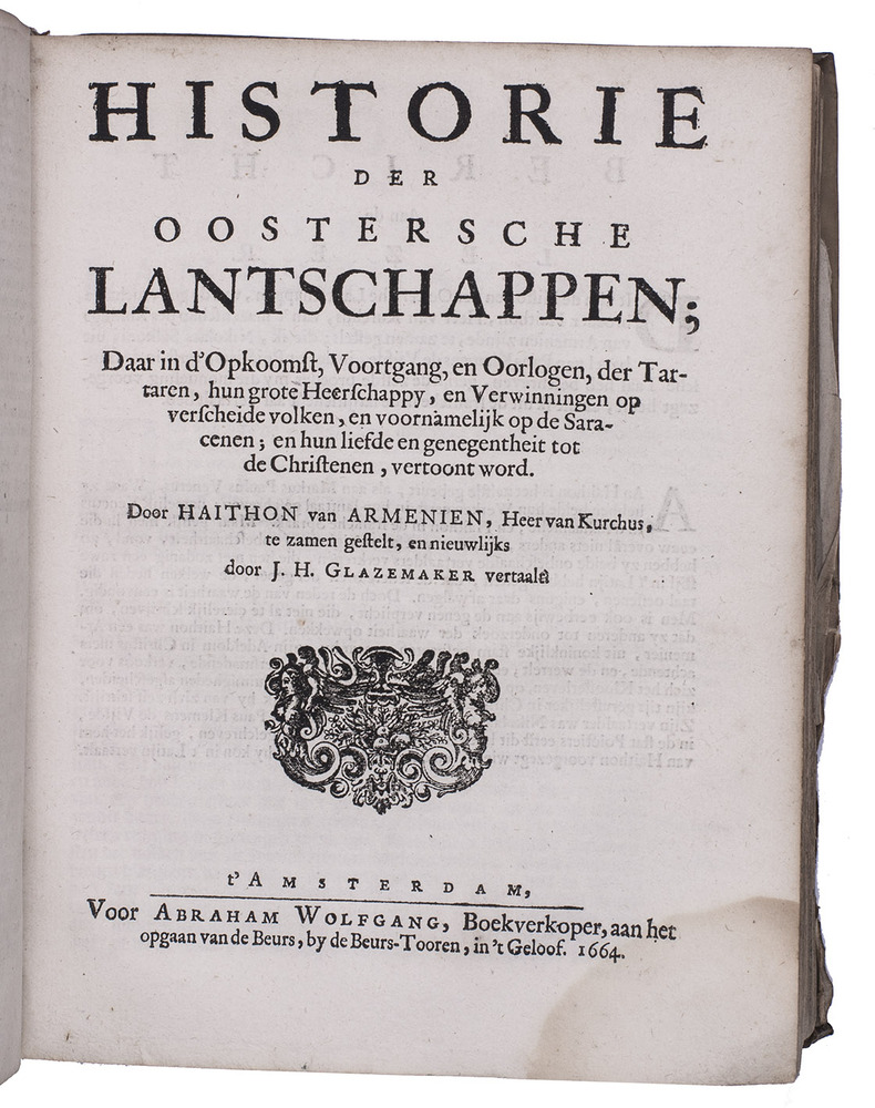 The present edition adds three further accounts of Far Eastern lands and peoples, all in their first Dutch editions. The first is that of Hetoum of Corycus (ca. 1240-ca. 1315). The second additional text is the humanist Poggio Bracciolini's account of the travels of the Italian merchant Niccolò de' Conti (ca. 1395-ca. 1469) from Venice via Syria, where he learned Arabic, Bagdad, around the Arabian peninsula to the Gulf and Iran, where he learned Persian, to India, the East Indies, Southeast Asia, possibly southern China and back in the years 1419-1444. His linguistic skills make his testimony especially valuable. Finally, a 12-page appendix, gives what appears to be the first eye-witness account of the capture of the Dutch-controlled island of Formosa (Taiwan) by the Chinese pirate Zheng Chenggong (1624-1662) in 1661/62. It also gives information on the VOC's trade, taxation and relations with Chinese colonists and indigenous "wilden" (wild men).