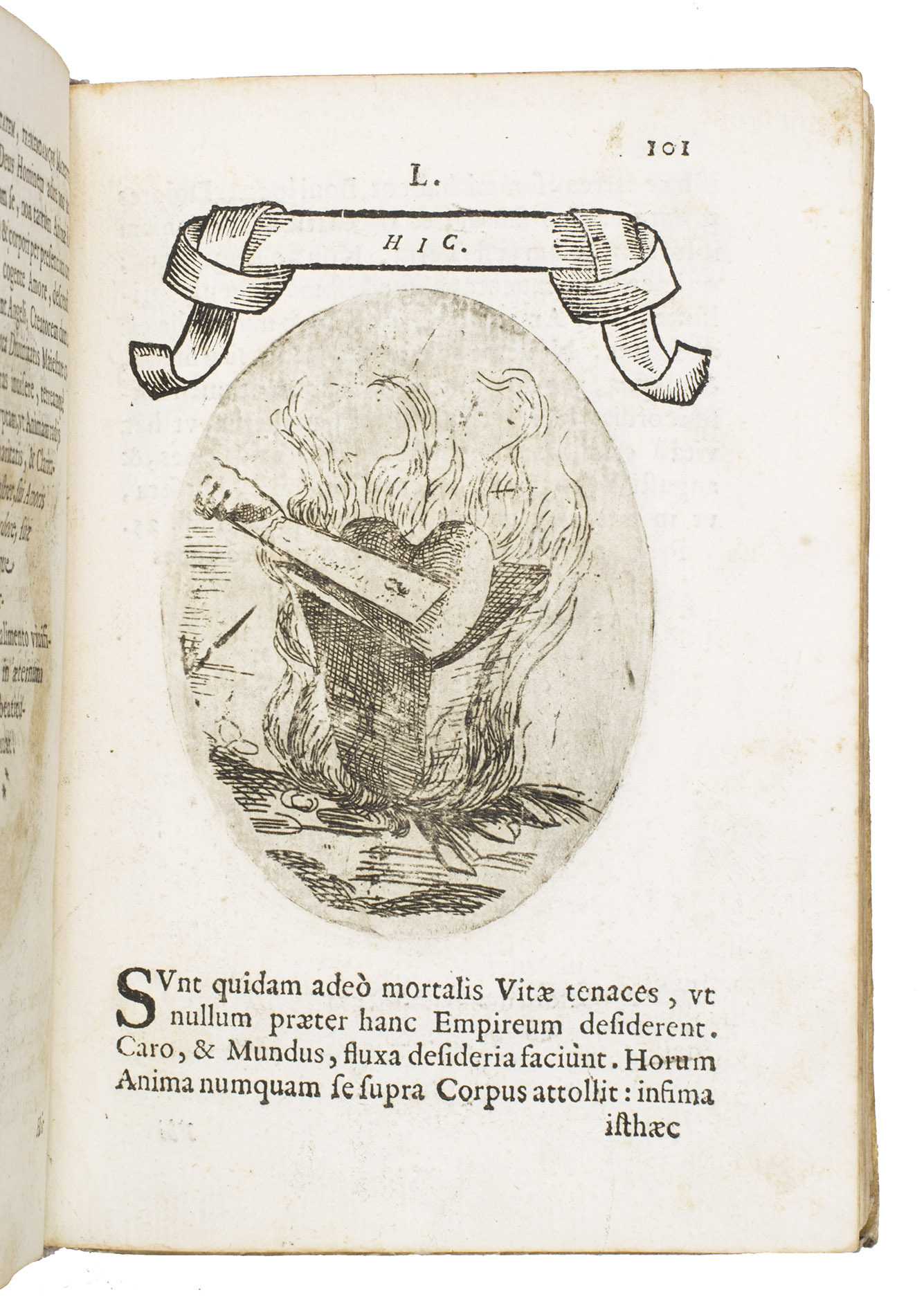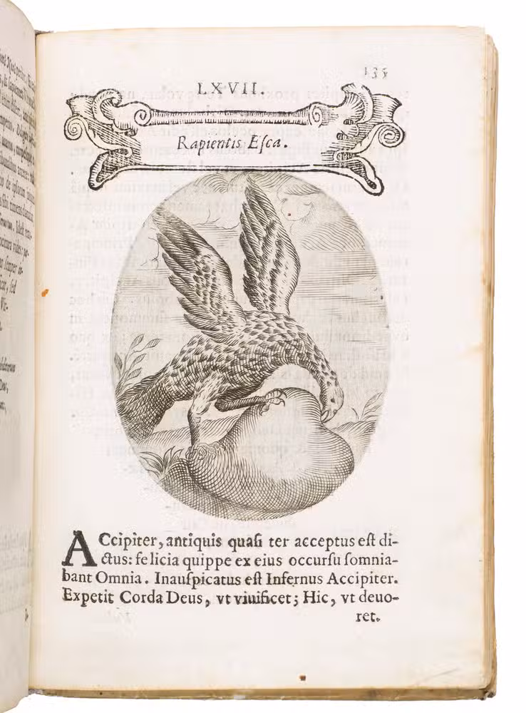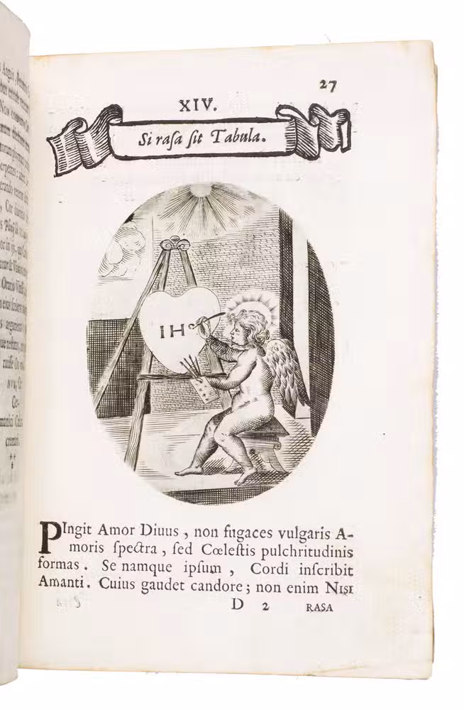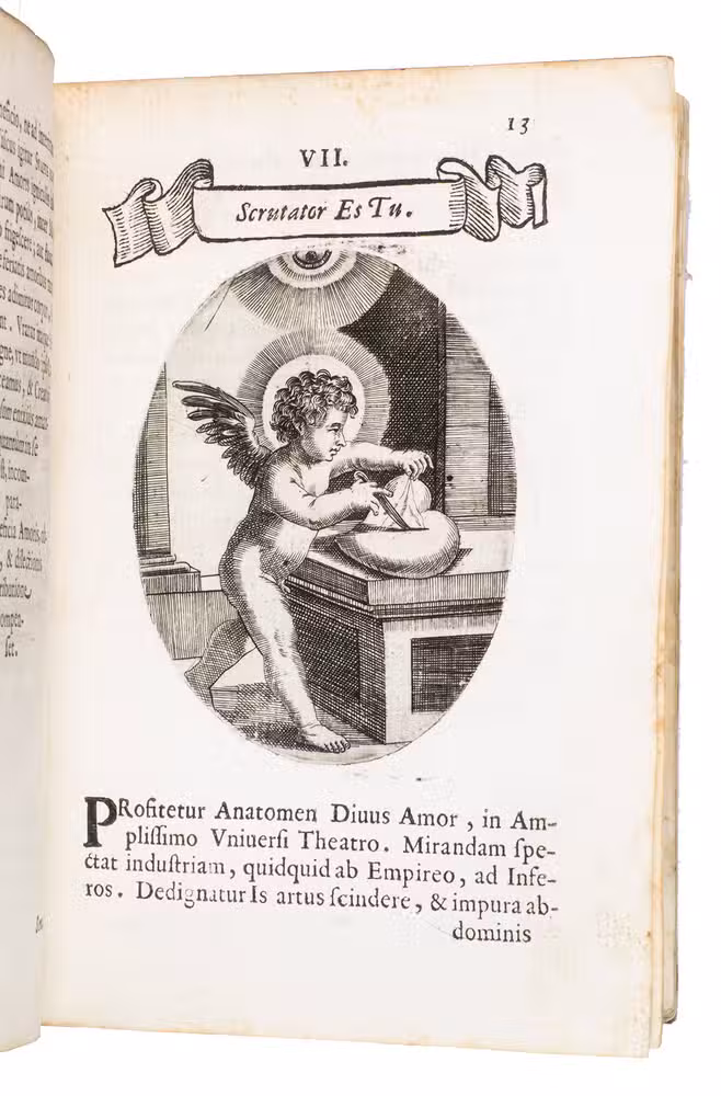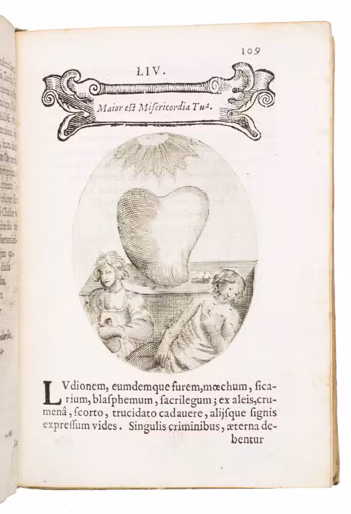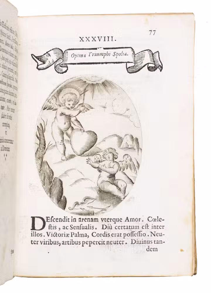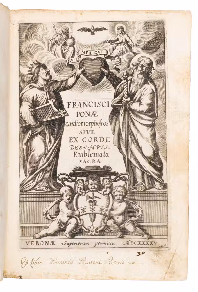 Verona, superiorum permissu, 1645. 4to. With engraved allegorical title-page (signed ''G.G.'' below right) showing King David and Saint Paul holding a heart, with the arms of the dedicatee, Cardinal Jules Mazarin, at the foot, 101 engraved emblems in text, each on the theme of the heart, with a letterpress title in any of about 7 different woodcut panels, and a letterpress explanation below, continuing onto the verso. Each is printed from an oval plate (10.5 x 8 cm). Contemporary sheepskin parchment. [8], 208 pp.