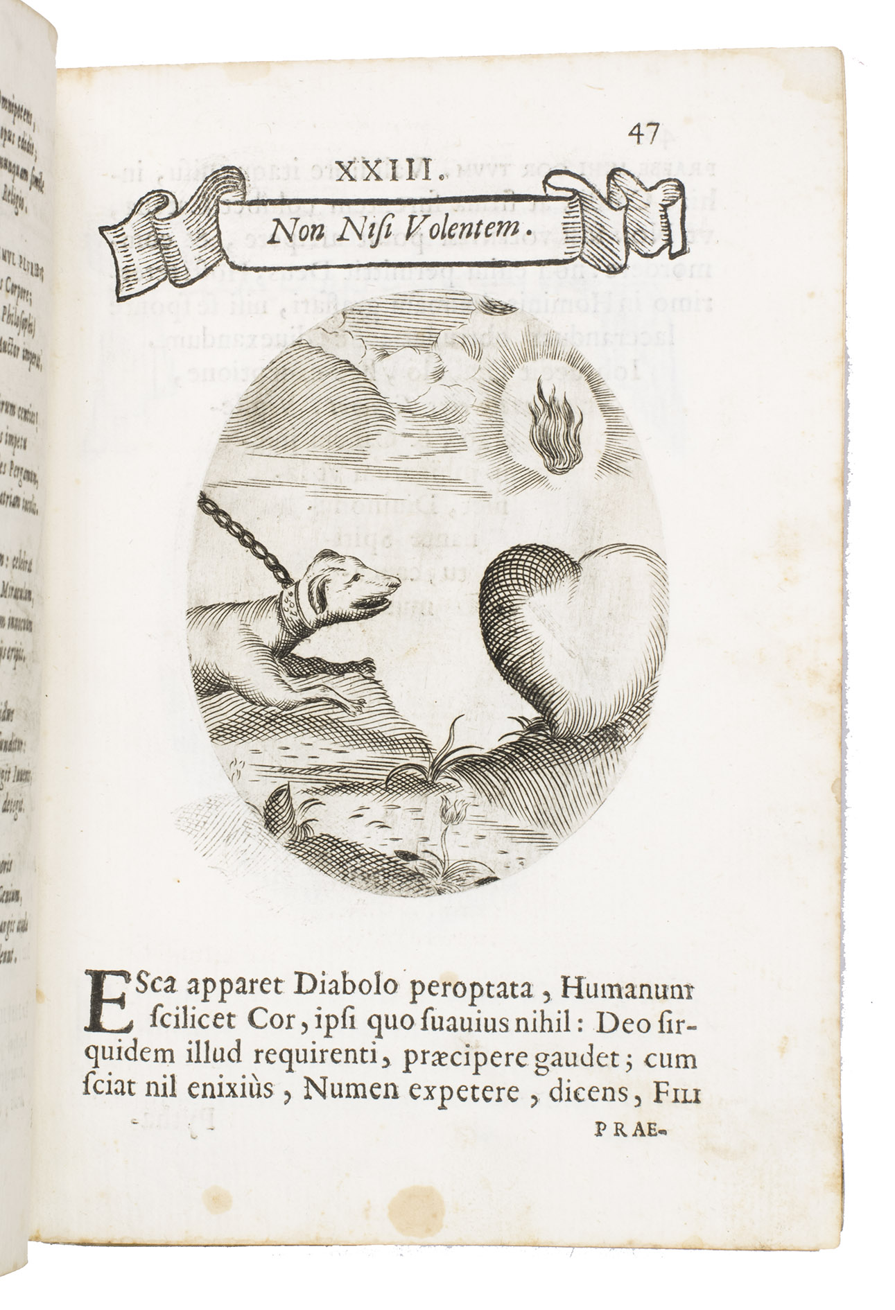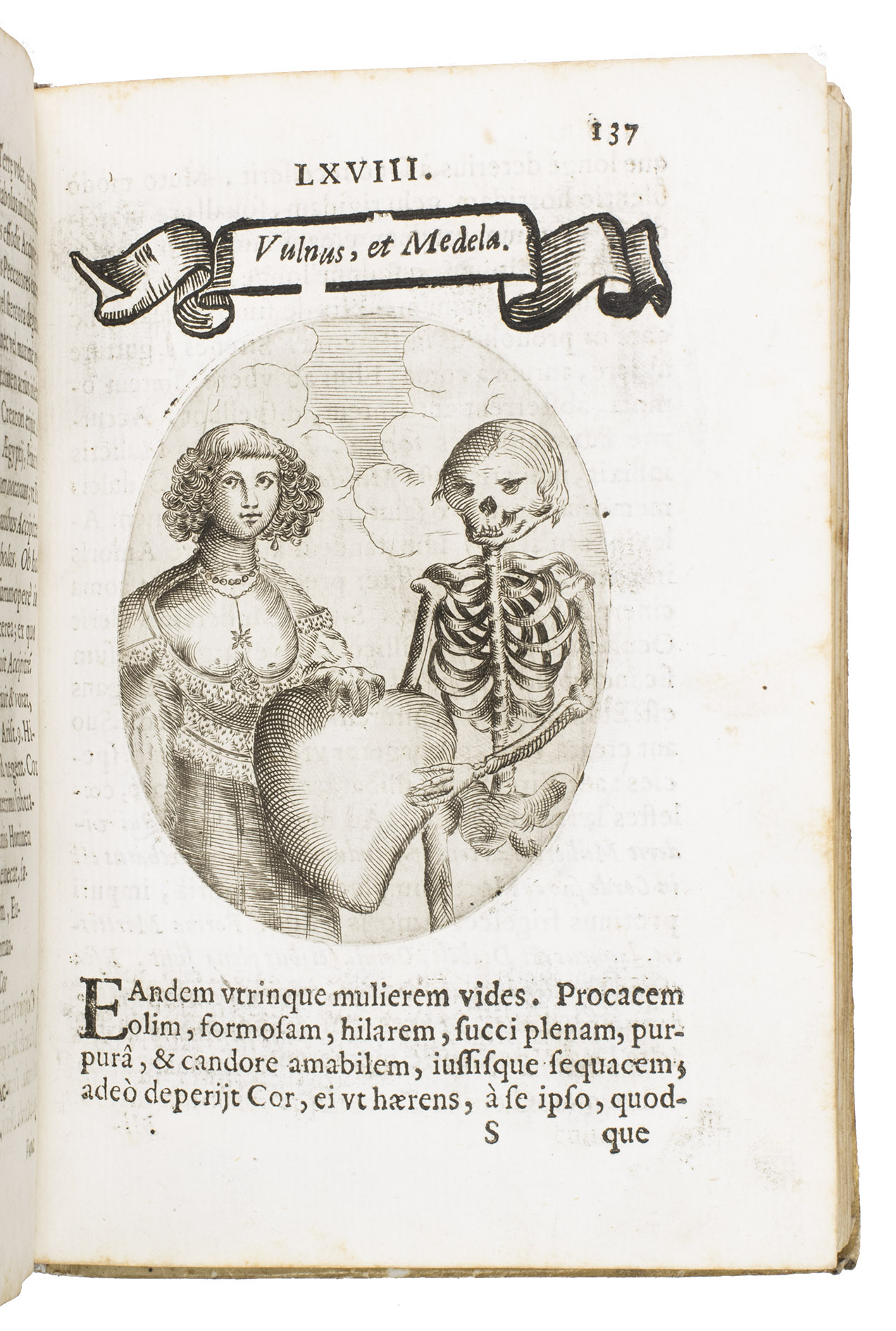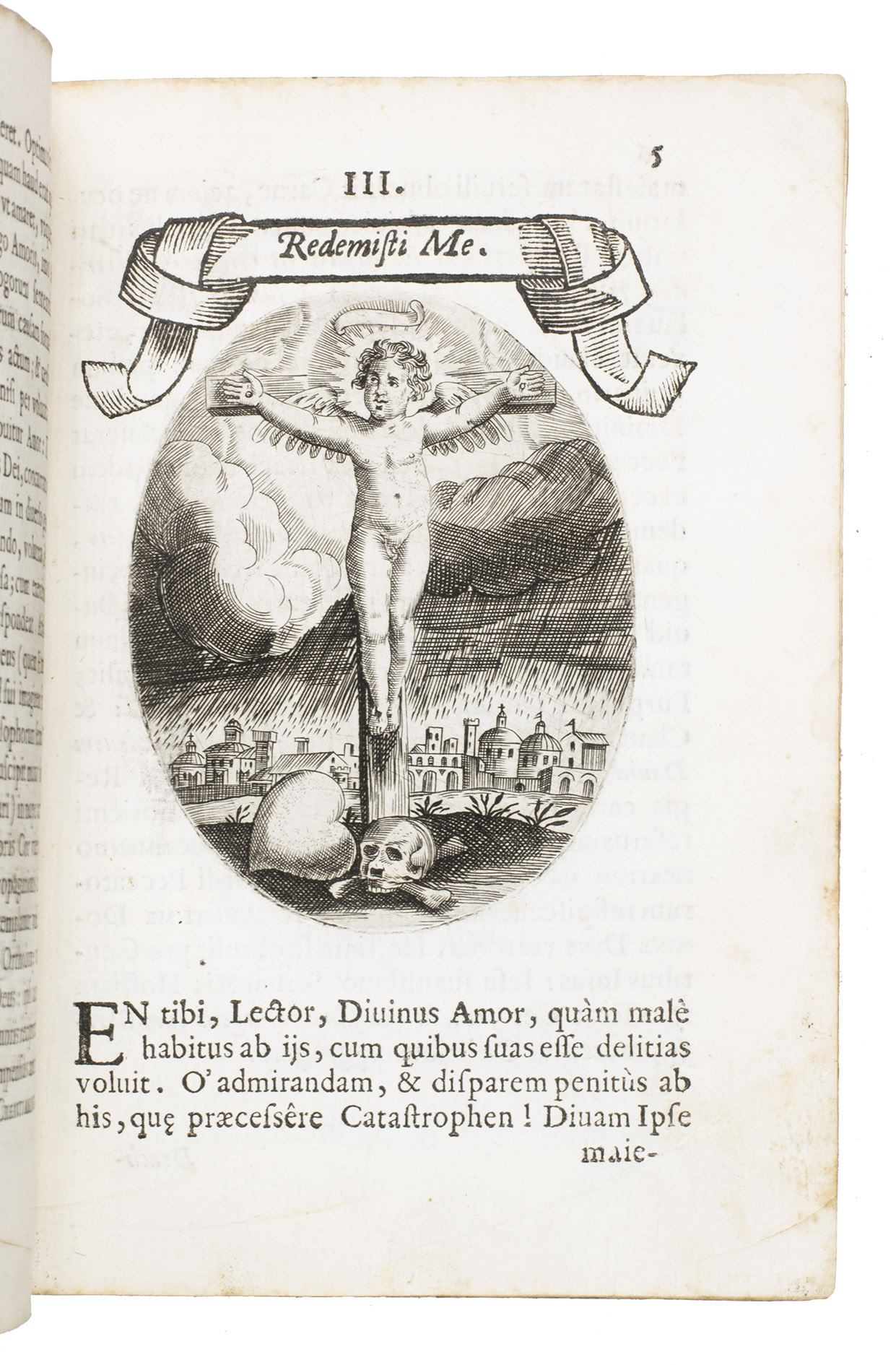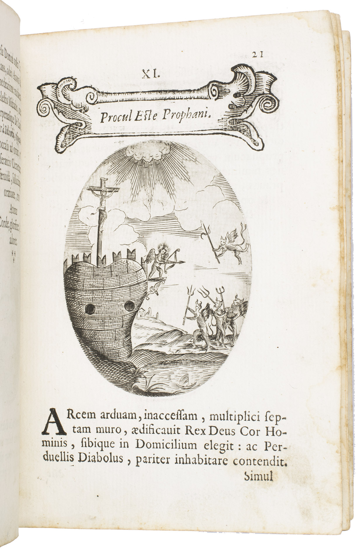 Verona, superiorum permissu, 1645. 4to. With engraved allegorical title-page (signed ''G.G.'' below right) showing King David and Saint Paul holding a heart, with the arms of the dedicatee, Cardinal Jules Mazarin, at the foot, 101 engraved emblems in text, each on the theme of the heart, with a letterpress title in any of about 7 different woodcut panels, and a letterpress explanation below, continuing onto the verso. Each is printed from an oval plate (10.5 x 8 cm). Contemporary sheepskin parchment. [8], 208 pp.