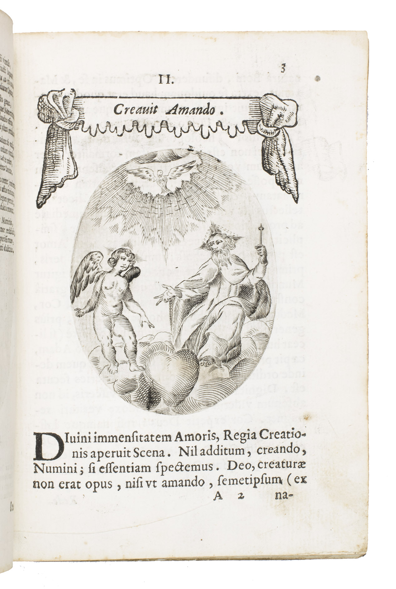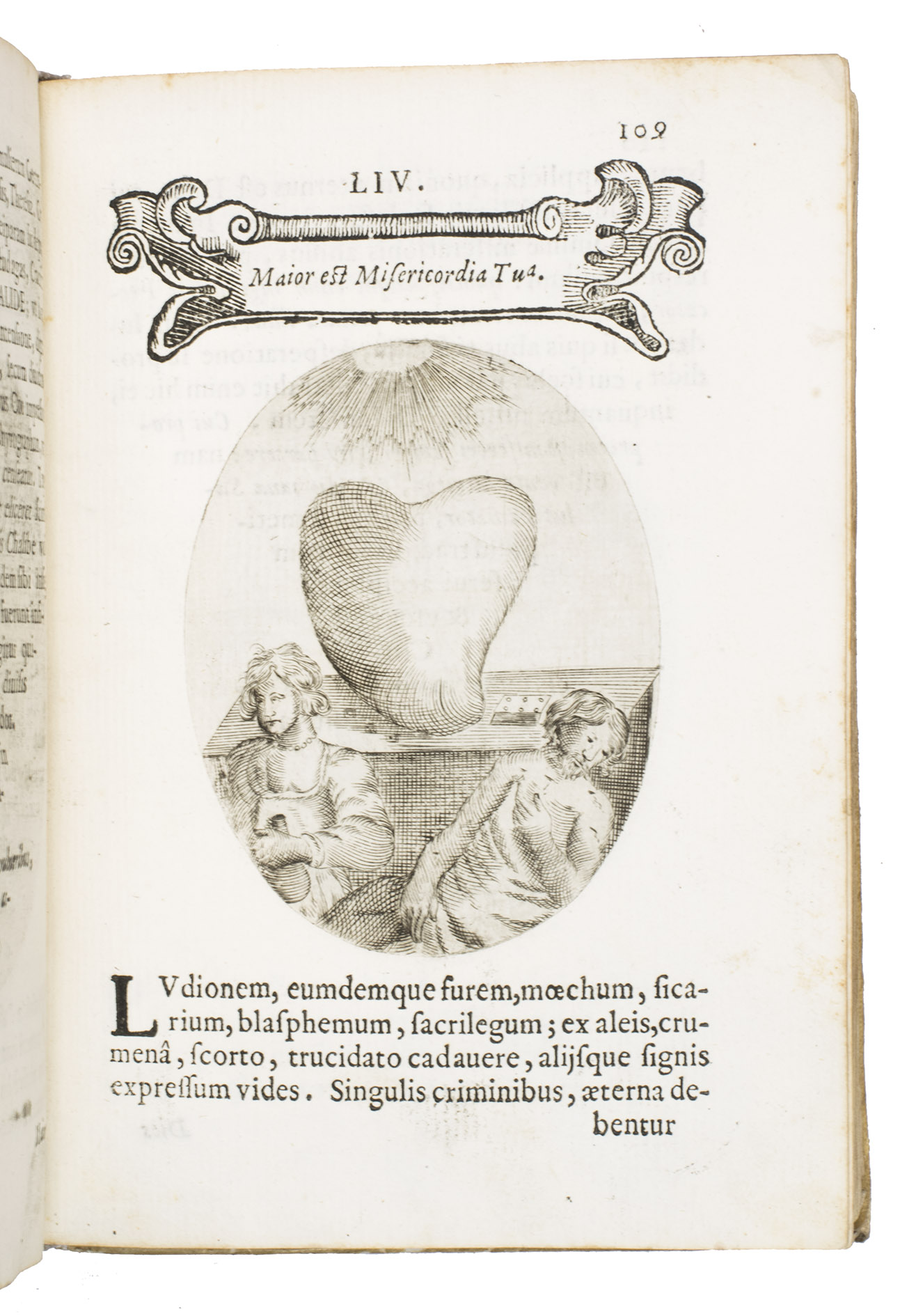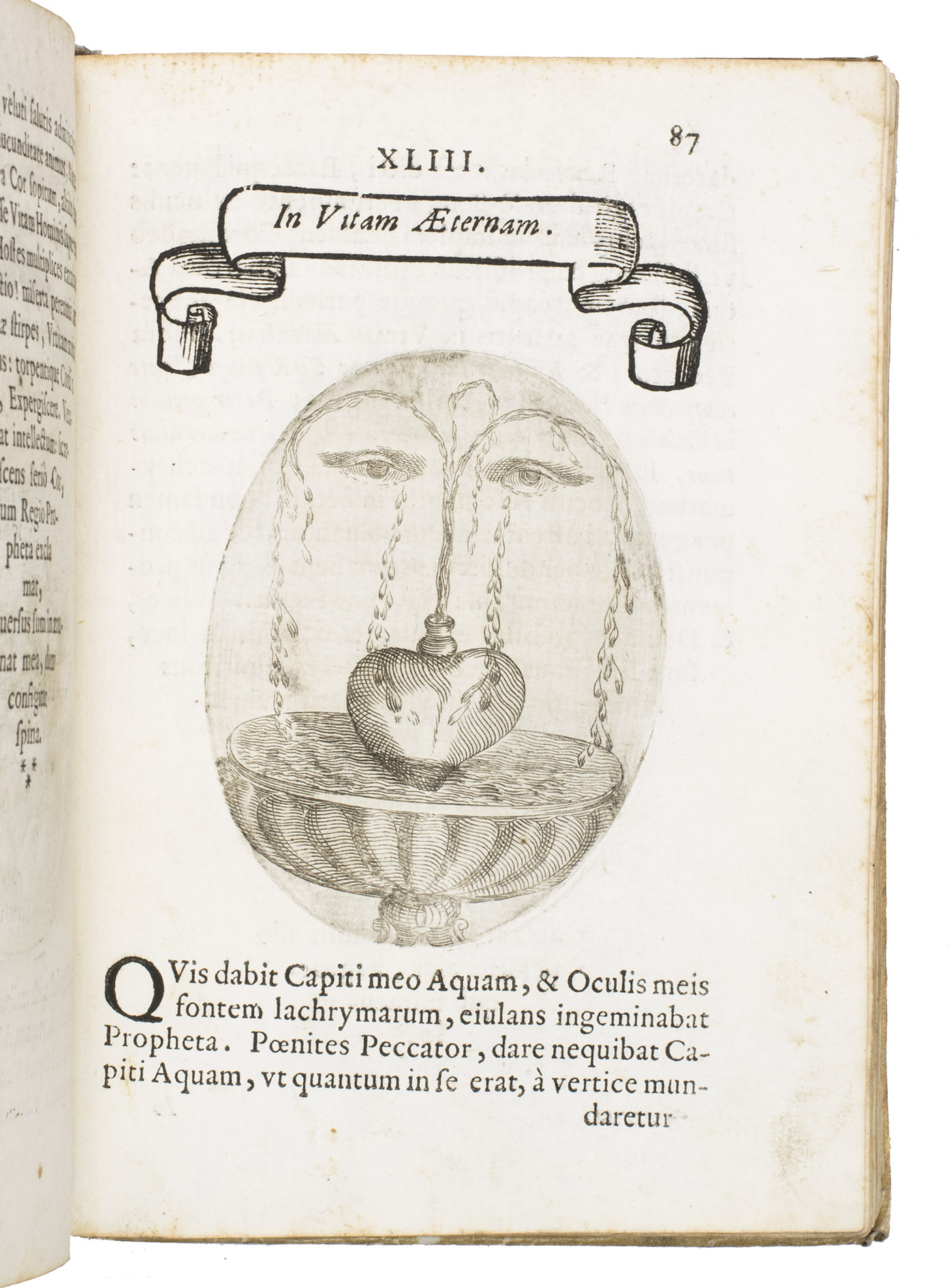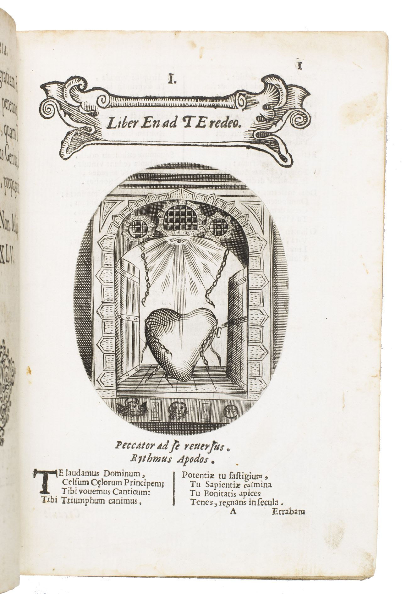 Verona, superiorum permissu, 1645. 4to. With engraved allegorical title-page (signed ''G.G.'' below right) showing King David and Saint Paul holding a heart, with the arms of the dedicatee, Cardinal Jules Mazarin, at the foot, 101 engraved emblems in text, each on the theme of the heart, with a letterpress title in any of about 7 different woodcut panels, and a letterpress explanation below, continuing onto the verso. Each is printed from an oval plate (10.5 x 8 cm). Contemporary sheepskin parchment. [8], 208 pp.