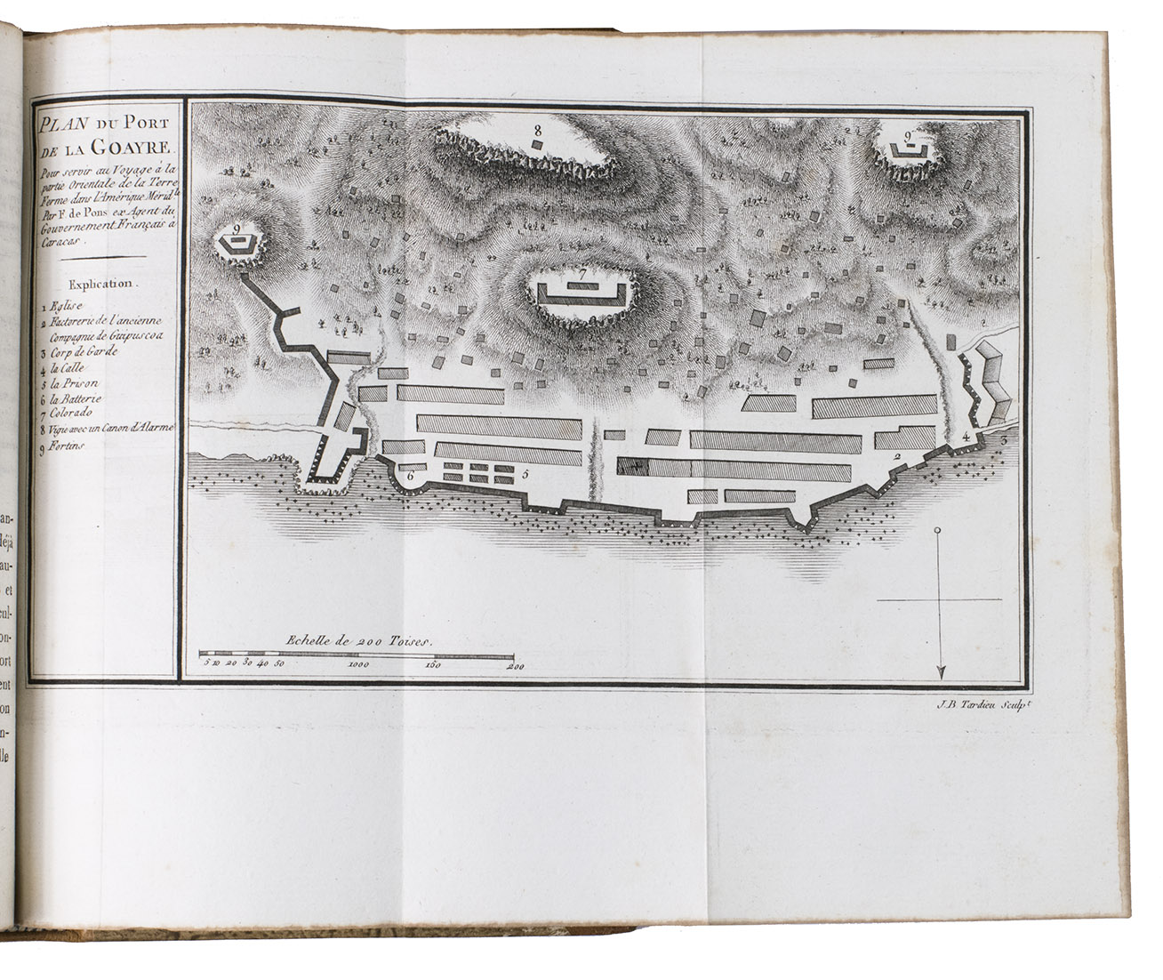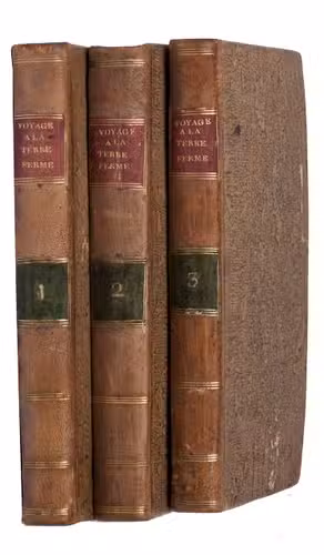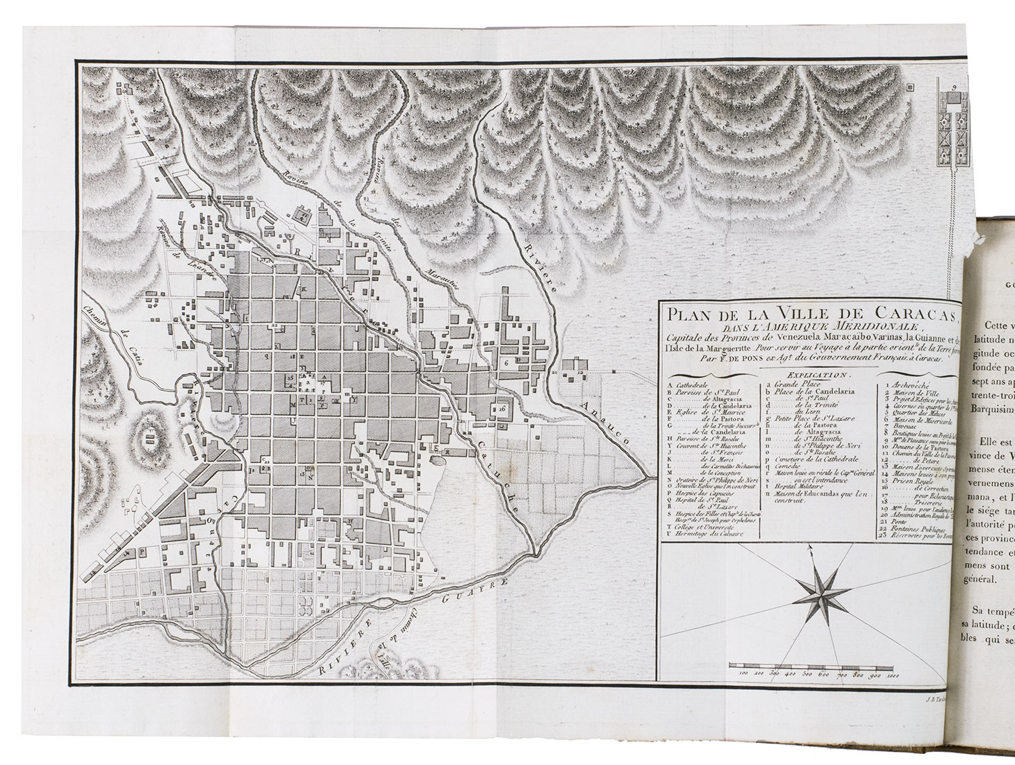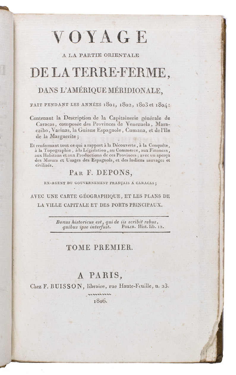 First edition of an extensive description of a voyage to "terra firma", referring to Spain's possessions surrounding the Caribbean Sea (here Venezuela in particular), written by François Raymond Joseph de Pons (1751-1812), archivist of the French Navy. It starts with a history of the region starting at its first discovery and following (missionary) voyages and conquest of the lands. Other chapters deal with the geology and geography of the region, the inhabitants and their customs and culture, trade, commerce, slavery, resources, agriculture, warfare, religion, etc.