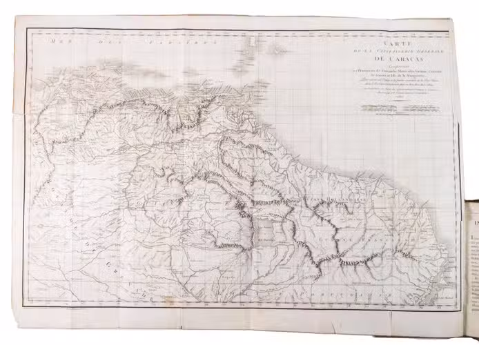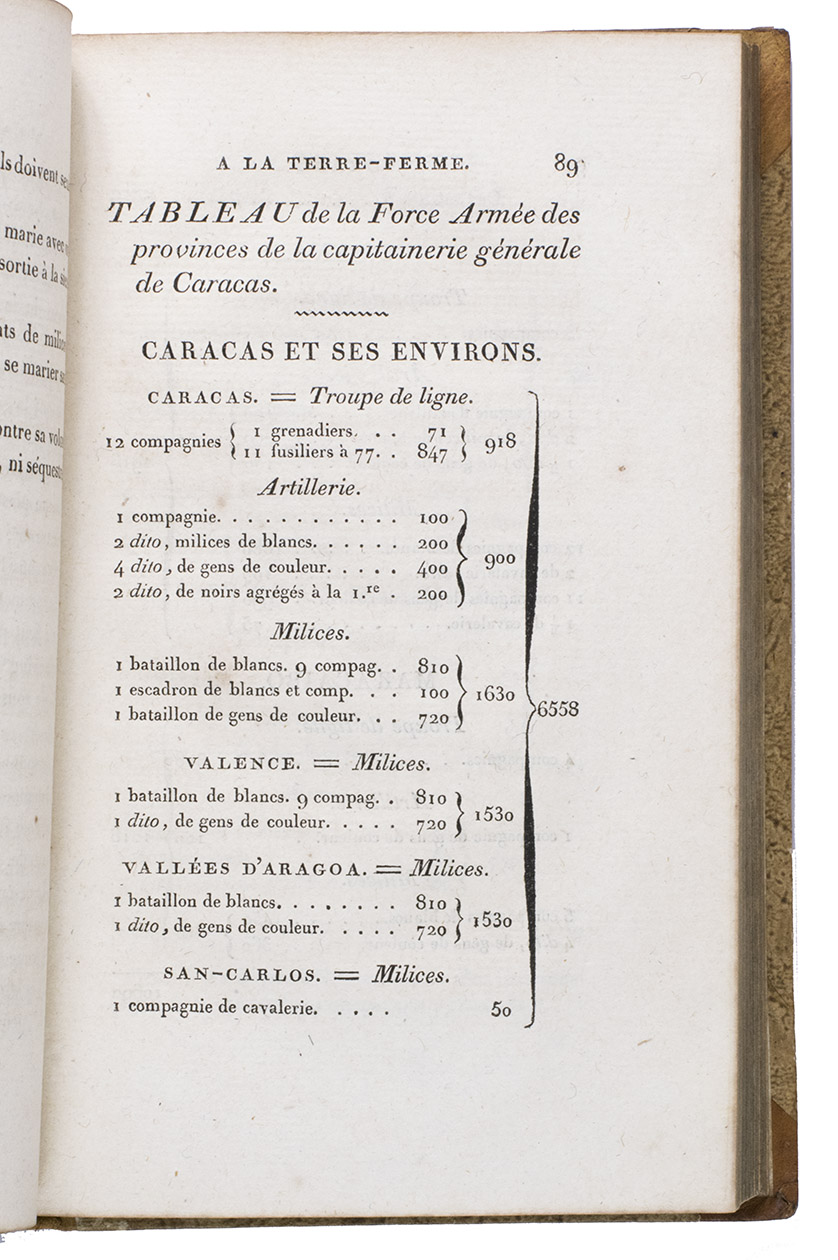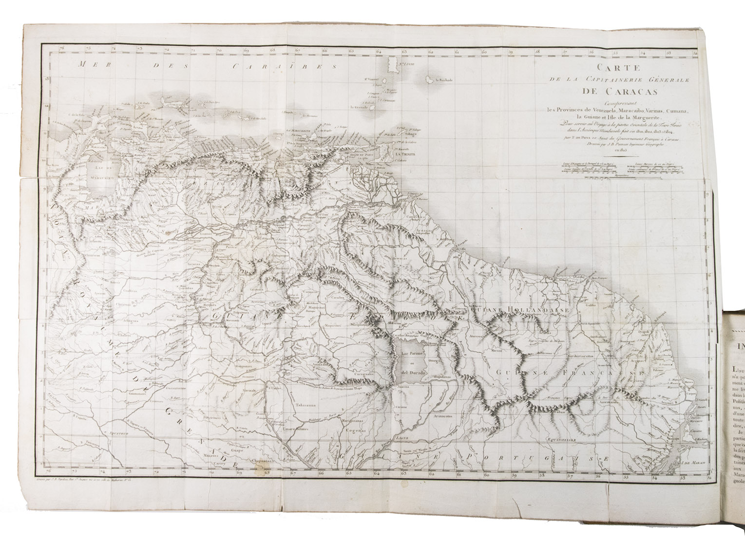 Paris, F. Buisson (back of half-title: Imprimerie de Fain et compagnie), 1806. 3 volumes. 8vo. With 4 folding engraved maps, including a large map of Caracas and surroundings and 3 smaller showing groundplans of Caracas, Puerto Cabello and La Guaira. All engraved by J.B. Tardieu. Contemporary half calf. [4], 358; [4], 469; [4], 362 pp.