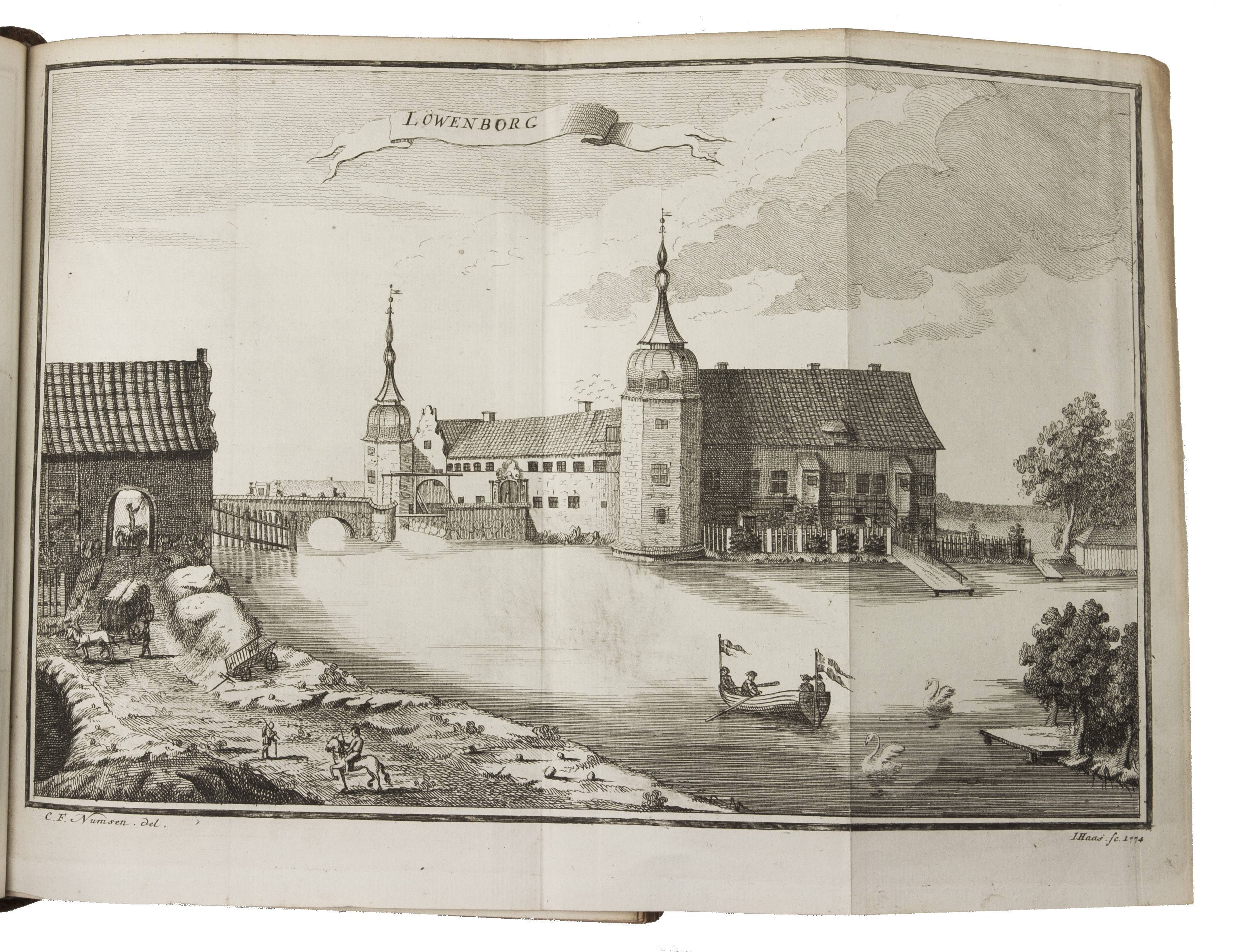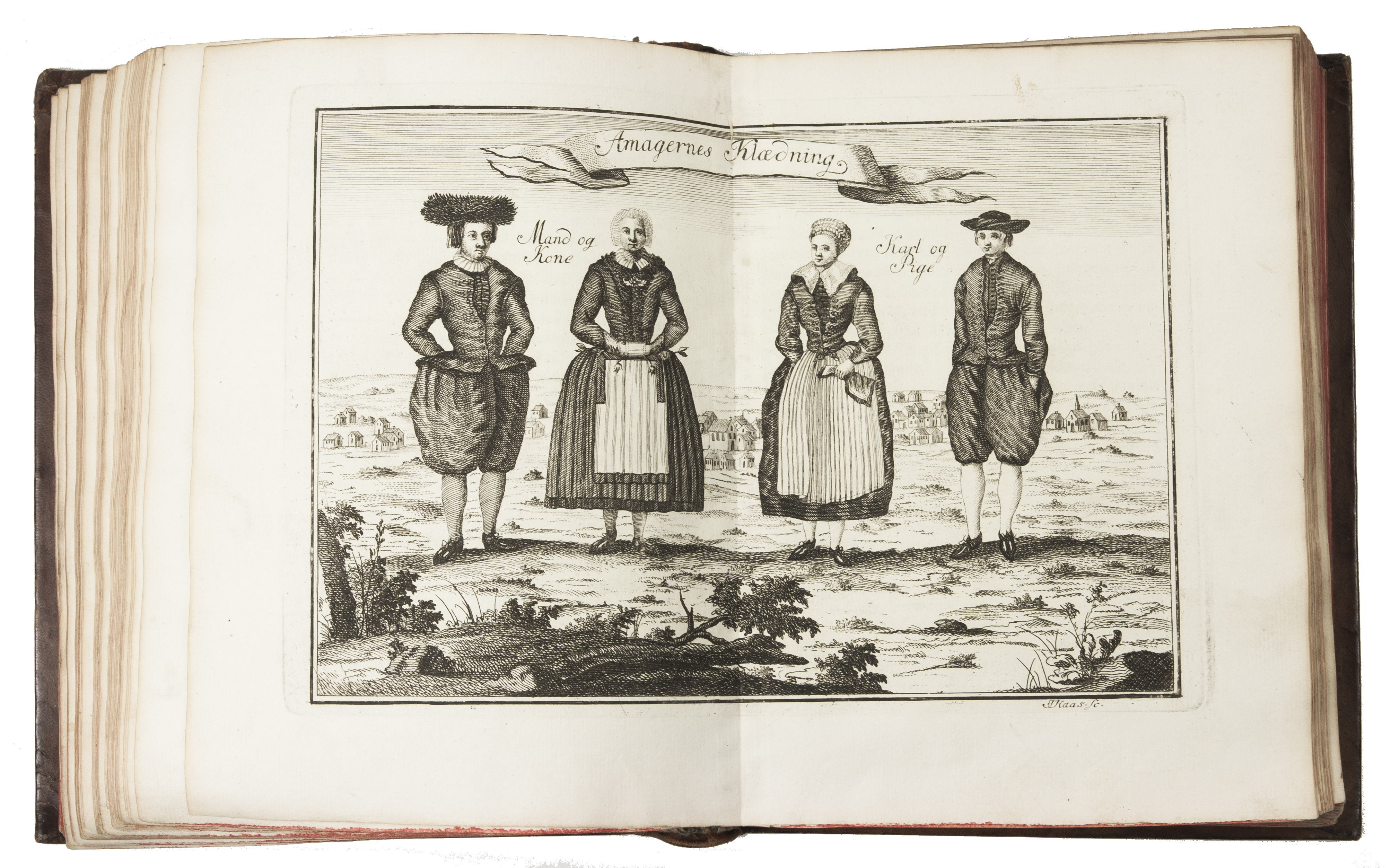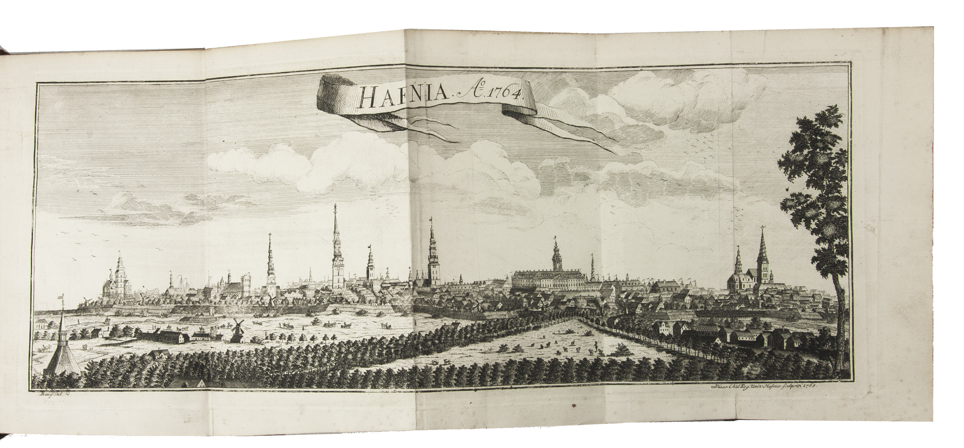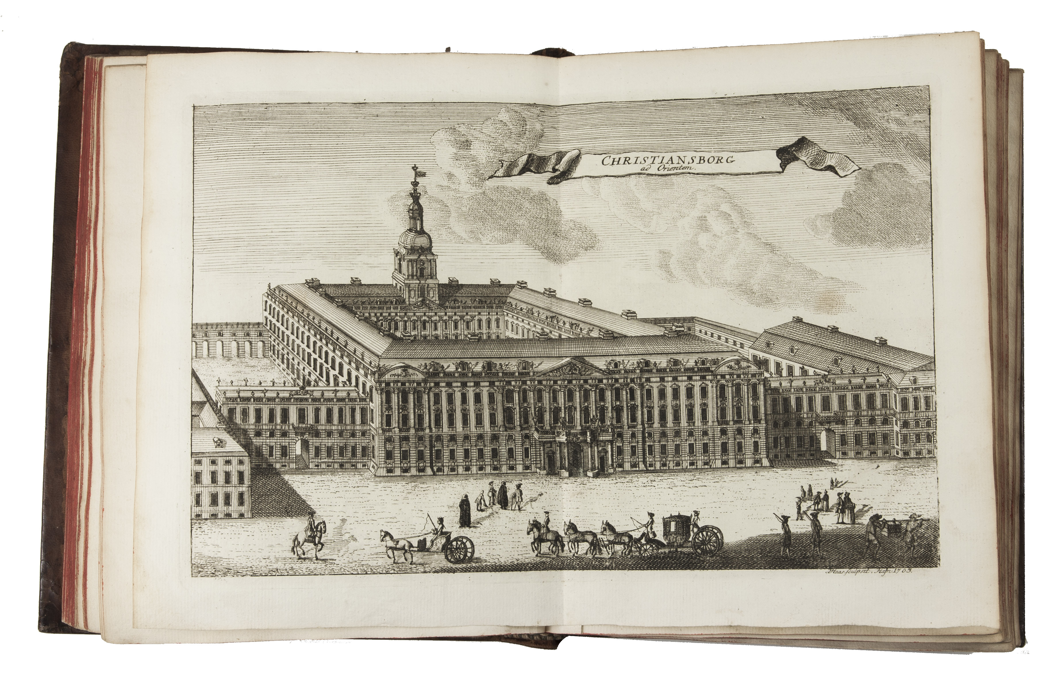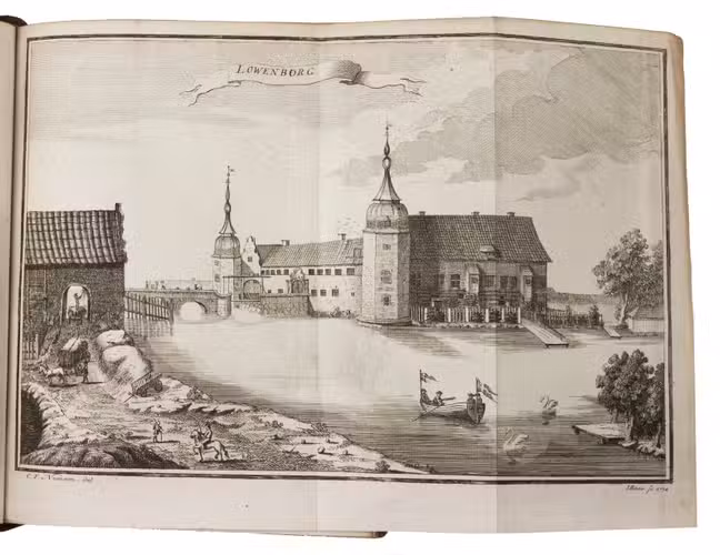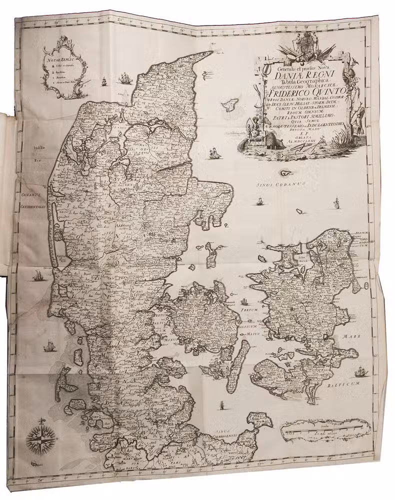 Copenhagen, Andreas Hartvig Godiche, Royal University Printer (vols. I-V) and heirs (vols. VI-VII), 1763-1781. 7 volumes. 4to. With 296 mostly folding engraved maps, plans and views of Denmark and Danish cities, castles, houses and gardens, including engraved plates showing Danish antiquarian relics, plants, animals and costumes. Contemporary uniform calf, richly gold-tooled spines. 723 to 1104 pp. per volume, giving more than 6000 pp. in total.