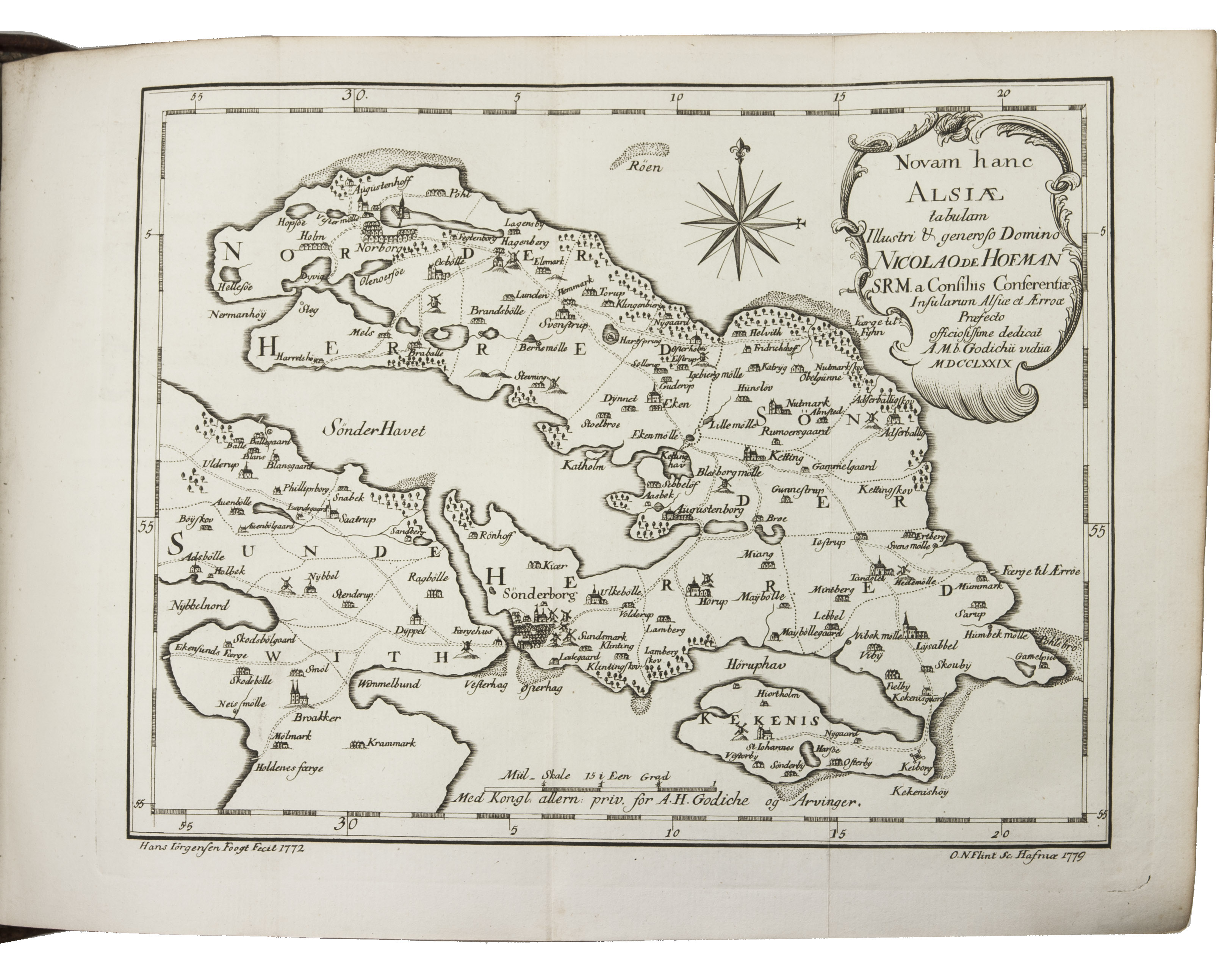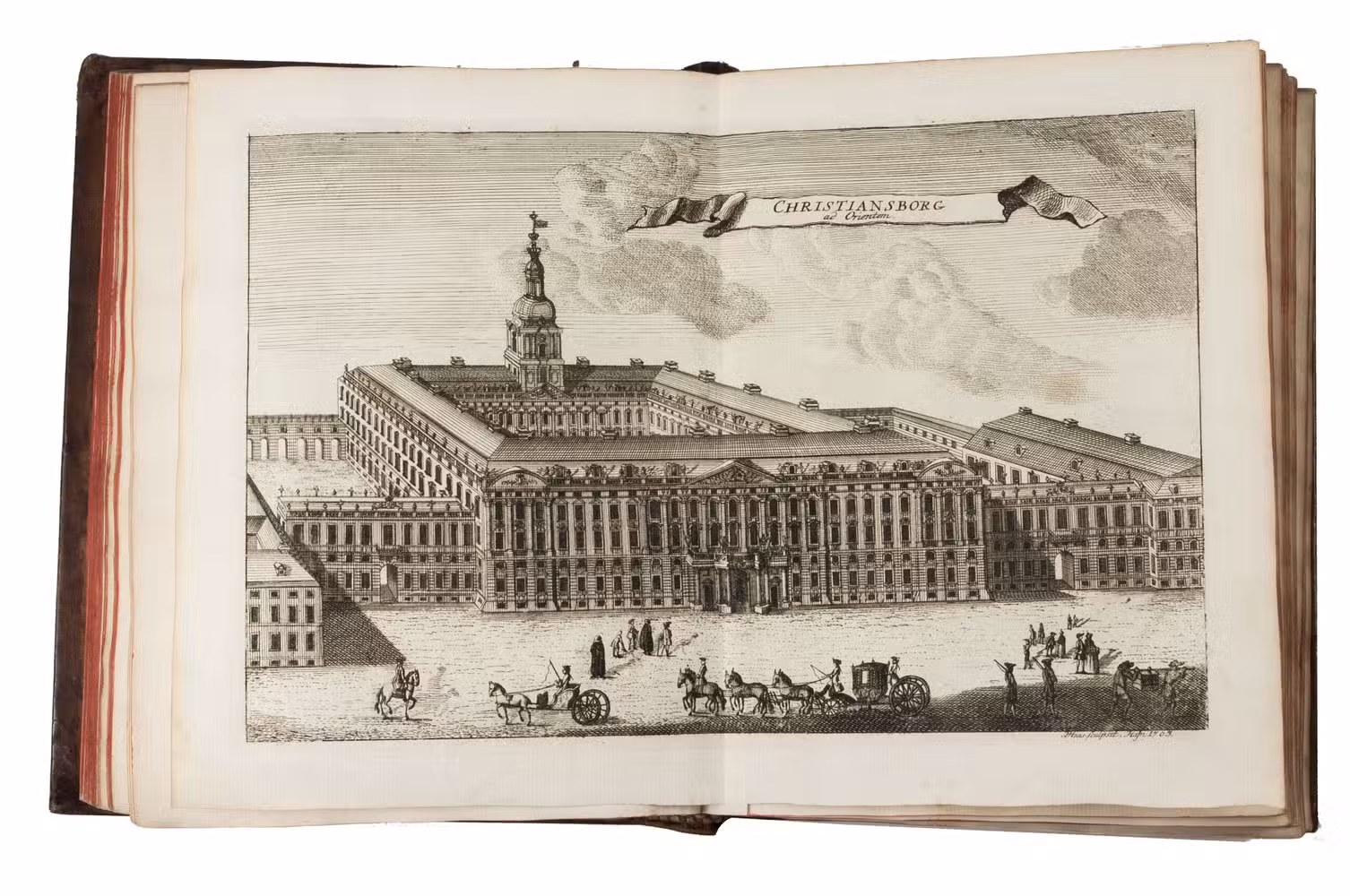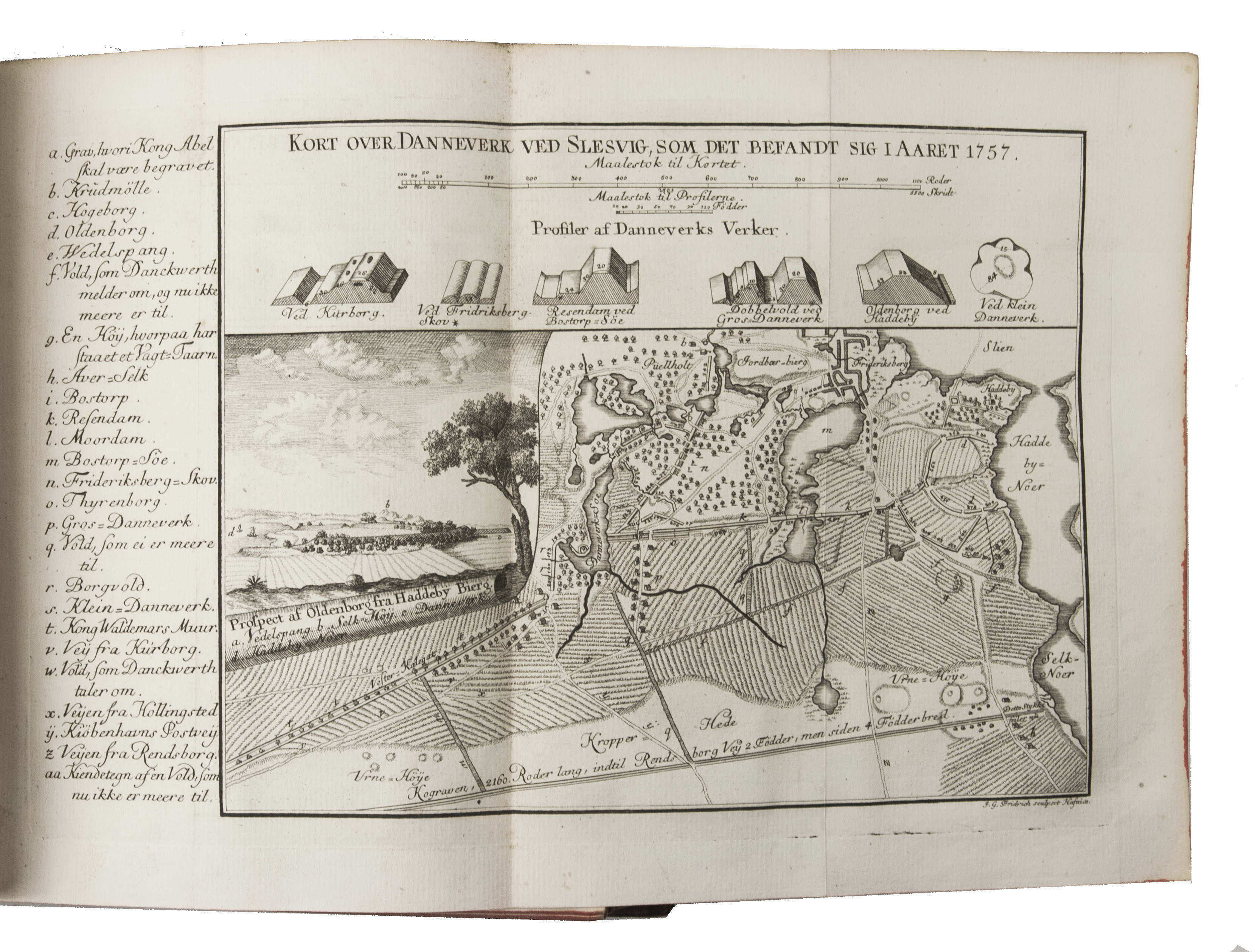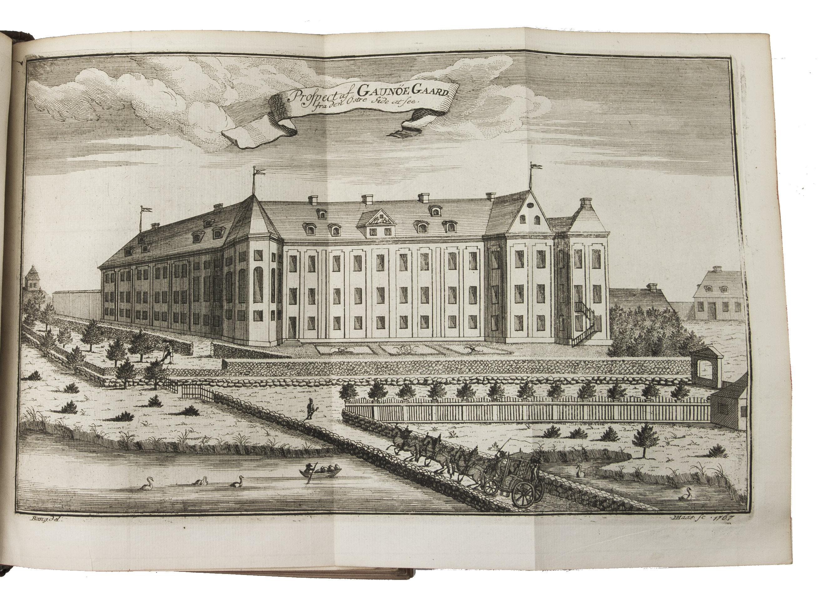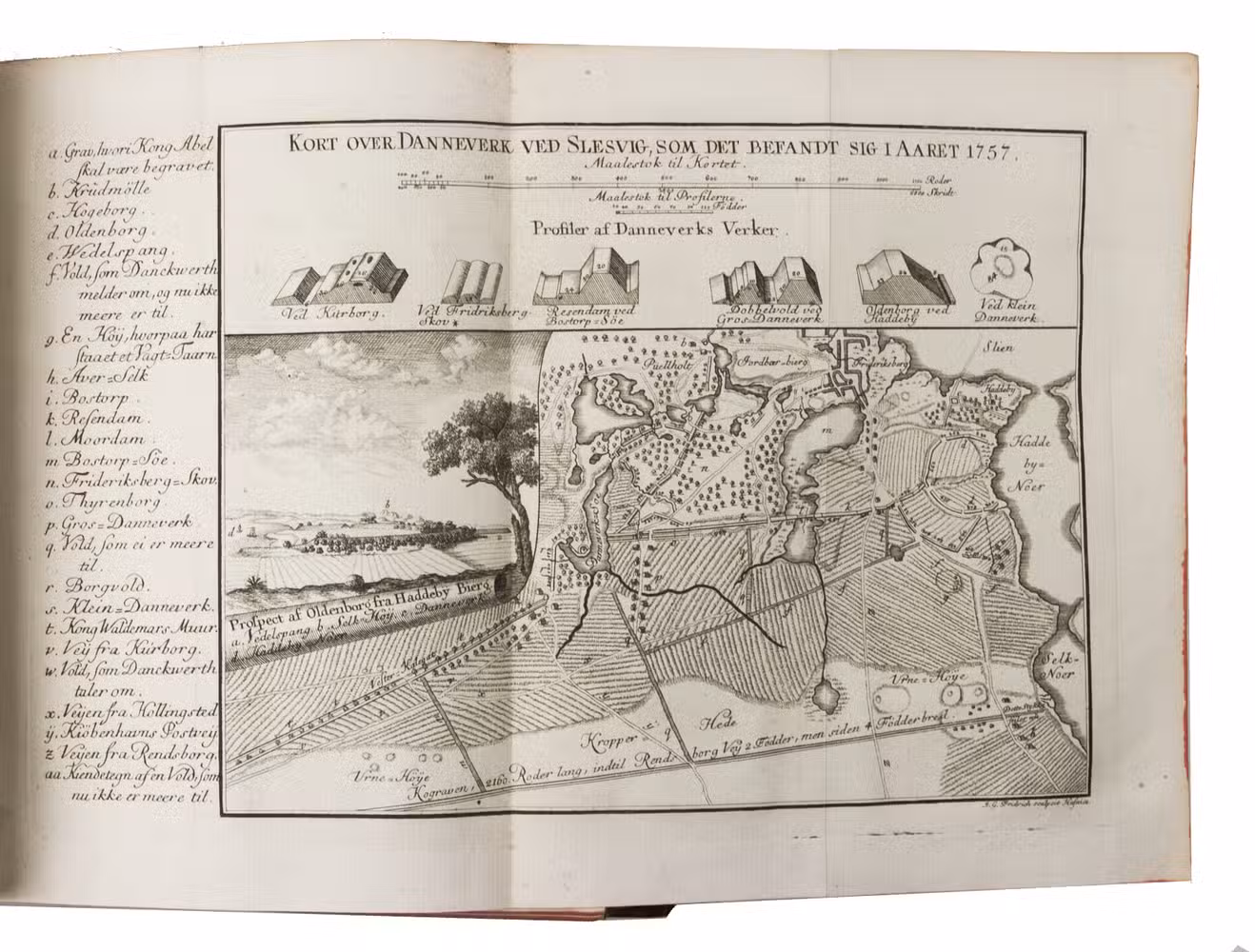 Copenhagen, Andreas Hartvig Godiche, Royal University Printer (vols. I-V) and heirs (vols. VI-VII), 1763-1781. 7 volumes. 4to. With 296 mostly folding engraved maps, plans and views of Denmark and Danish cities, castles, houses and gardens, including engraved plates showing Danish antiquarian relics, plants, animals and costumes. Contemporary uniform calf, richly gold-tooled spines. 723 to 1104 pp. per volume, giving more than 6000 pp. in total.