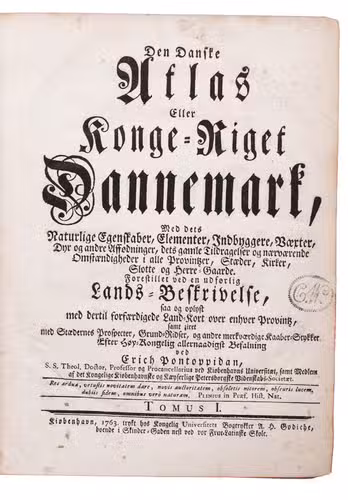 Den Danske Atlas, eller Konge-Riget Dannemark, med dets naturlige Egenskaber, Elementer, Indbyggere, Vaexter, Dyr og andre Affödninger, dets gamle Tildragelser og naervaerende Omstaendigheder i alle Provintzer, Staeder, Kirker, Slotte og Herre-Gaarde. Forestillet ved en udförlig Lands-Beskrivelse, ... Tomus I[-VII].