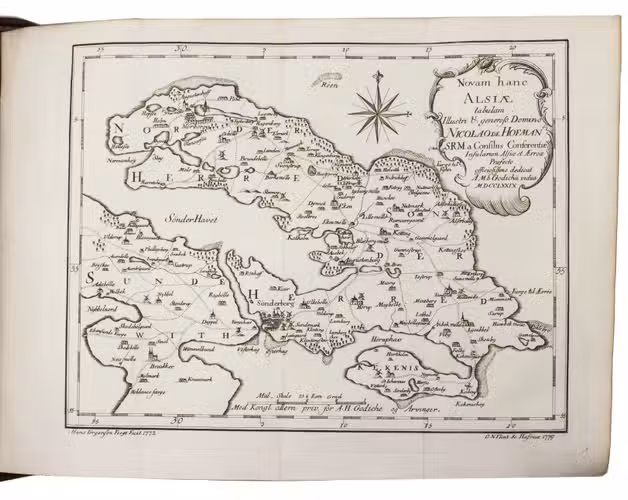 Each volume with a 1798 owner's purchase inscription by C. Worgod and his stamp. With an occasional minor stain in the fore-edge margin or insignificant small marginal defect or repair, but generally in fine condition. The bindings are slightly rubbed, the head of the backstrip of volume I restored and the spine labels chipped, but the bindings remain in good condition. A fine copy of greatest atlas of Denmark, with more than 6000 pages and nearly 300 plates, rarely found complete. Graesse V, p. 410; Kat. Schles. Holst. Landesbibl. 337; not in Berlin Kat.