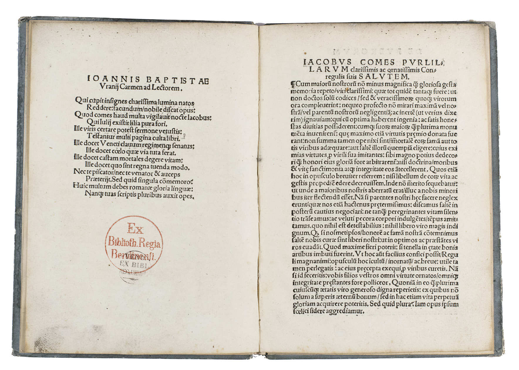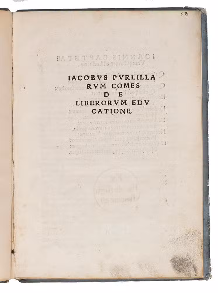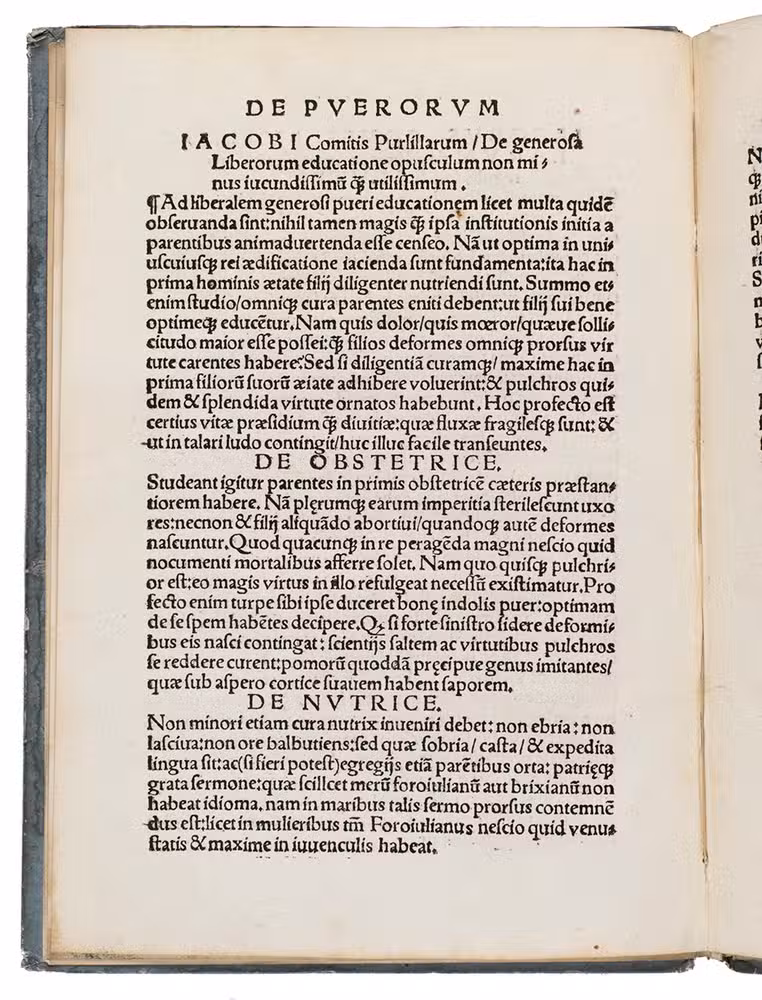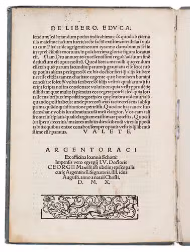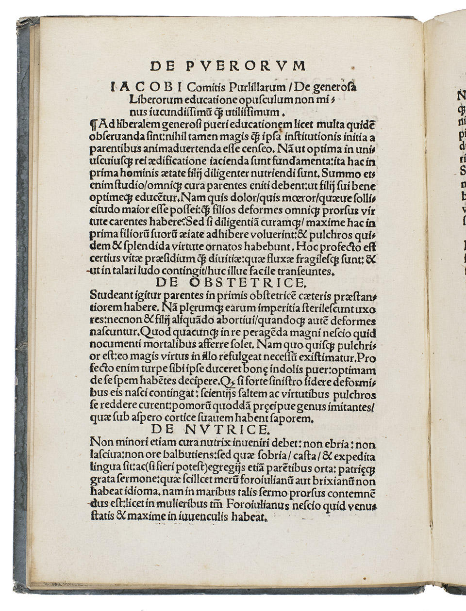 Second edition of a rare Latin treatise on the education of children, published in Strasbourg by Johannes Schot at the expense of George Maxillus, alias Übelin, Councillor of the Bishop of Strasbourg. Di Porcia (1462-1538), an Italian humanist, first published the present work as De generosa librorum educatione, printed by Gerardus (de Lisa) de Flandria (Trevisio, 1492); a third edition appeared as part of Roscius's De docendi studendique mode ... in 1541.