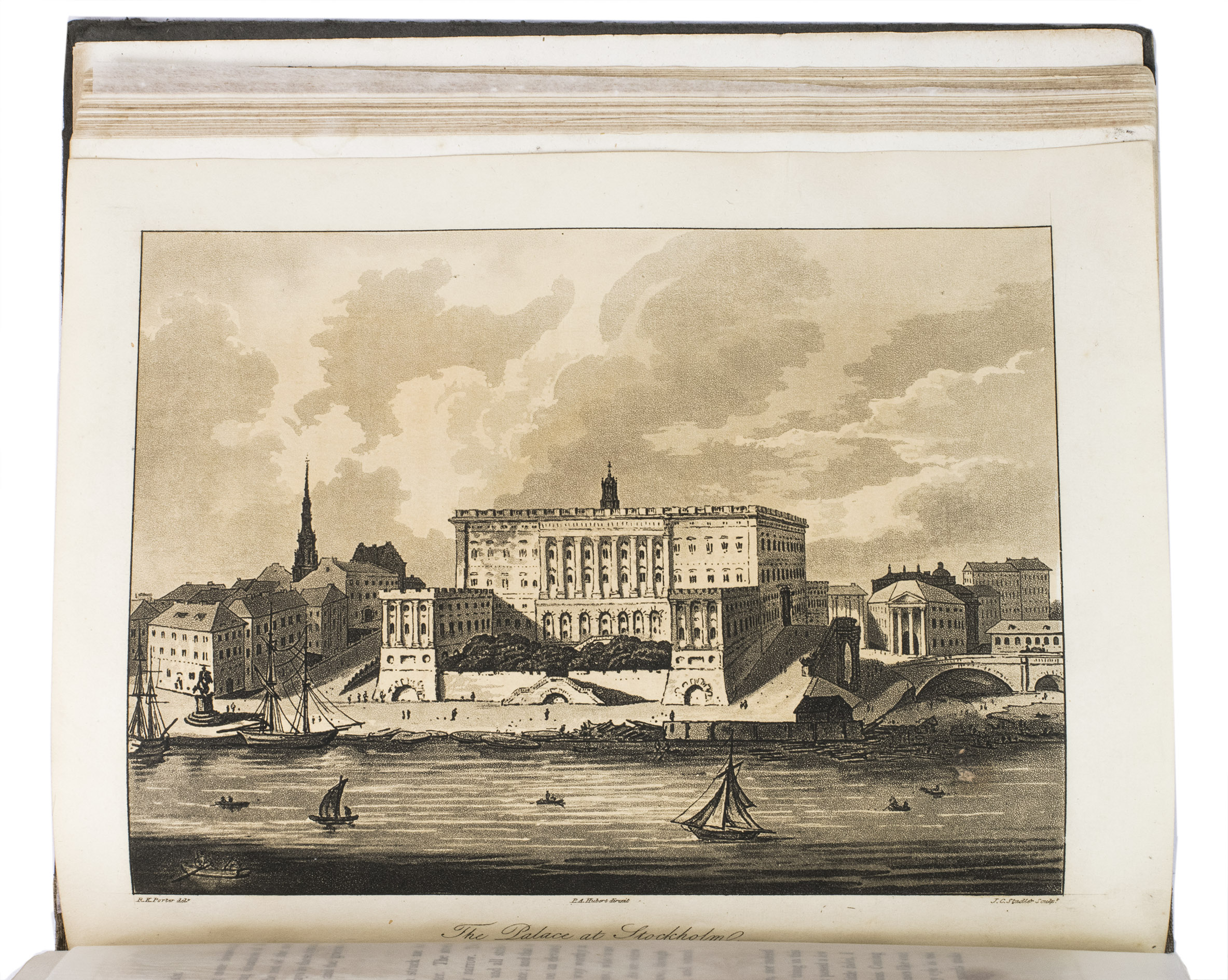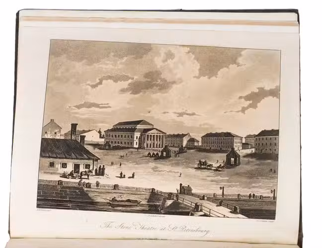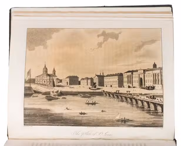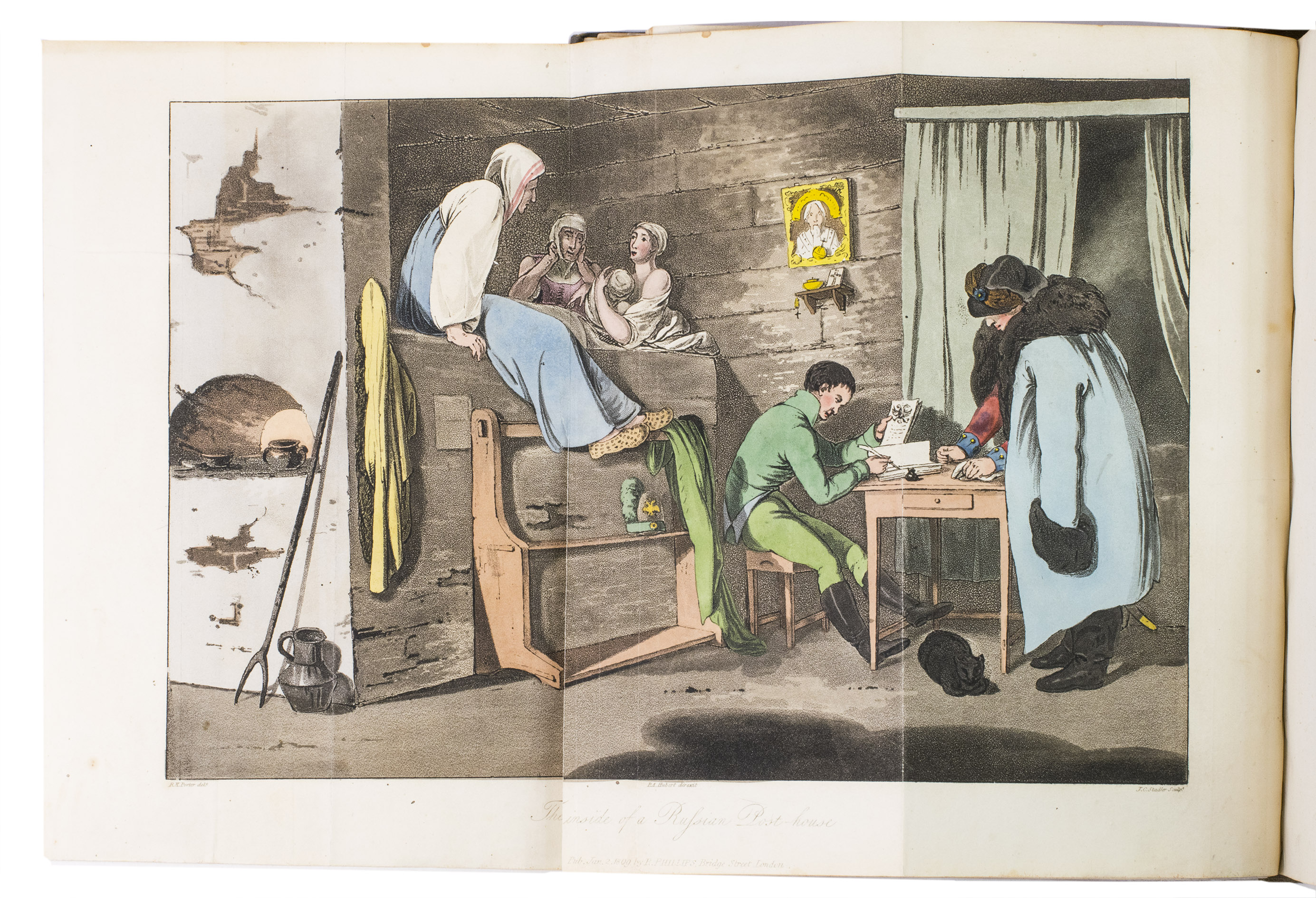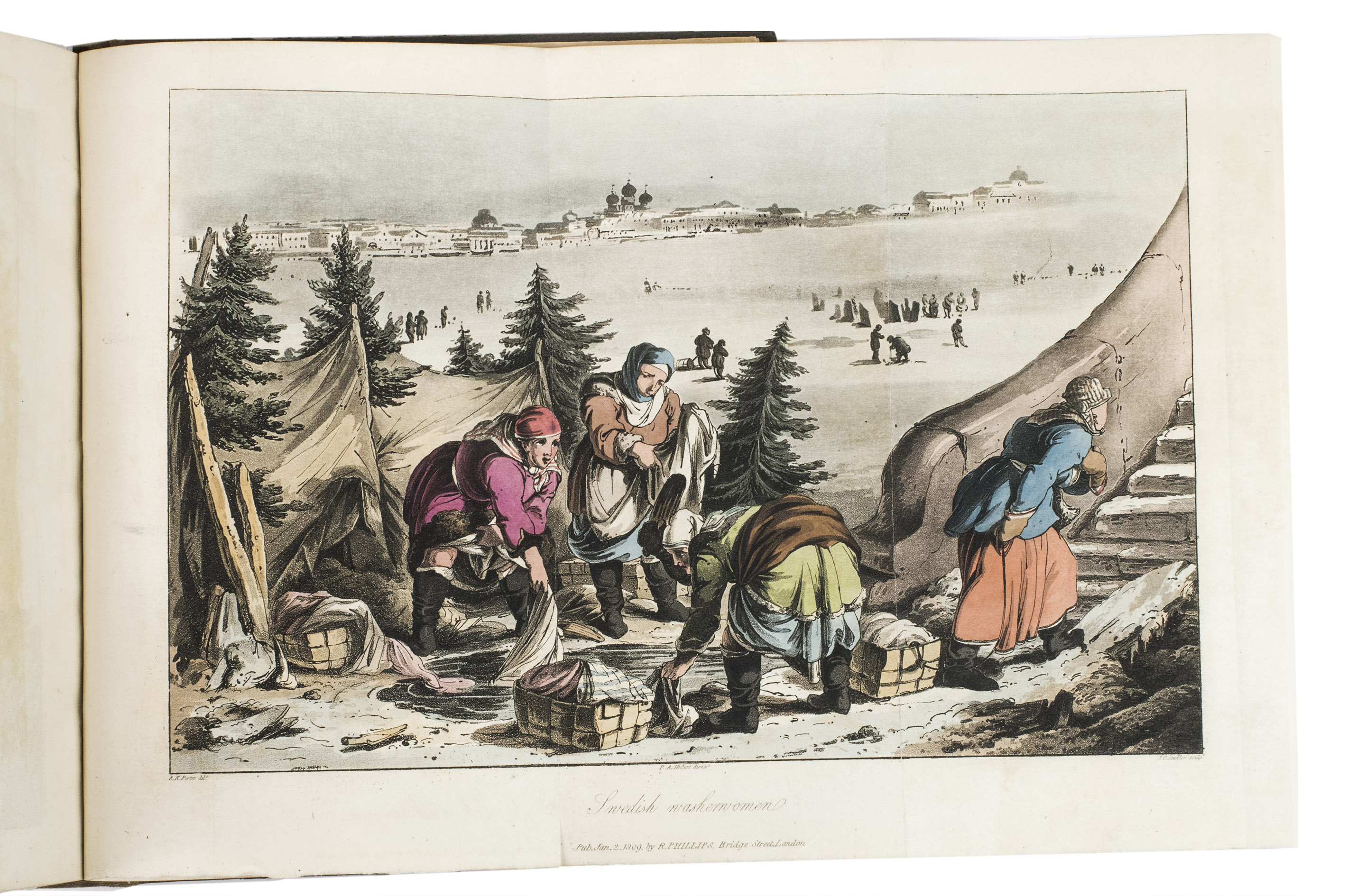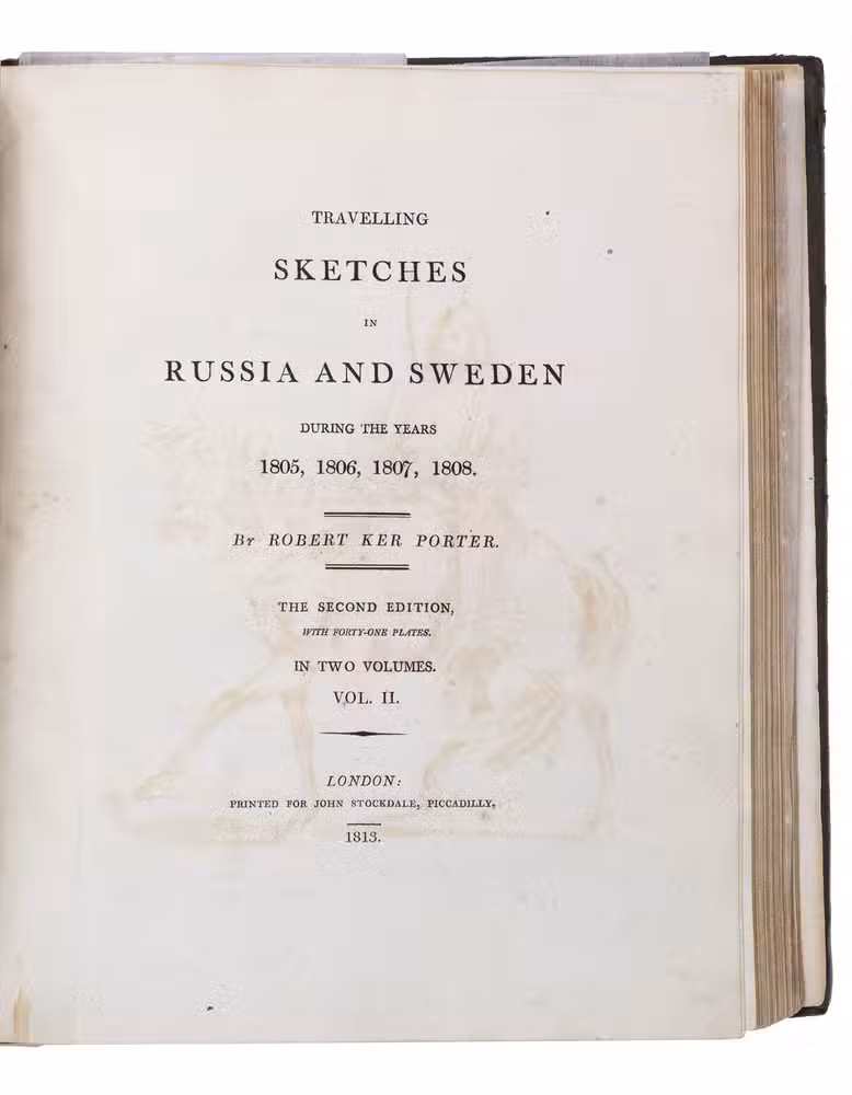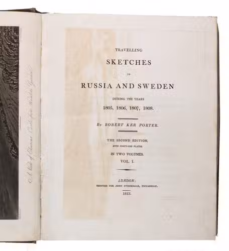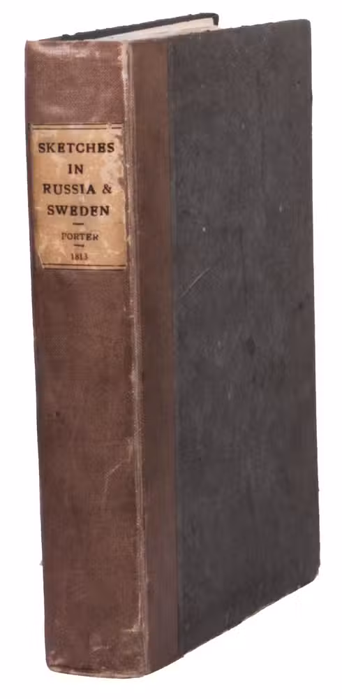 Second edition of a richly illustrated account of Russia and Scandinavia at the beginning of the 19th century by Sir Robert Ker Porter (1777-1842). Porter, a traveller, diplomat and painter, went to Russia in 1805, but had to leave in 1806 due to an unhappy love affair with a Russian princess. During the next two years he travelled through Scandinavia and other European countries. The present work reflect his experiences, discussing his journey to Russia, life in St Petersburg, the Russian nobility, peasantry and trades class, the Russian Orthodox Church, military events in Europe, the countryside in Finland and Sweden, King Gustavus Vasa of whom he etched a portrait, and more. The illustrations include buildings in St Petersburg and Stockholm, Russian tradesmen and their wives, cossacks, officers, soldiers, peasants, Bashkirs, Kirgizians, Swedish and Finnish peasants and country scenes, and the highly characteristic illustrations of the inside of a Russian postal office and Swedish women doing laundry in an ice-hole in a frozen river.
