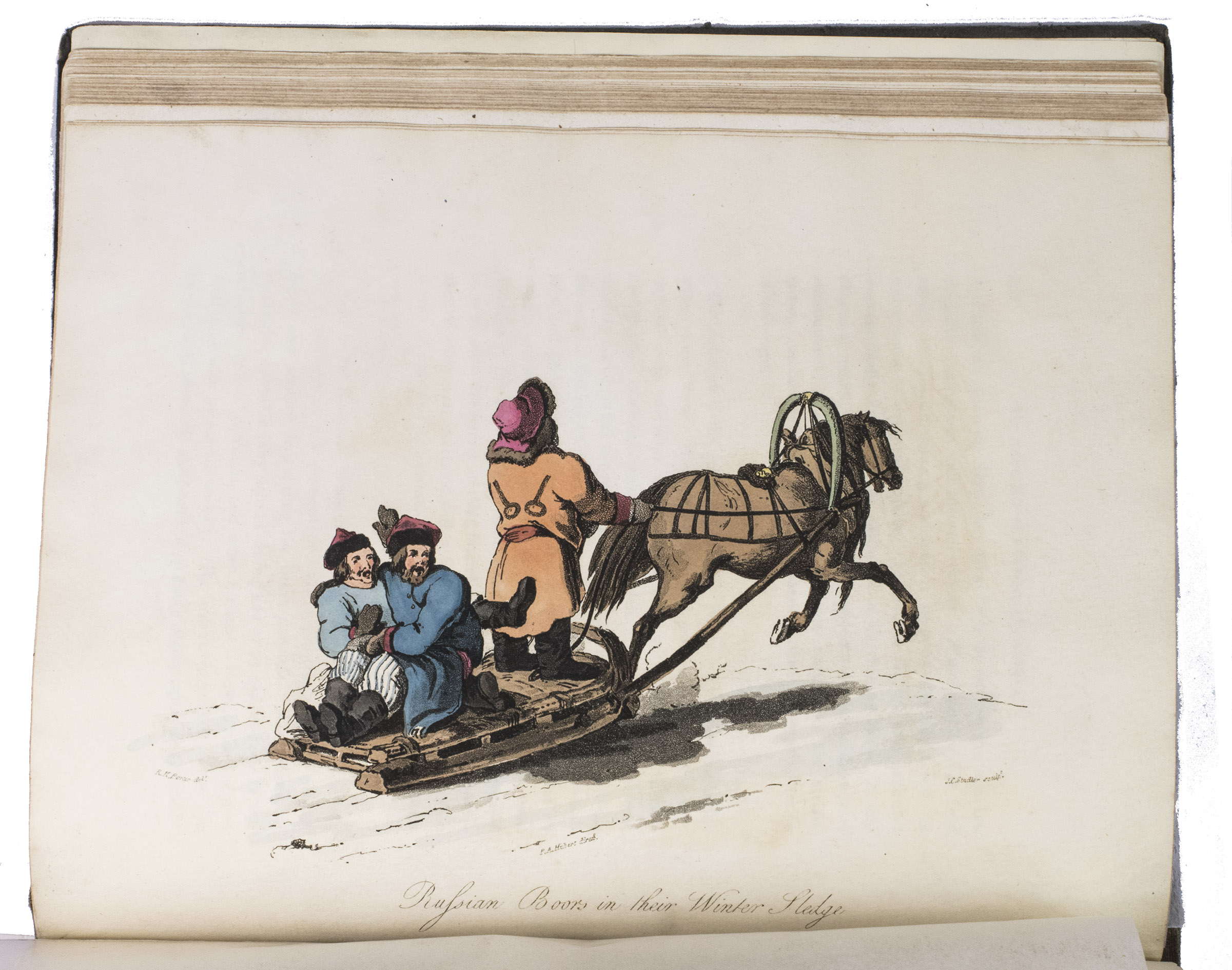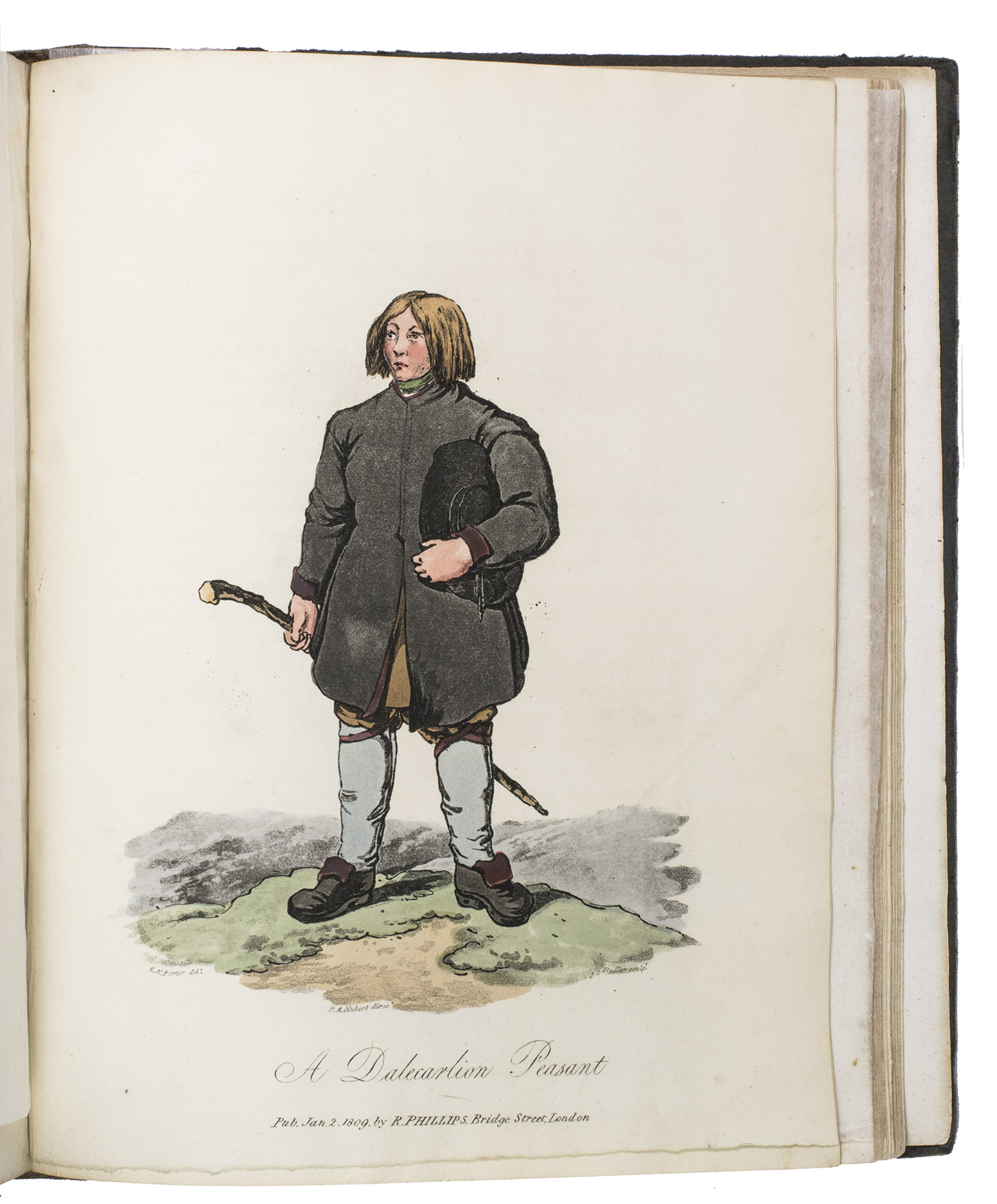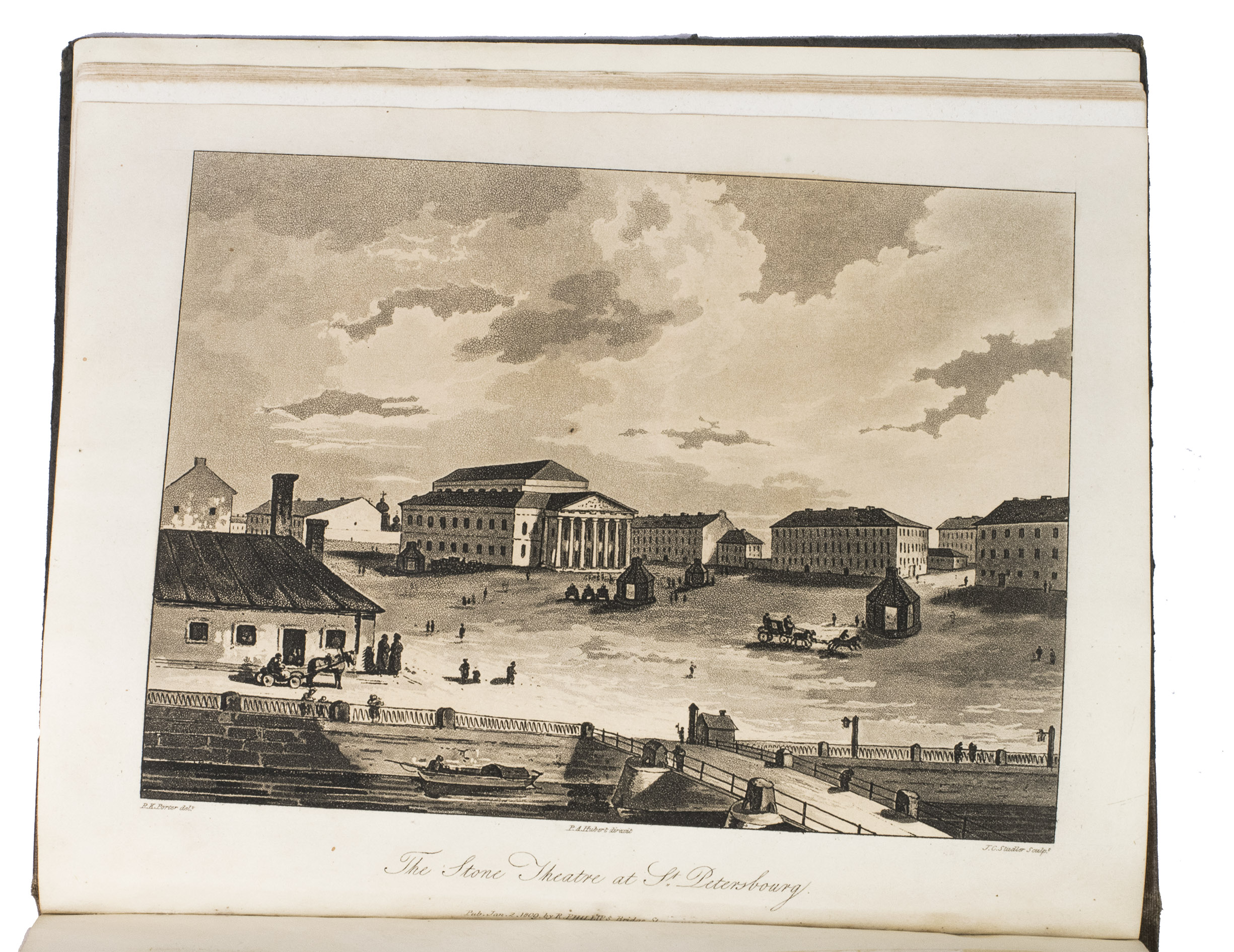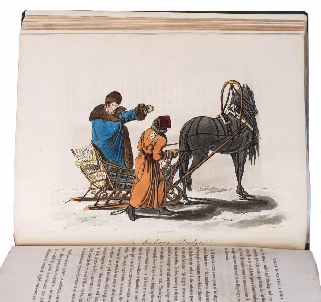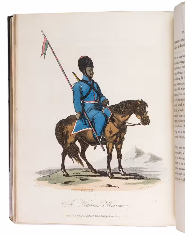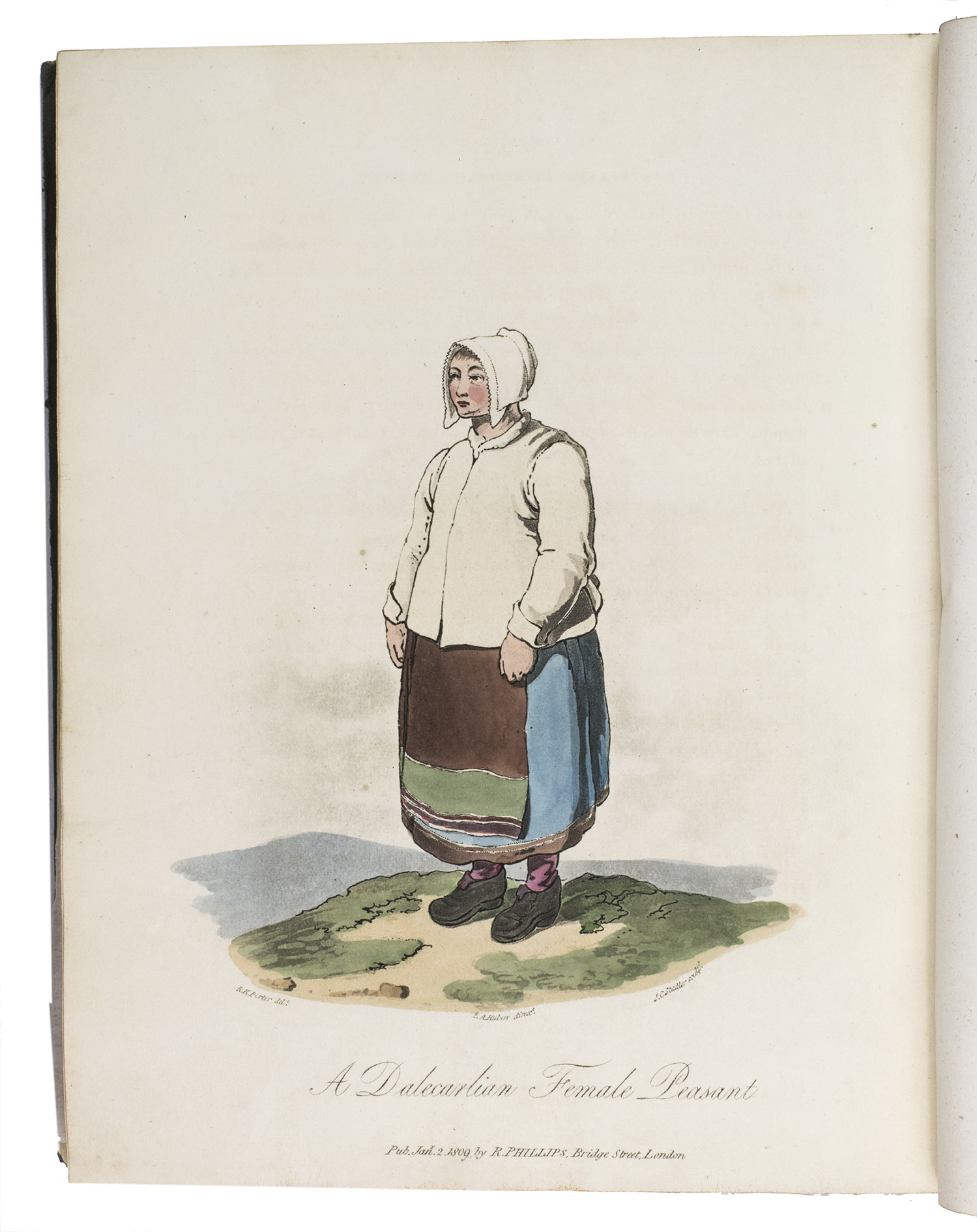 Second edition of a richly illustrated account of Russia and Scandinavia at the beginning of the 19th century by Sir Robert Ker Porter (1777-1842). Porter, a traveller, diplomat and painter, went to Russia in 1805, but had to leave in 1806 due to an unhappy love affair with a Russian princess. During the next two years he travelled through Scandinavia and other European countries. The present work reflect his experiences, discussing his journey to Russia, life in St Petersburg, the Russian nobility, peasantry and trades class, the Russian Orthodox Church, military events in Europe, the countryside in Finland and Sweden, King Gustavus Vasa of whom he etched a portrait, and more. The illustrations include buildings in St Petersburg and Stockholm, Russian tradesmen and their wives, cossacks, officers, soldiers, peasants, Bashkirs, Kirgizians, Swedish and Finnish peasants and country scenes, and the highly characteristic illustrations of the inside of a Russian postal office and Swedish women doing laundry in an ice-hole in a frozen river.