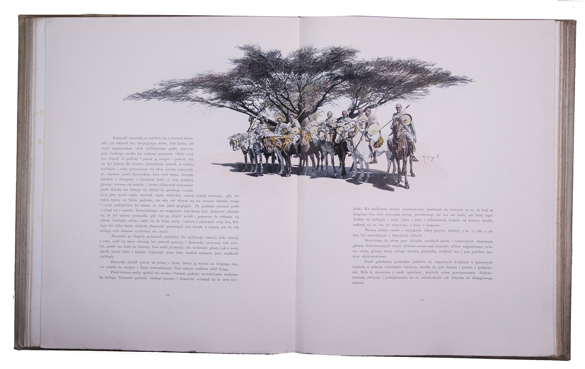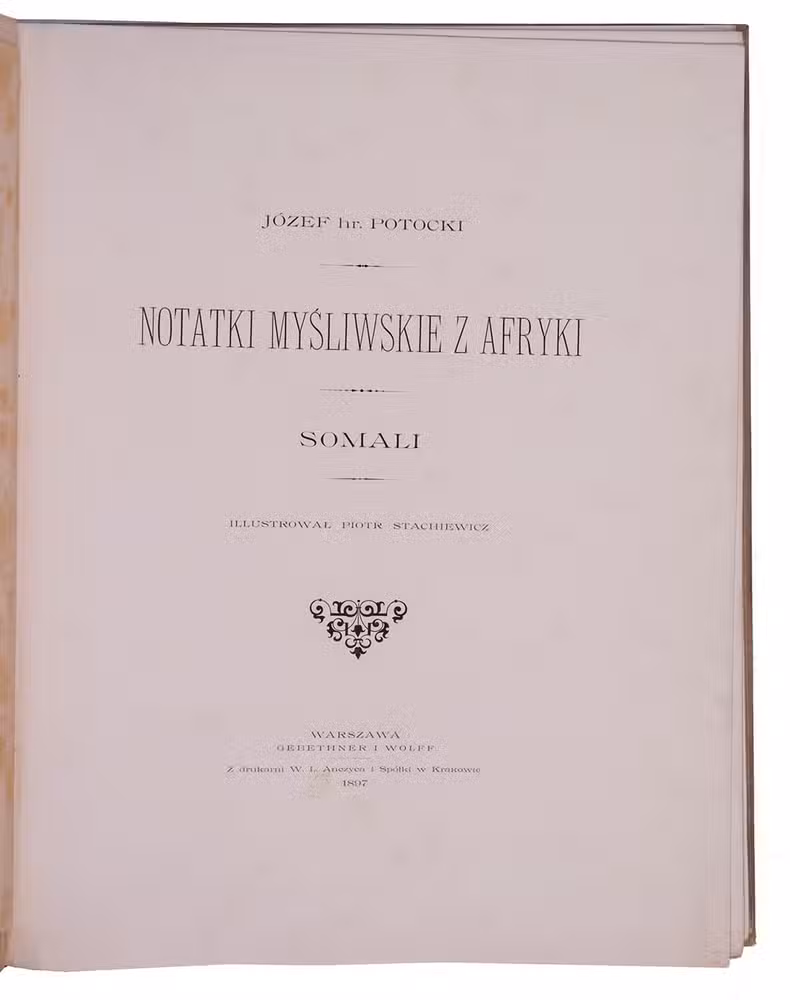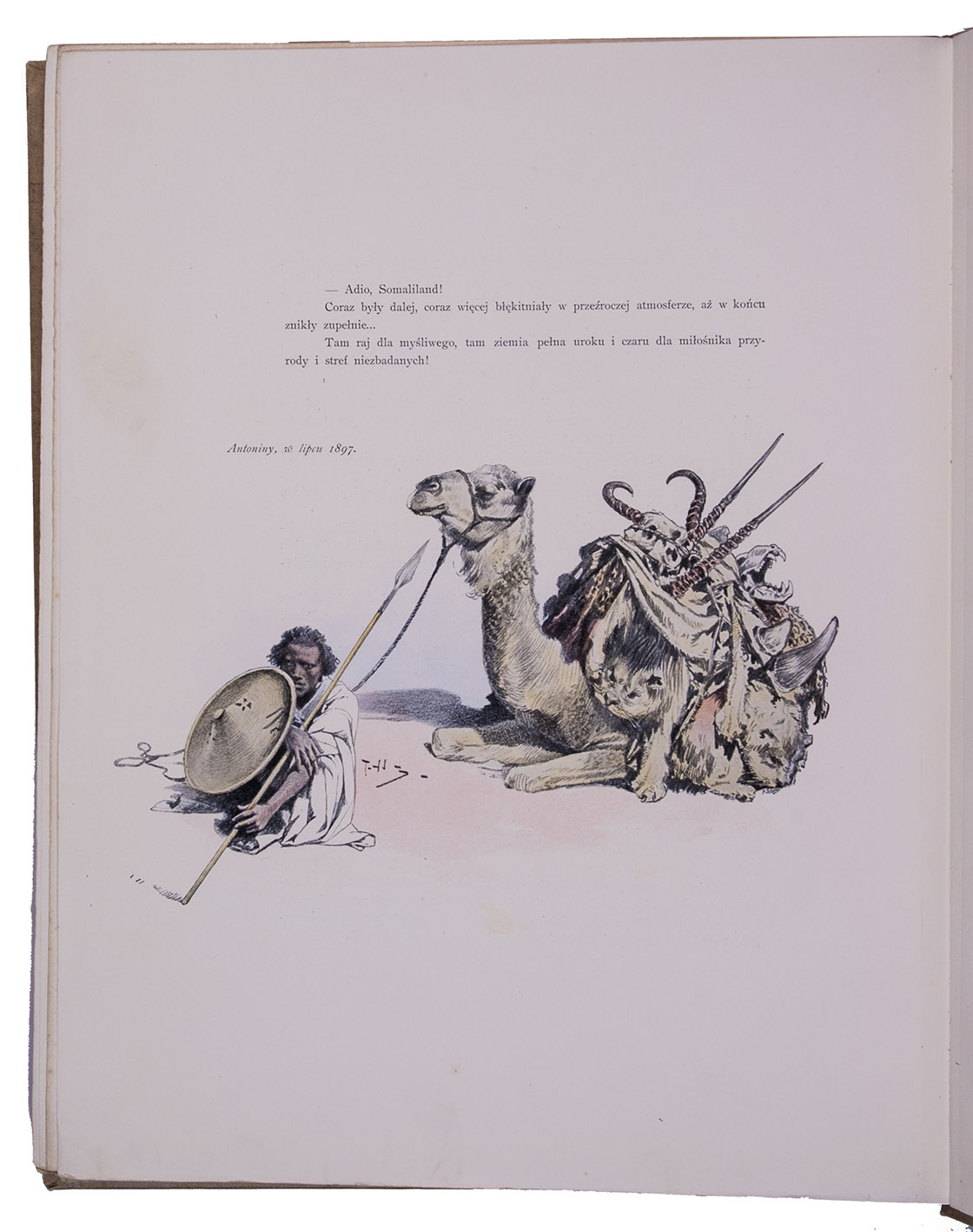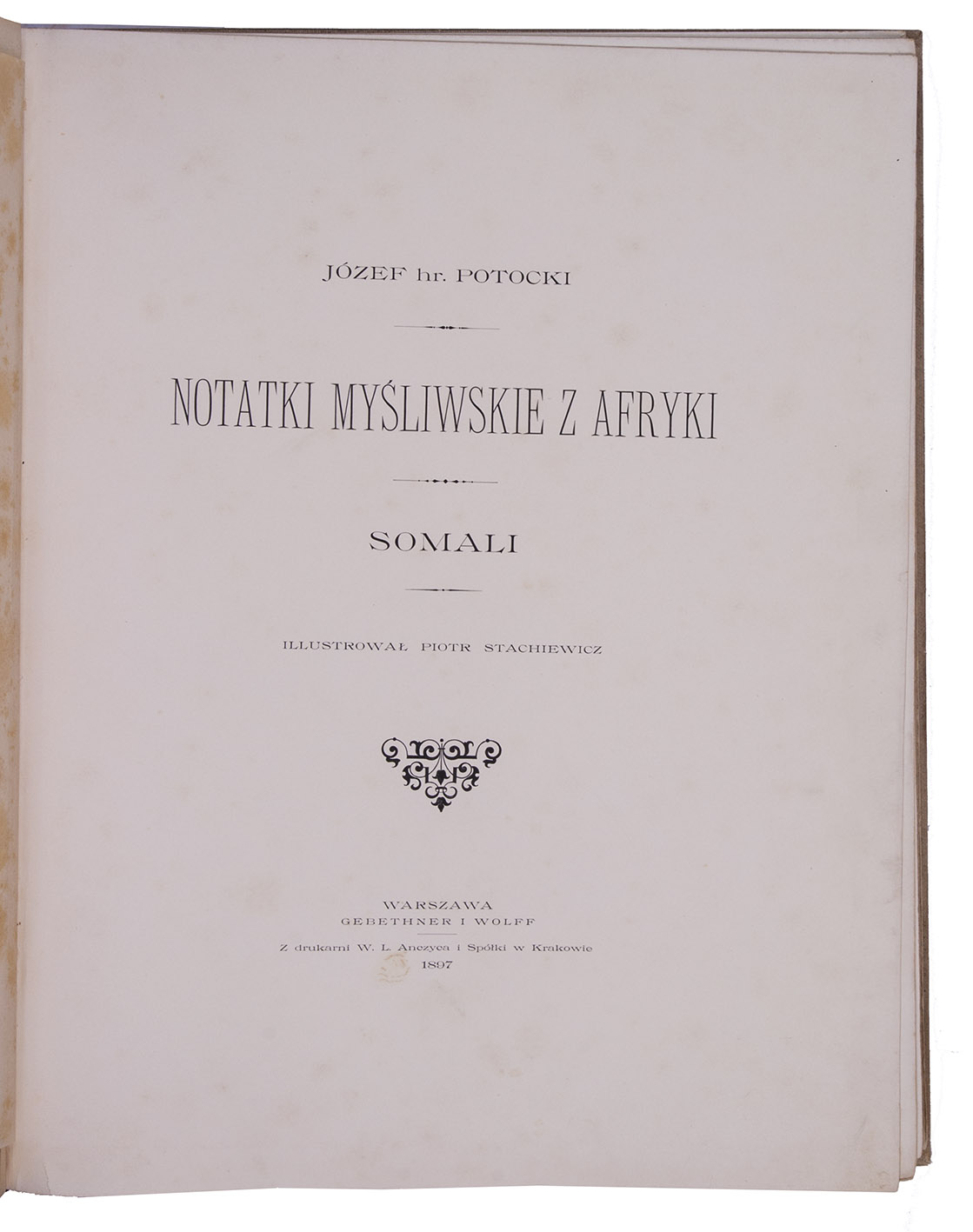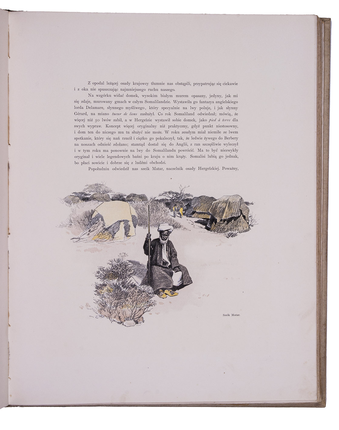 Well-illustrated first edition, in the original Polish, of "one of the rarest of all African big game hunting books" (Czech) by the Polish count Józef Potocki (1862-1922), a renowned big game hunter and breeder of Arabian horses. In 1895 he went on safari to Somaliland and afterwards wrote the present volume to commemorate the trip. The illustrations were made by the notable Polish painter and illustrator Piotr Stachiewicz (1858-1938) and include 18 beautiful photogravures of his paintings, including 5 double-page. It was translated into English a few years later as Sport in Somaliland (1900), a much sought after publication and usually much more expensive, but equally rare.