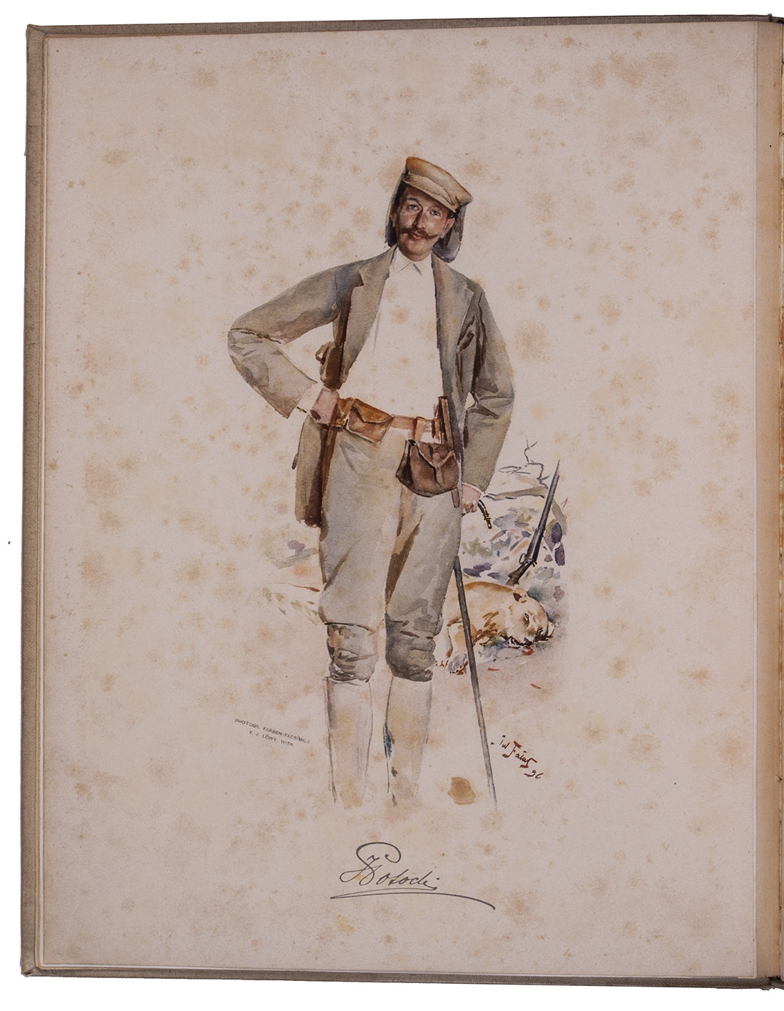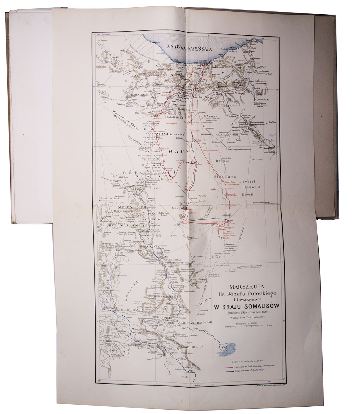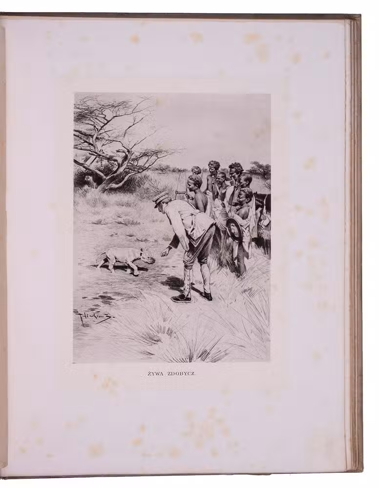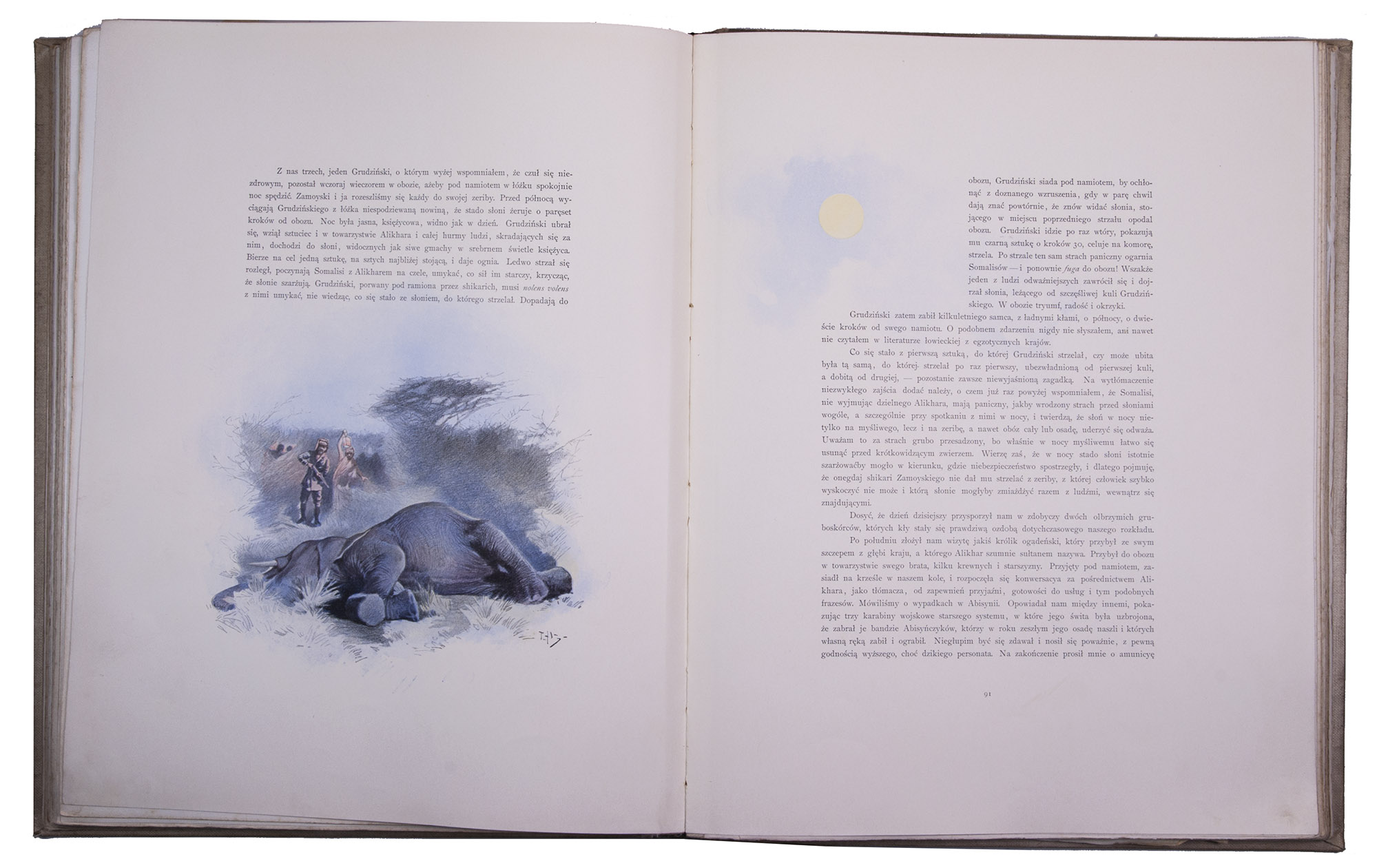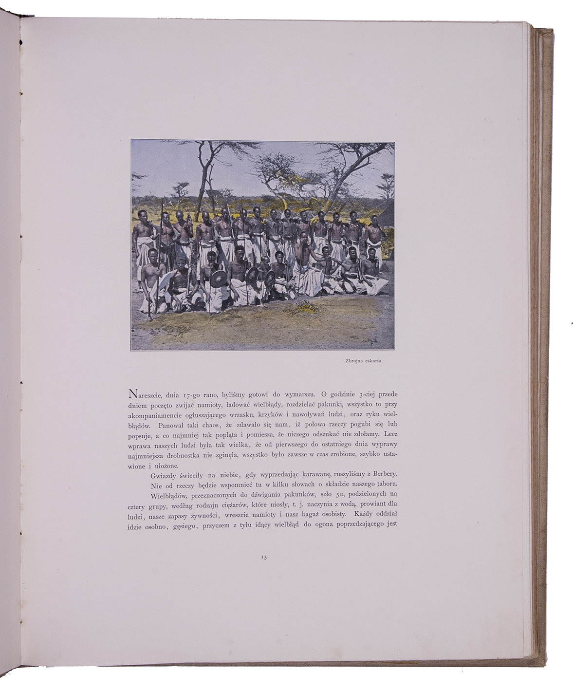 Well-illustrated first edition, in the original Polish, of "one of the rarest of all African big game hunting books" (Czech) by the Polish count Józef Potocki (1862-1922), a renowned big game hunter and breeder of Arabian horses. In 1895 he went on safari to Somaliland and afterwards wrote the present volume to commemorate the trip. The illustrations were made by the notable Polish painter and illustrator Piotr Stachiewicz (1858-1938) and include 18 beautiful photogravures of his paintings, including 5 double-page. It was translated into English a few years later as Sport in Somaliland (1900), a much sought after publication and usually much more expensive, but equally rare.