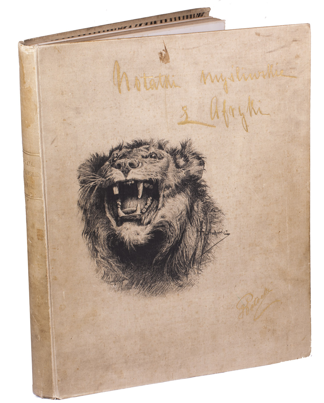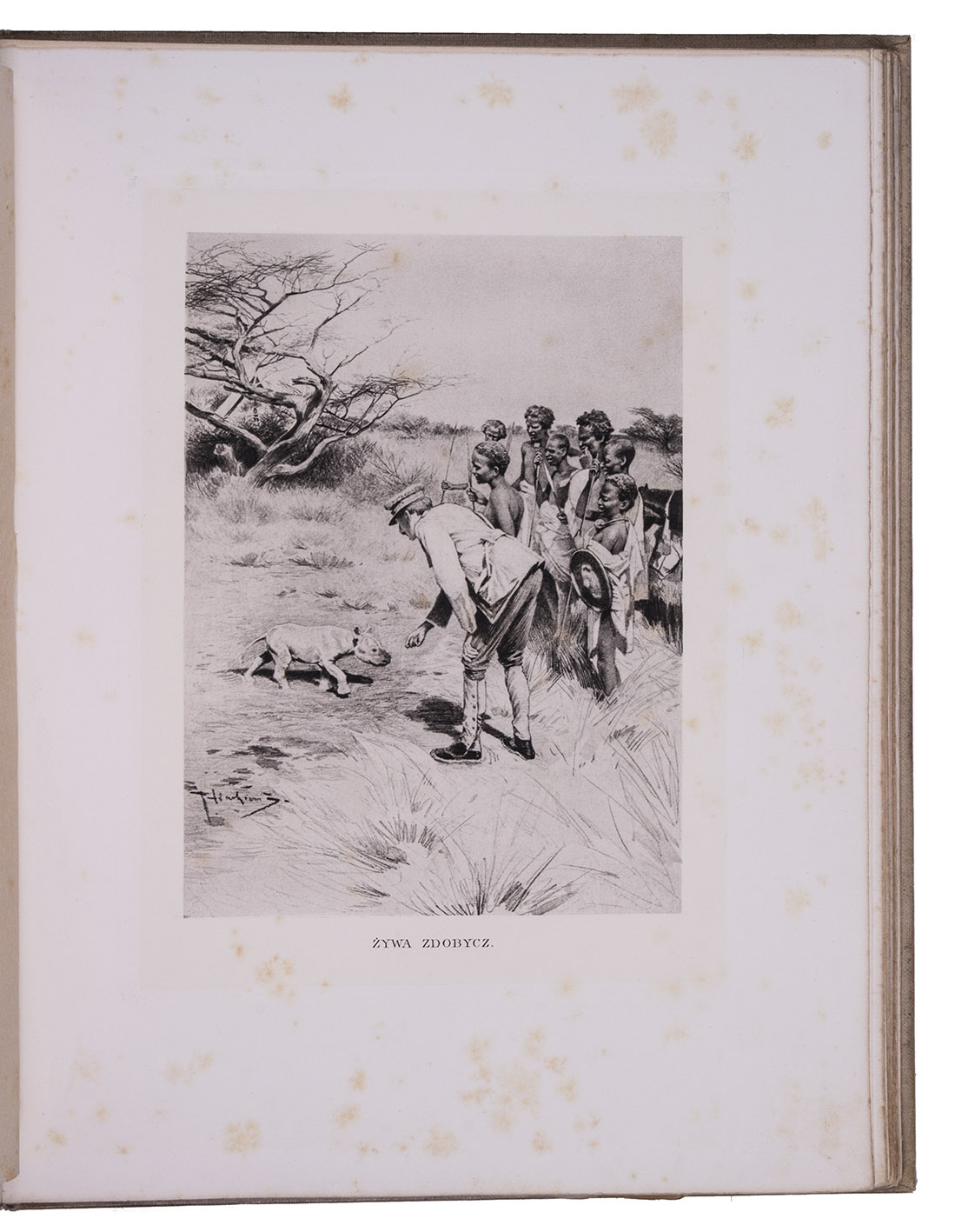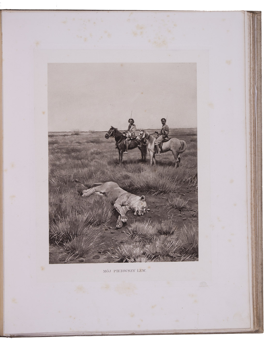 Warsaw, Gebethner & Wolff, 1897. Large 4to (40 x 31 cm). With a colour-printed frontispiece, 18 photogravure plates (5 double-page), 5 numbered full-page tinted plates, and ca. 60 illustrations in text (mostly tinted). Publisher's original pictorial beige cloth, with a lion's head on the front board and zebra-patterned endpapers. 133, [1] pp.
