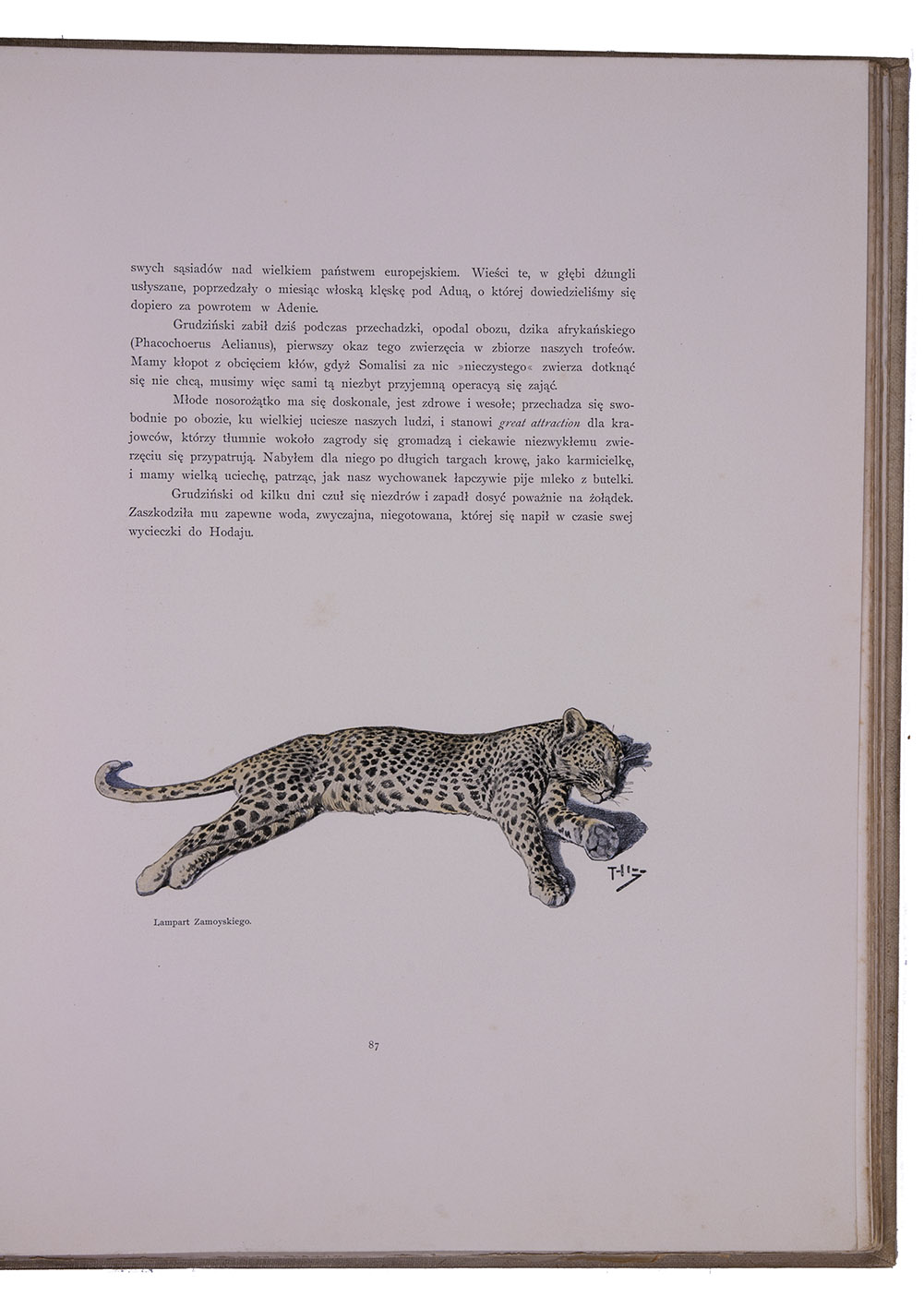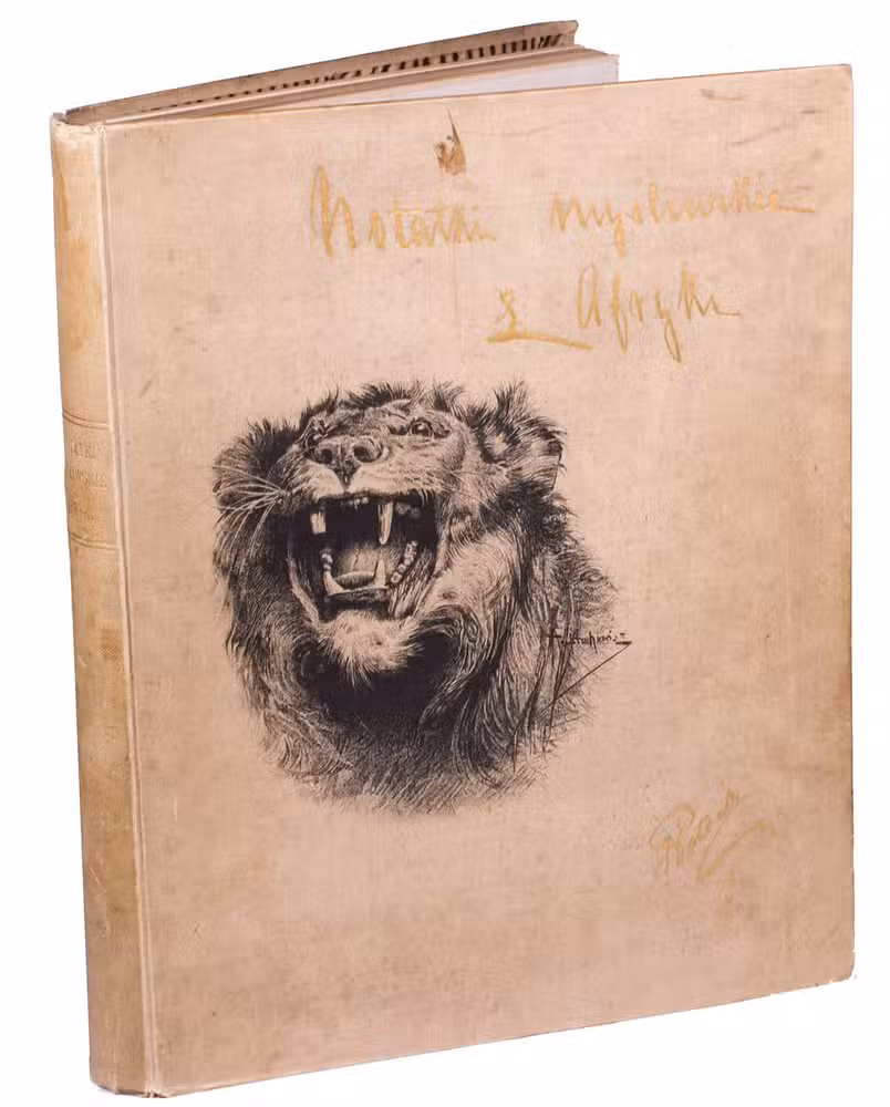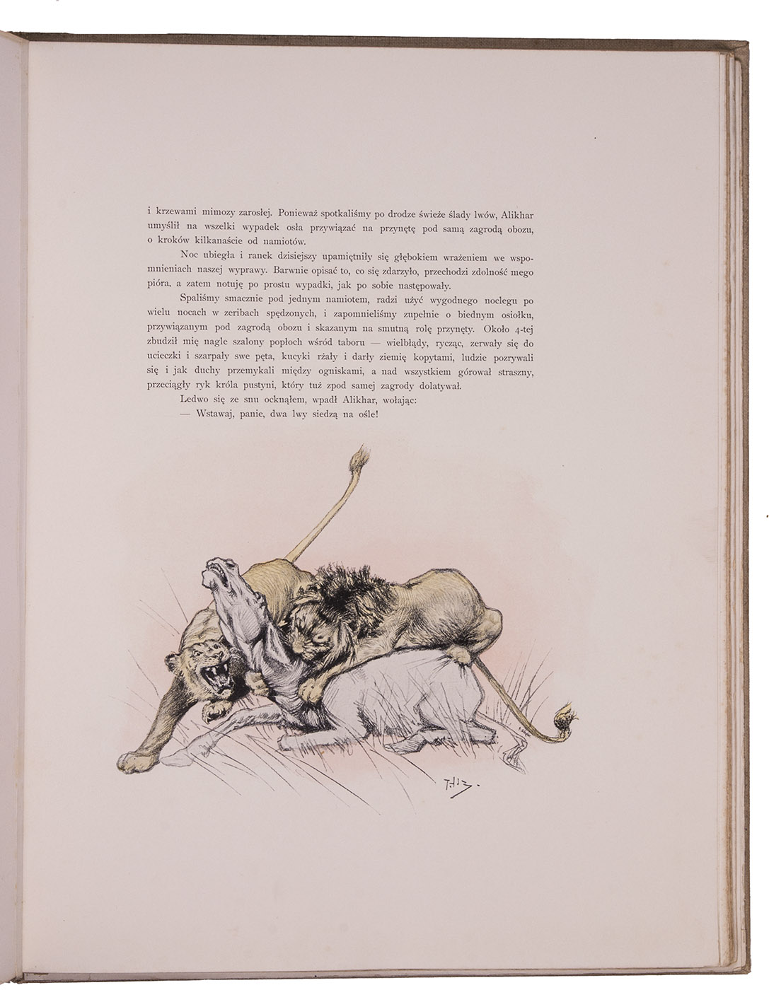 Warsaw, Gebethner & Wolff, 1897. Large 4to (40 x 31 cm). With a colour-printed frontispiece, 18 photogravure plates (5 double-page), 5 numbered full-page tinted plates, and ca. 60 illustrations in text (mostly tinted). Publisher's original pictorial beige cloth, with a lion's head on the front board and zebra-patterned endpapers. 133, [1] pp.