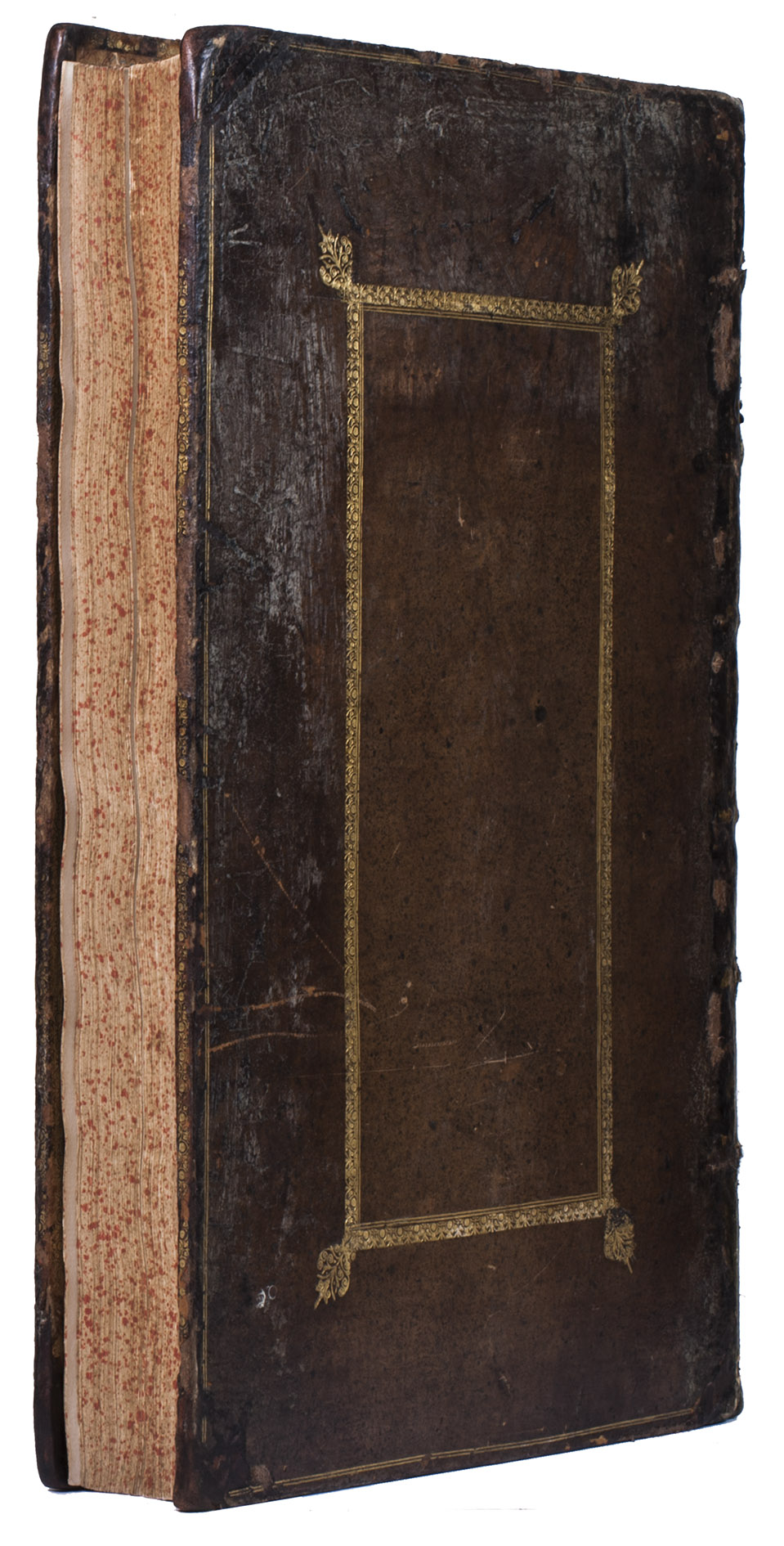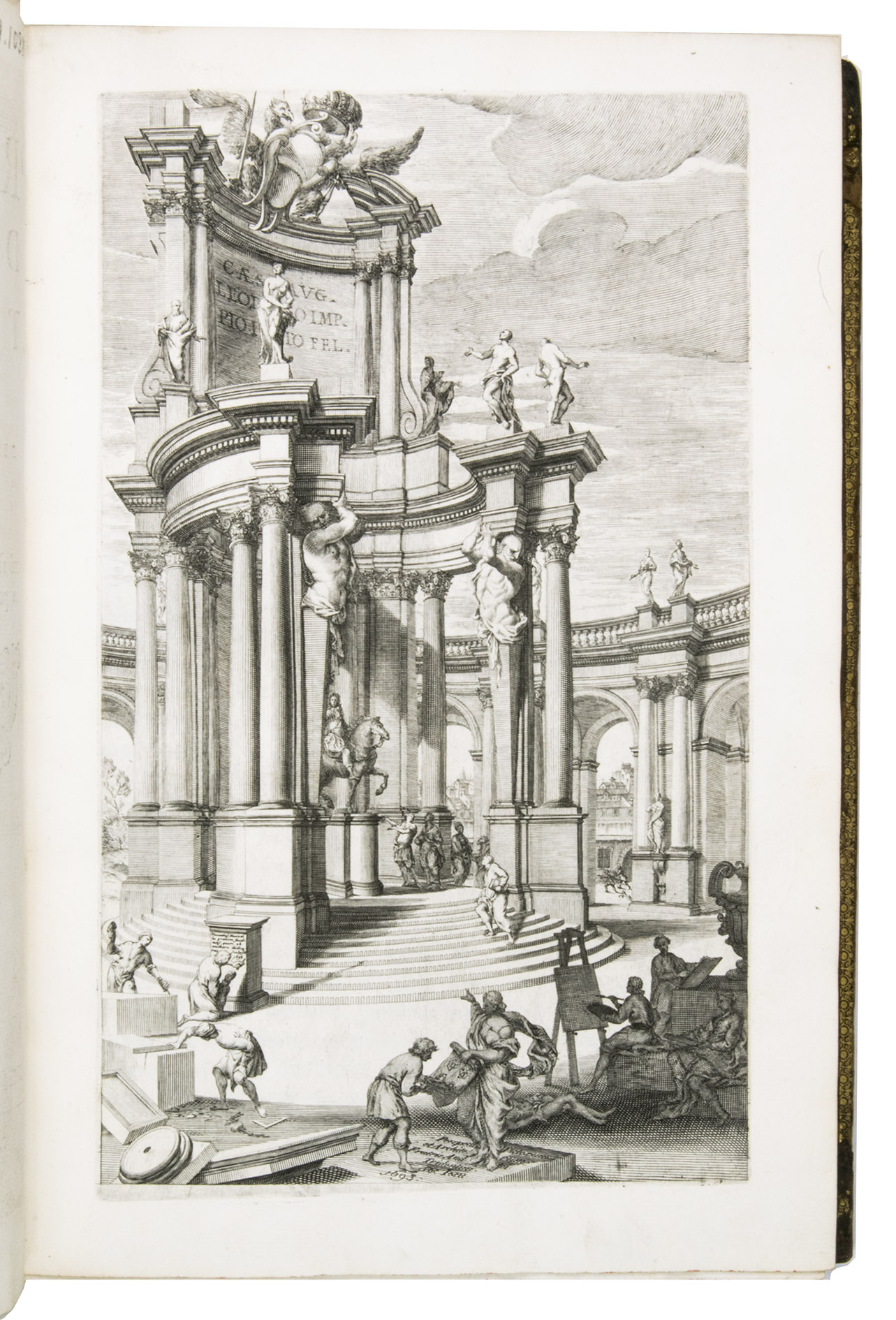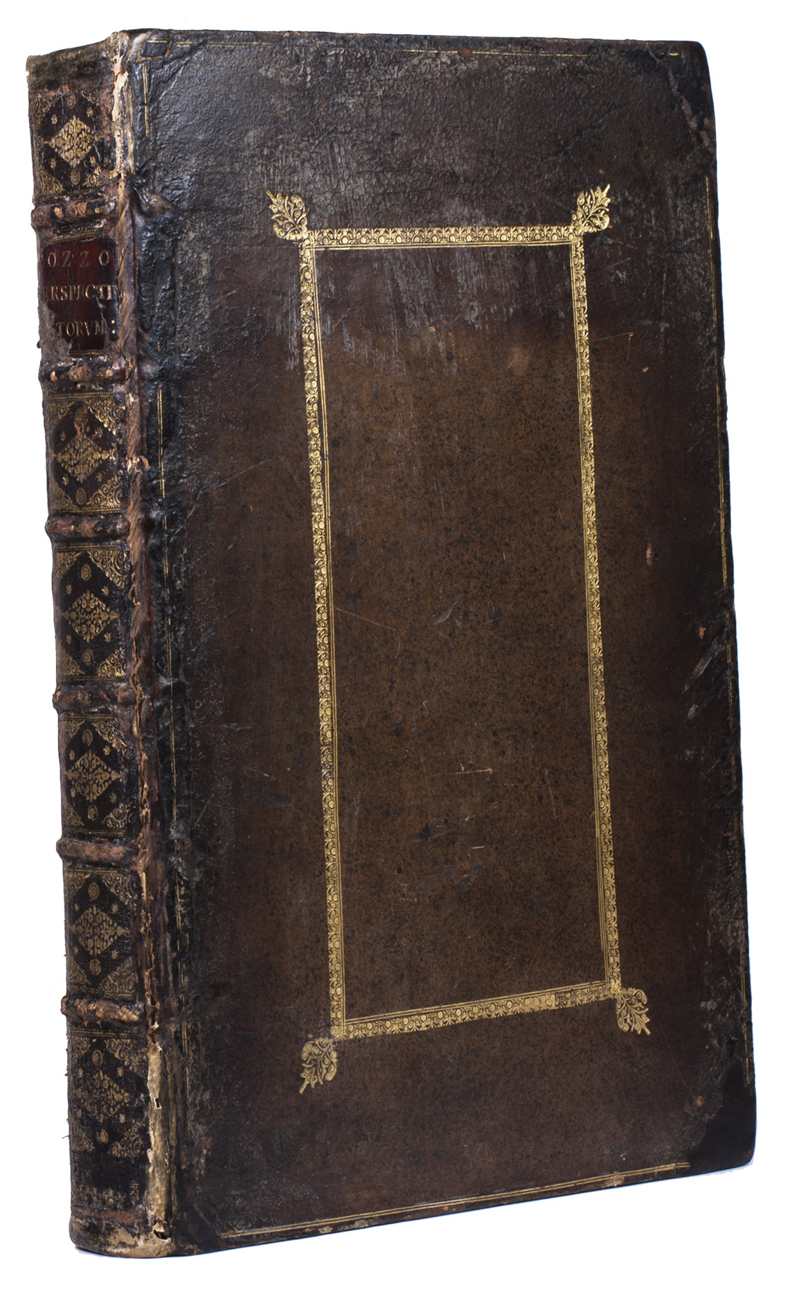 Rome, Antonio de Rossi (part 1) and Johannis Jacobi Komarek Bohemi (part 2), 1702 (part 1) and 1700 (part 2). 2 parts in 1 volume. Folio. Part 1 with a large woodcut vignette on both title-pages (one in Latin and one in Italian), an engraved architectural frontispiece dated 1693 (behind the title-pages of part 1), a full-page engraved plate with drawing instruments before the preface, and 102 numbered engraved plates with perspectival and architectural plans and illustrations, including a large folding view of Pozzo's "trompe-l'oeil" fresco on the ceiling of the St. Ignazio church in Rome. Part 2 with a large woodcut vignette on both title-pages (one in Latin and one in Italian), an engraved architectural frontispiece by Teodoro Ver Cruys (behind the title-pages of part 2), an introductory allegorical plate, and 118 numbered engraved plates with perspectival and architectural plans and illustrations, and a full-page engraved plate on fresco painting to the added treatise at the end. Contemporary gold-tooled sprinkled (mottled?) calf, sewn on 6 supports with corresponding raised bands on the spine, with a red morocco title-label lettered in gold in the second compartment, the other compartments with detailed gold-tooled decorations. The boards show a double fillet frame in an ornamental frame with ornamental cornerpieces on the outer corners, all within a double fillet frame, gold-tooled board edges and turn-ins, red sprinkled edges, marbled endpapers.