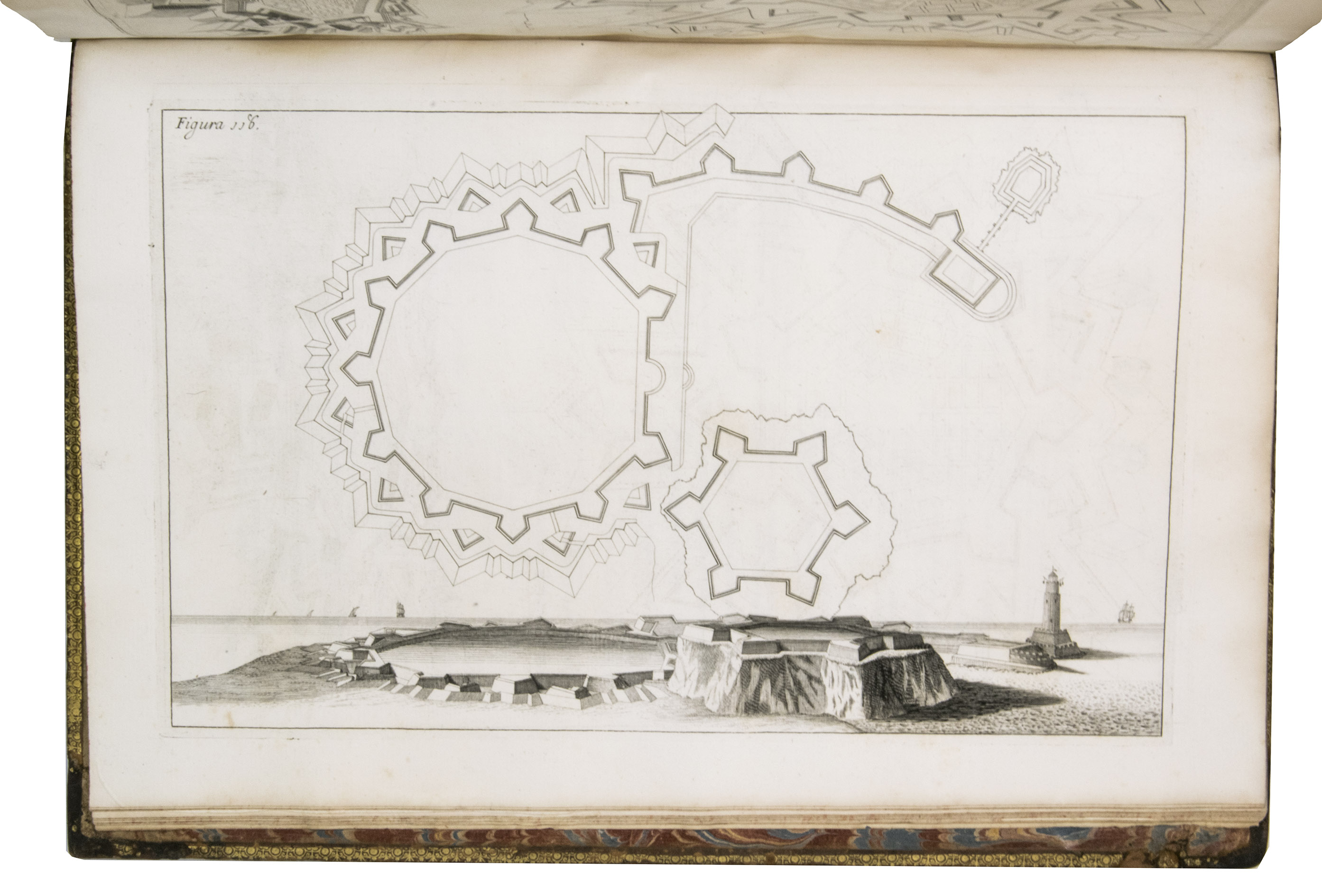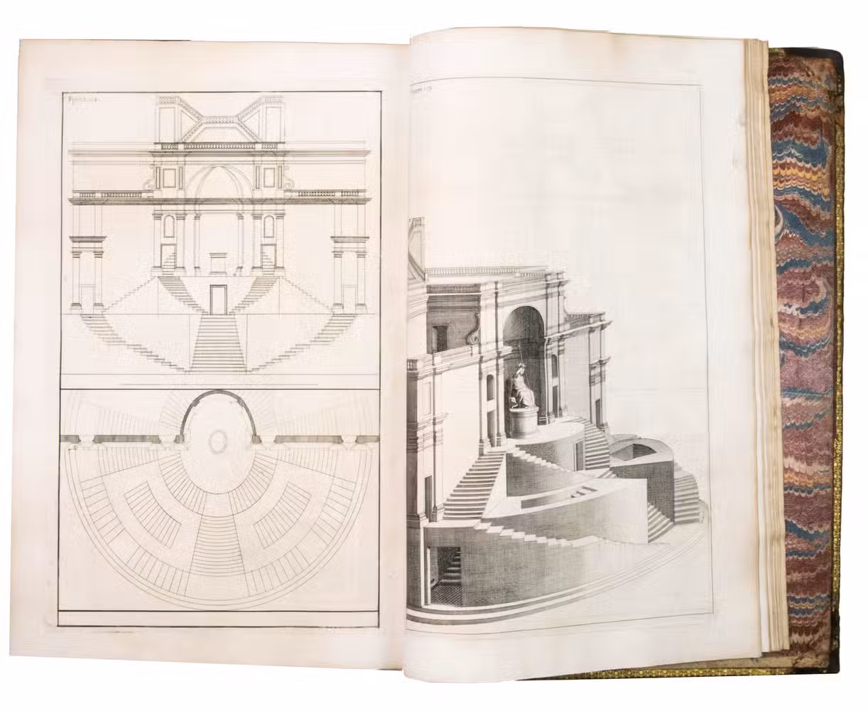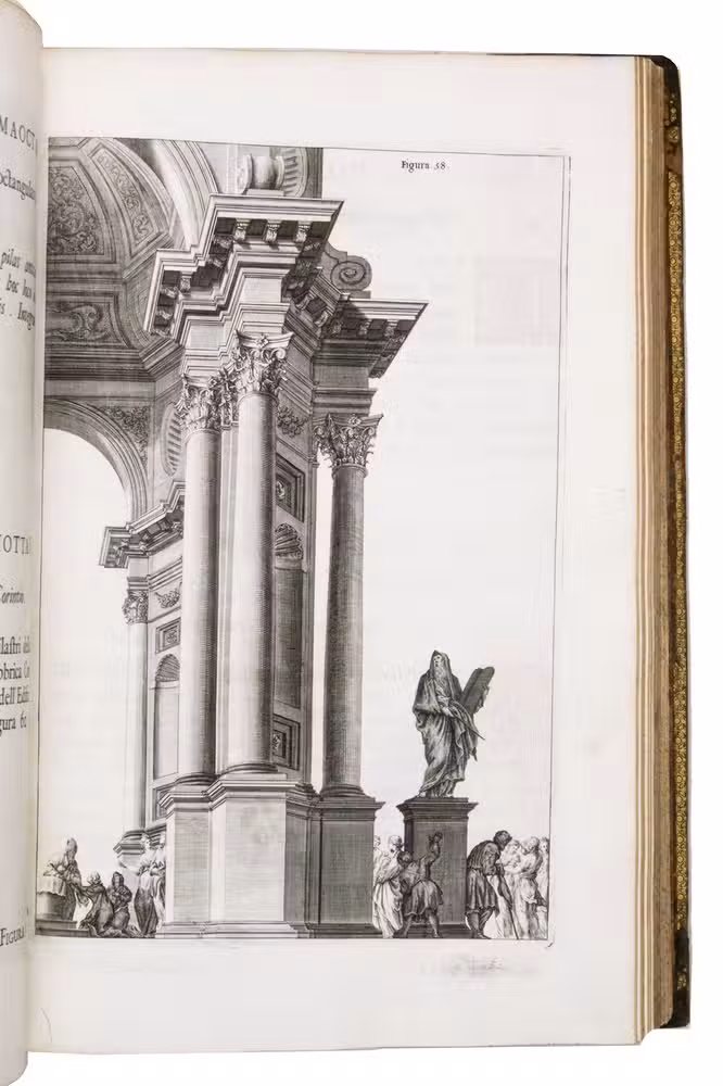 Rome, Antonio de Rossi (part 1) and Johannis Jacobi Komarek Bohemi (part 2), 1702 (part 1) and 1700 (part 2). 2 parts in 1 volume. Folio. Part 1 with a large woodcut vignette on both title-pages (one in Latin and one in Italian), an engraved architectural frontispiece dated 1693 (behind the title-pages of part 1), a full-page engraved plate with drawing instruments before the preface, and 102 numbered engraved plates with perspectival and architectural plans and illustrations, including a large folding view of Pozzo's "trompe-l'oeil" fresco on the ceiling of the St. Ignazio church in Rome. Part 2 with a large woodcut vignette on both title-pages (one in Latin and one in Italian), an engraved architectural frontispiece by Teodoro Ver Cruys (behind the title-pages of part 2), an introductory allegorical plate, and 118 numbered engraved plates with perspectival and architectural plans and illustrations, and a full-page engraved plate on fresco painting to the added treatise at the end. Contemporary gold-tooled sprinkled (mottled?) calf, sewn on 6 supports with corresponding raised bands on the spine, with a red morocco title-label lettered in gold in the second compartment, the other compartments with detailed gold-tooled decorations. The boards show a double fillet frame in an ornamental frame with ornamental cornerpieces on the outer corners, all within a double fillet frame, gold-tooled board edges and turn-ins, red sprinkled edges, marbled endpapers.