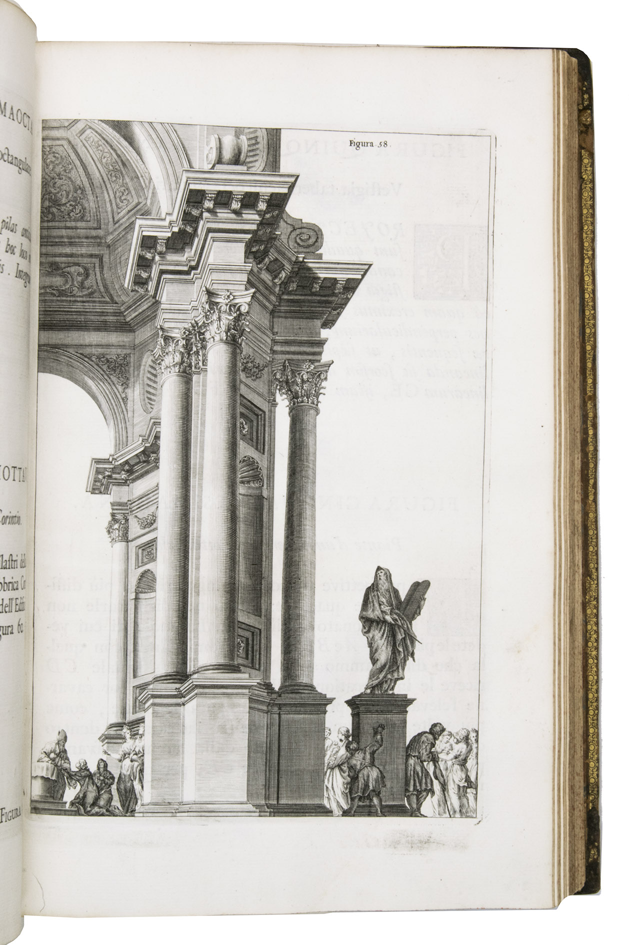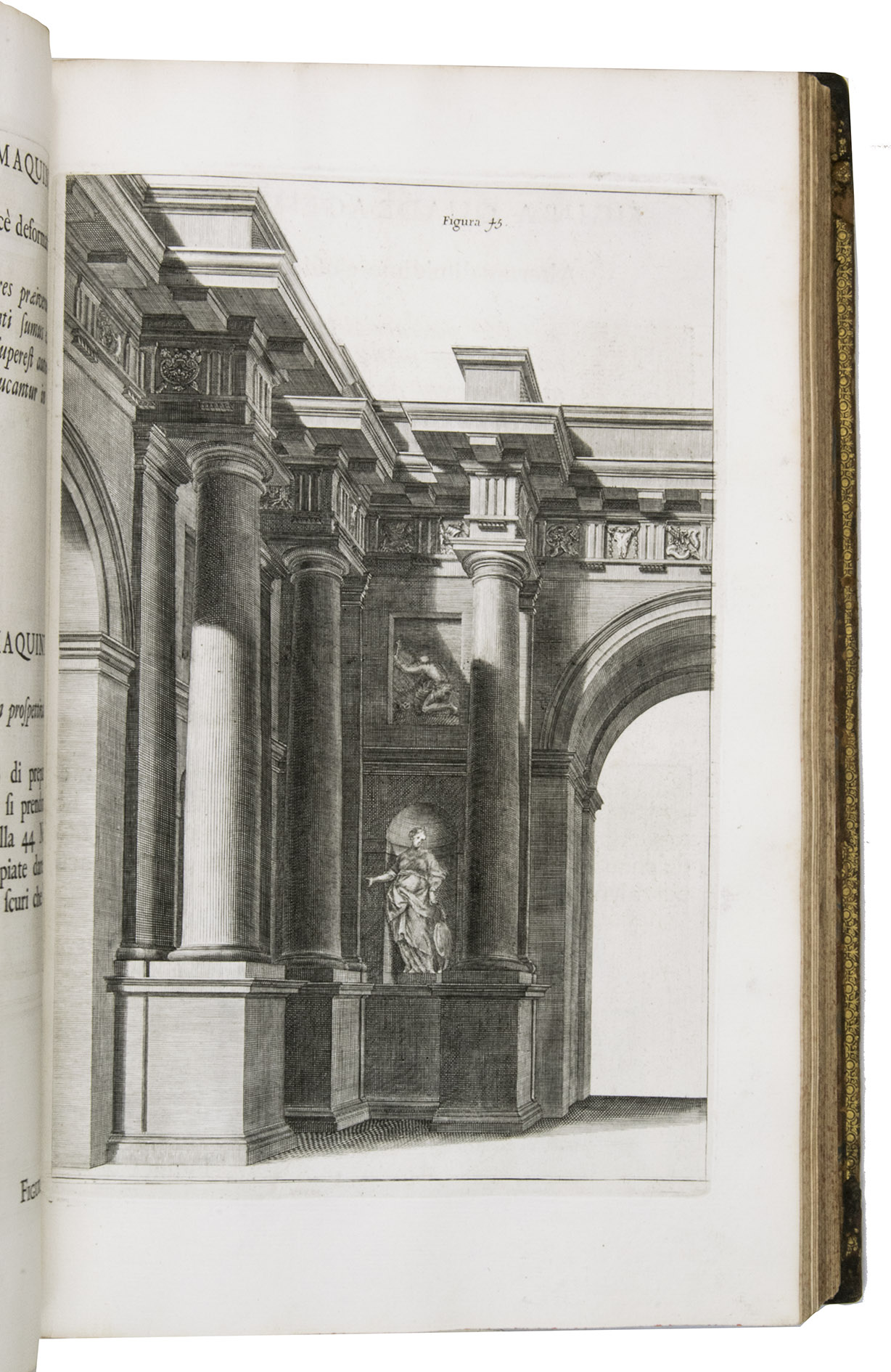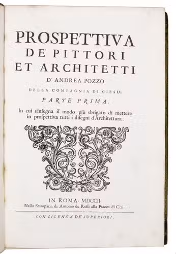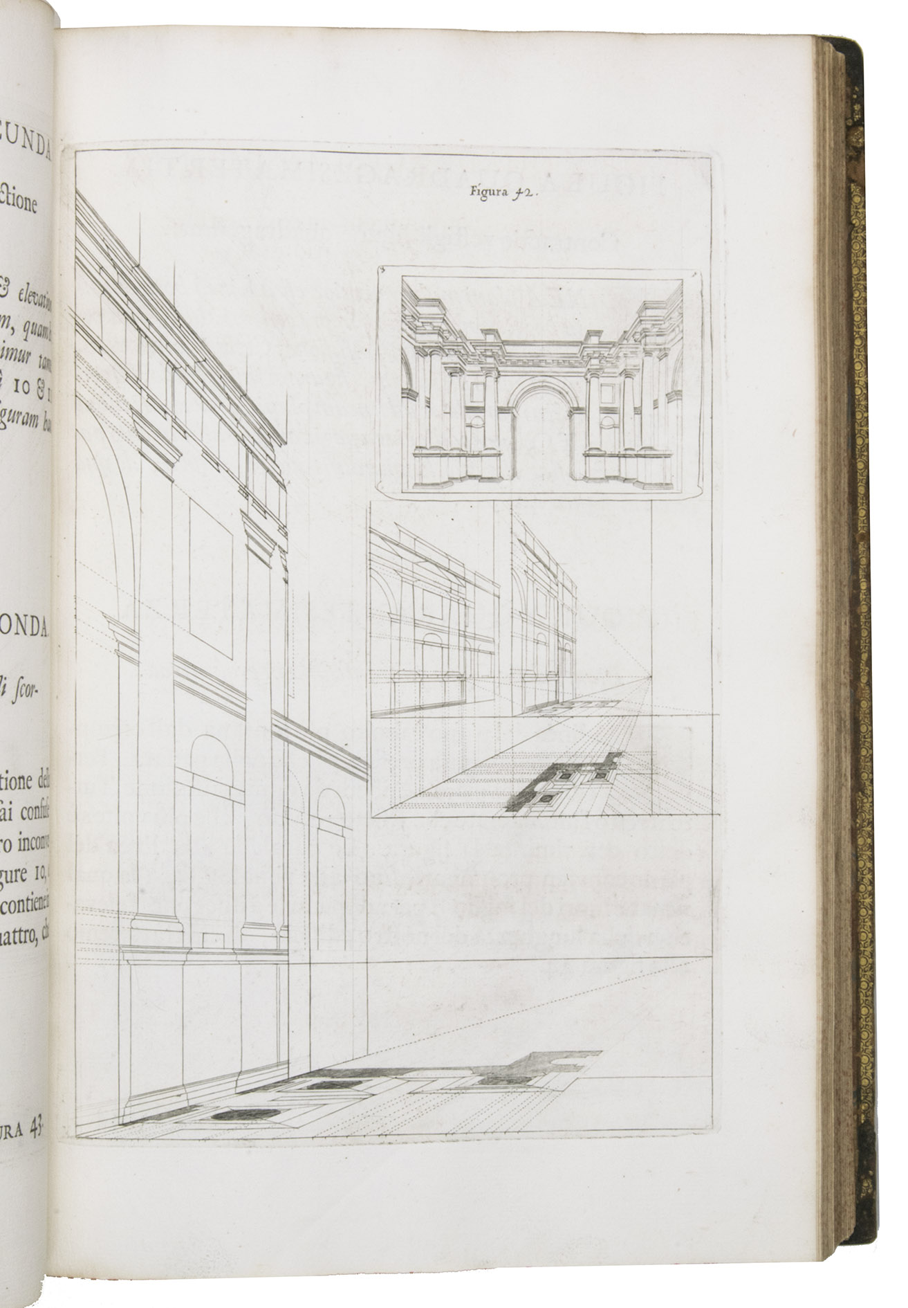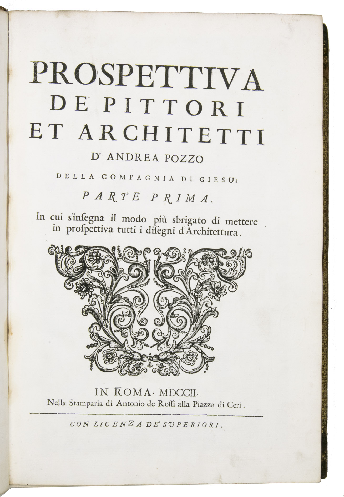 Complete edition, the two parts together, of Andrea Pozzo's remarkable richly illustrated architectural work. It is a huge collection of engraved perspectival and architectural plans and designs by the famous Italian artist and architect Andrea Pozzo (1642-1709). The large folding plate with Pozzo's famous design for the anamorphosis painted on the ceiling of the St. Ignatius Church at Rome was first published in the present 1702-edition. The text of the present edition is bilingual throughout, with parallel text in Latin and Italian on the verso of the plates, relating to the facing plates. Also two titles are present for both parts, one in Latin and one in Italian. At the end a short treatise on fresco painting is added, with explanatory text on four additional leaves in Latin and four leaves in Italian. Pozzo was a clergyman, painter, architect and art theoretician. He executed quite a number of anamorphoses or "trompe-l'oeil" paintings in Italian churches. The present work represents a monument of Baroque art and architecture, and helped spread the ideas of the Roman Baroque in Northern Europe. It also is a classic in perspectival literature, offering a complete manual to both painters and architects on the use and delineation of all kinds of perspective, including anamorphoses.