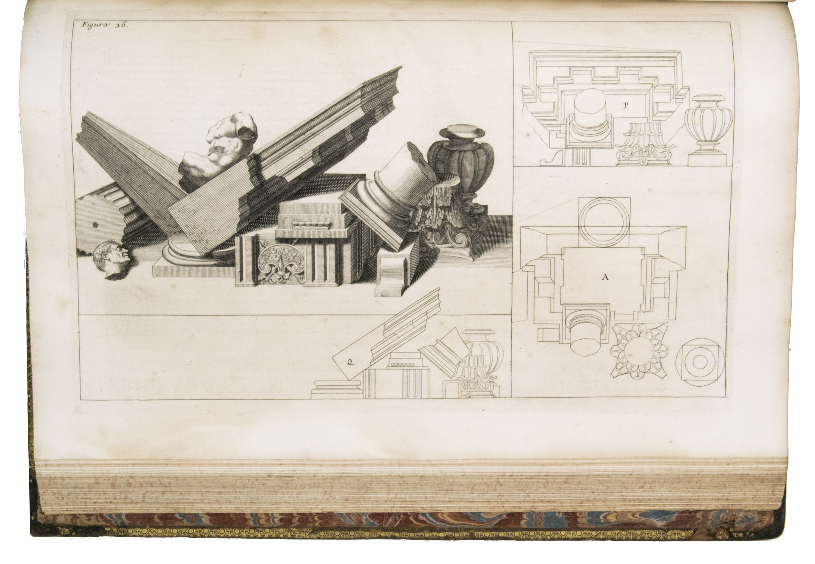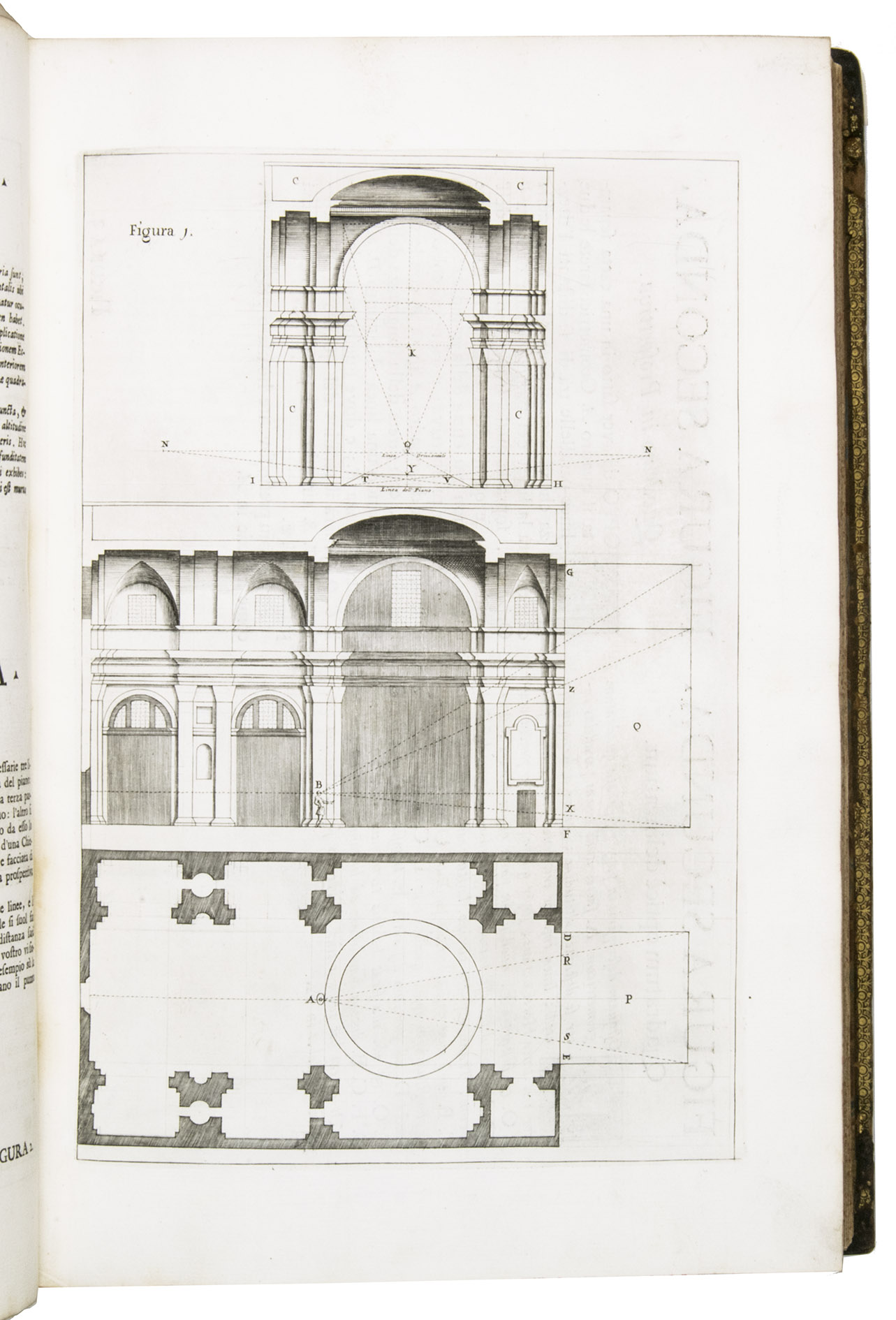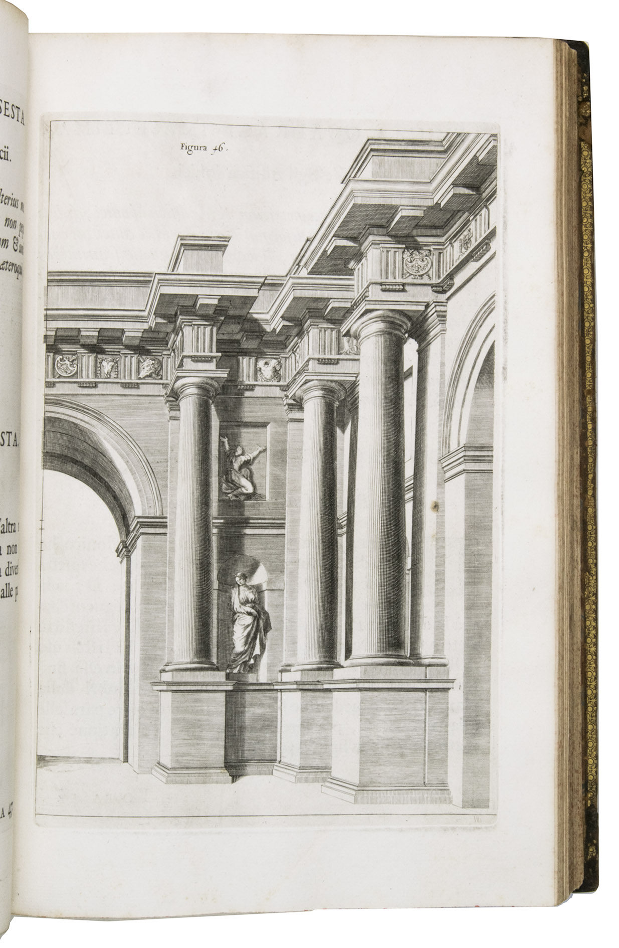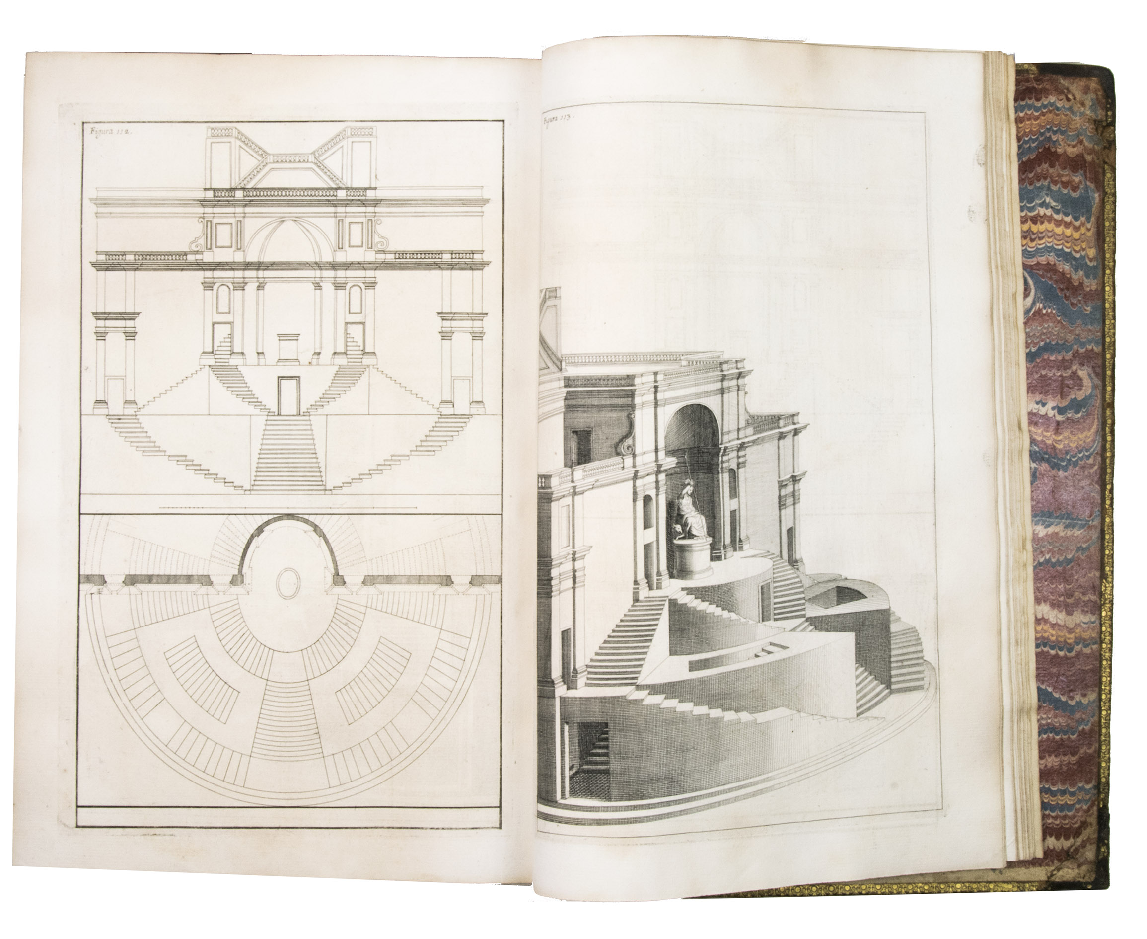 Complete edition, the two parts together, of Andrea Pozzo's remarkable richly illustrated architectural work. It is a huge collection of engraved perspectival and architectural plans and designs by the famous Italian artist and architect Andrea Pozzo (1642-1709). The large folding plate with Pozzo's famous design for the anamorphosis painted on the ceiling of the St. Ignatius Church at Rome was first published in the present 1702-edition. The text of the present edition is bilingual throughout, with parallel text in Latin and Italian on the verso of the plates, relating to the facing plates. Also two titles are present for both parts, one in Latin and one in Italian. At the end a short treatise on fresco painting is added, with explanatory text on four additional leaves in Latin and four leaves in Italian. Pozzo was a clergyman, painter, architect and art theoretician. He executed quite a number of anamorphoses or "trompe-l'oeil" paintings in Italian churches. The present work represents a monument of Baroque art and architecture, and helped spread the ideas of the Roman Baroque in Northern Europe. It also is a classic in perspectival literature, offering a complete manual to both painters and architects on the use and delineation of all kinds of perspective, including anamorphoses.