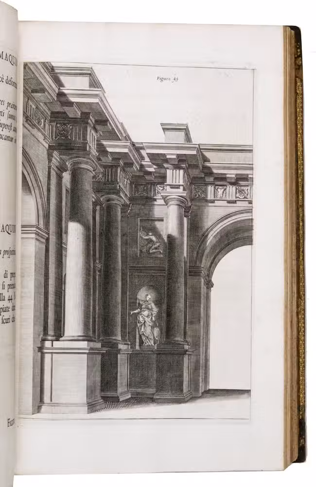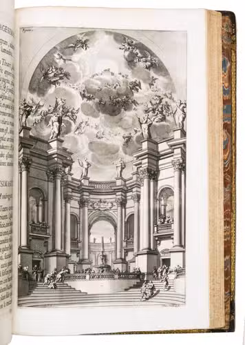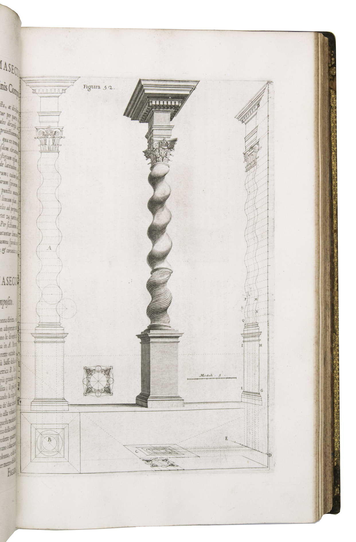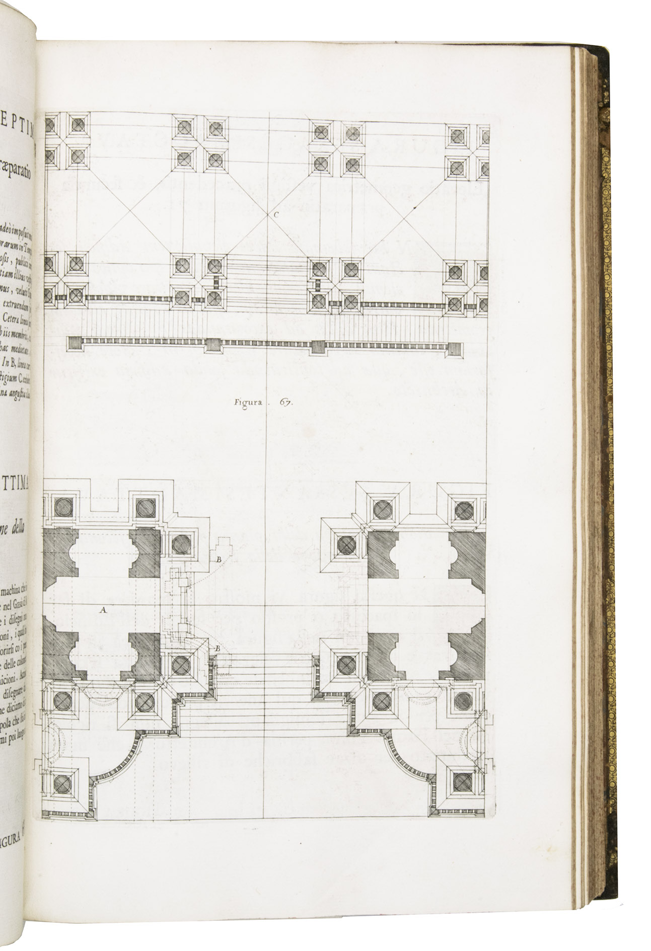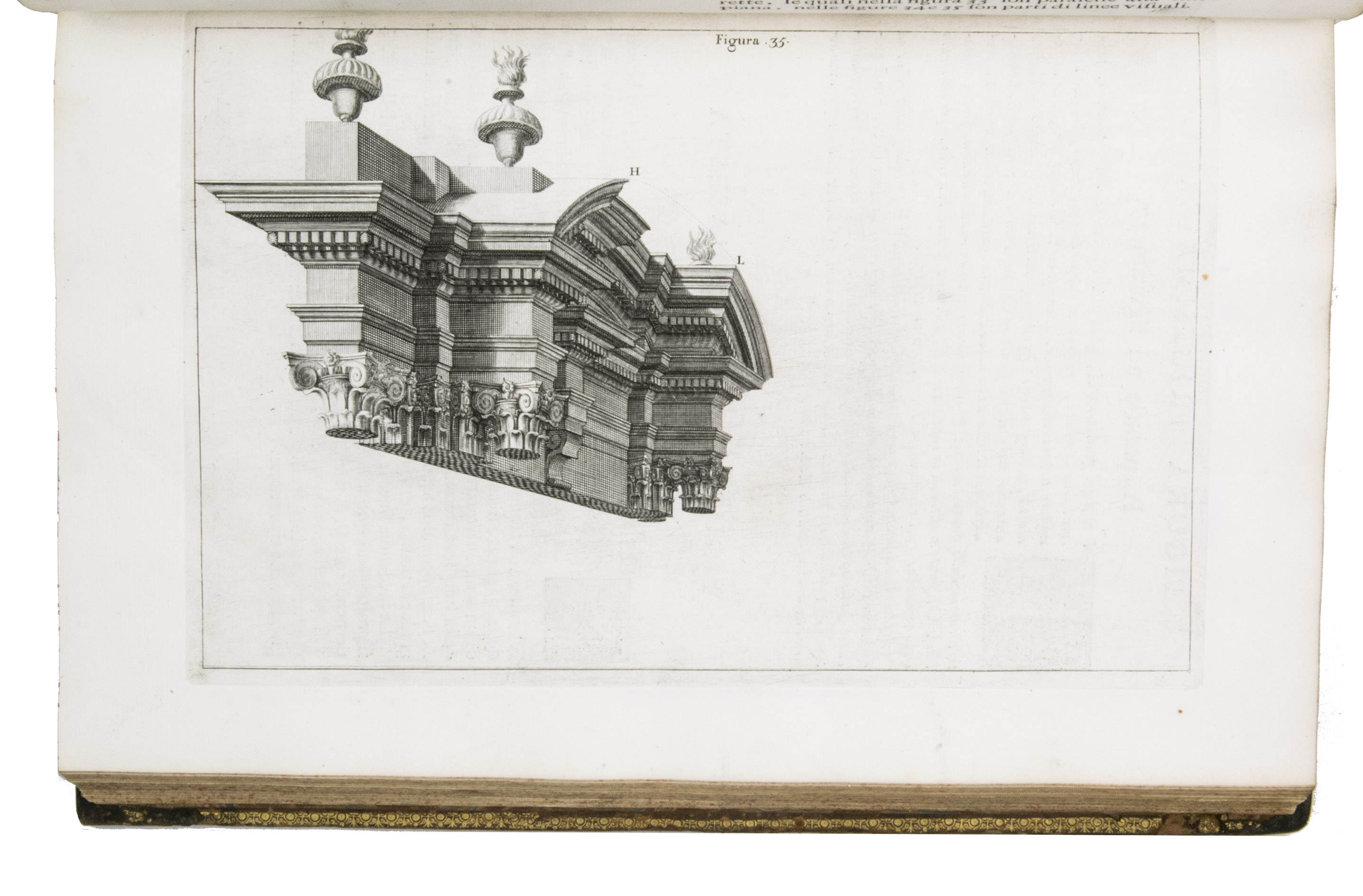 Complete edition, the two parts together, of Andrea Pozzo's remarkable richly illustrated architectural work. It is a huge collection of engraved perspectival and architectural plans and designs by the famous Italian artist and architect Andrea Pozzo (1642-1709). The large folding plate with Pozzo's famous design for the anamorphosis painted on the ceiling of the St. Ignatius Church at Rome was first published in the present 1702-edition. The text of the present edition is bilingual throughout, with parallel text in Latin and Italian on the verso of the plates, relating to the facing plates. Also two titles are present for both parts, one in Latin and one in Italian. At the end a short treatise on fresco painting is added, with explanatory text on four additional leaves in Latin and four leaves in Italian. Pozzo was a clergyman, painter, architect and art theoretician. He executed quite a number of anamorphoses or "trompe-l'oeil" paintings in Italian churches. The present work represents a monument of Baroque art and architecture, and helped spread the ideas of the Roman Baroque in Northern Europe. It also is a classic in perspectival literature, offering a complete manual to both painters and architects on the use and delineation of all kinds of perspective, including anamorphoses.