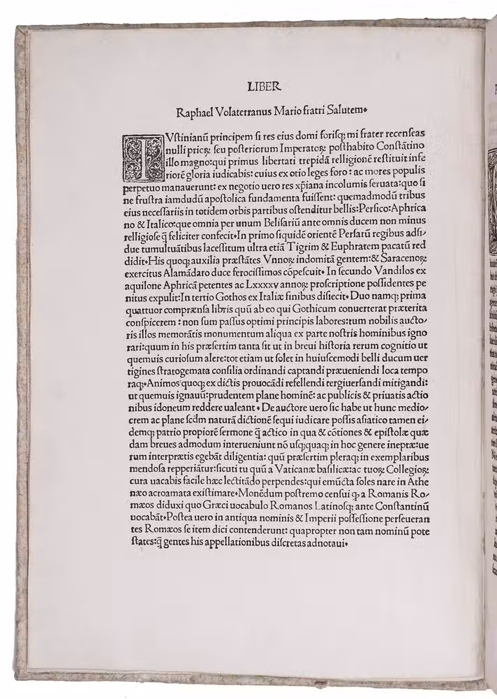 First and only edition of the Latin translation from the Greek by Raffaele Maffei Bishop of Volaterra (1451-1522), a noted humanist and encyclopaedist, of the story of the Persian wars and the wars against the Vandals in North Africa, under the reign of the Roman Emperor Justinianus, written by Procopius (ca. 494-after 562). The original Greek text was first published by Höschelius at Augsburg as late as 1607; an English version by Holcroft followed in 1653.