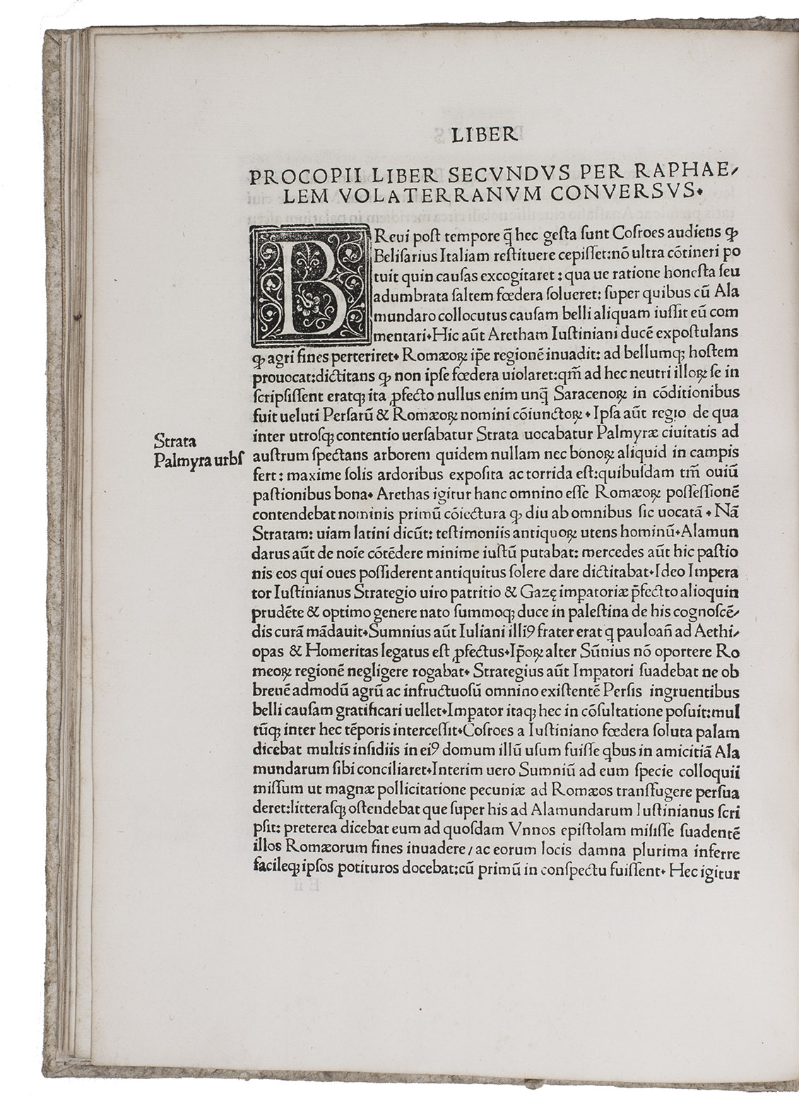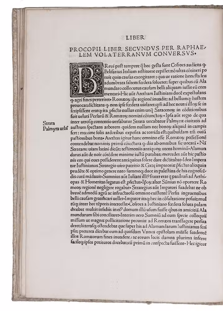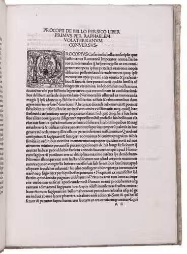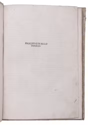 With this edition the text of the De bello Persico appears for the first time in print; a Latin translation of the De bello Vandilico by Leonardo Bruni had already been printed in 1470. De bello Vandilico contains accounts of the early 6th century Byzantine military campaigns against the Persian kings Kavadh and Chosroes Anushirvan, and against the Vandals in North Africa.