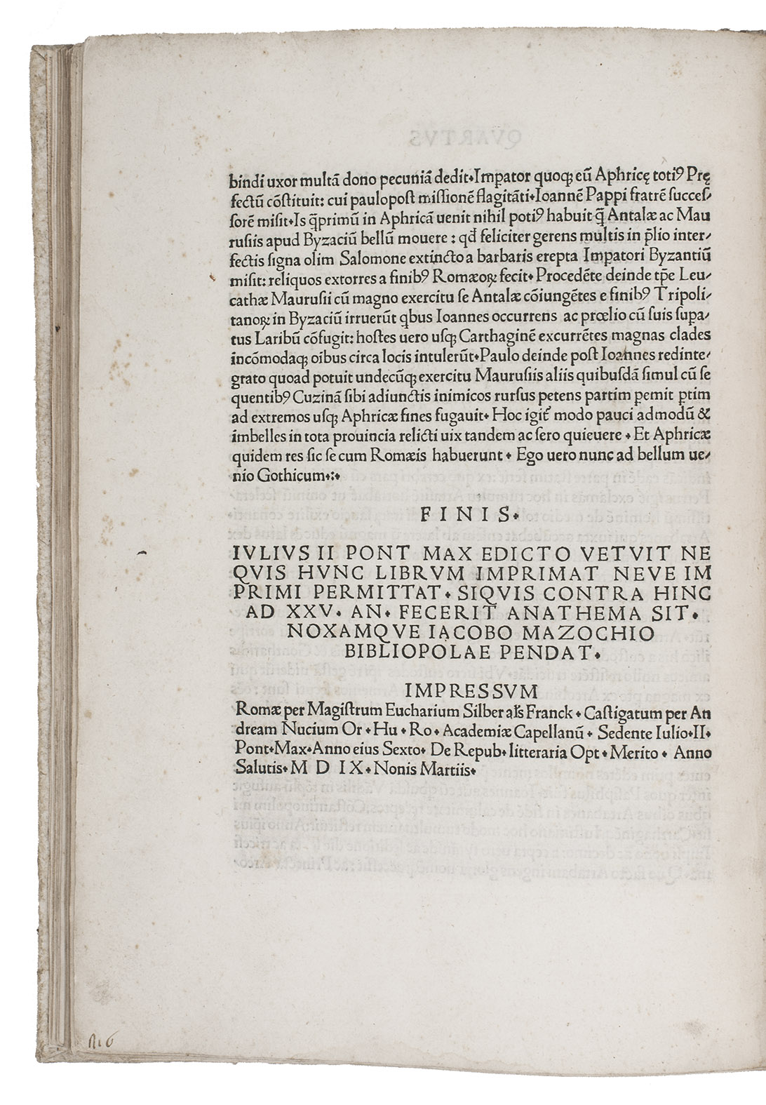 The colophon is unusual in referring to the editor, Andrea Nucio (= Andreas Muzio), by name. The lengthy privilege by Pope Julius II is in favour of Giacomo Mazzocchi, a learned Roman bookseller, printer, and noted antiquarian, who is first mentioned here.