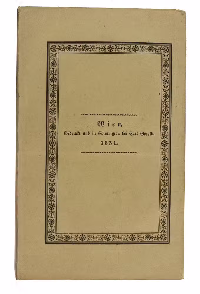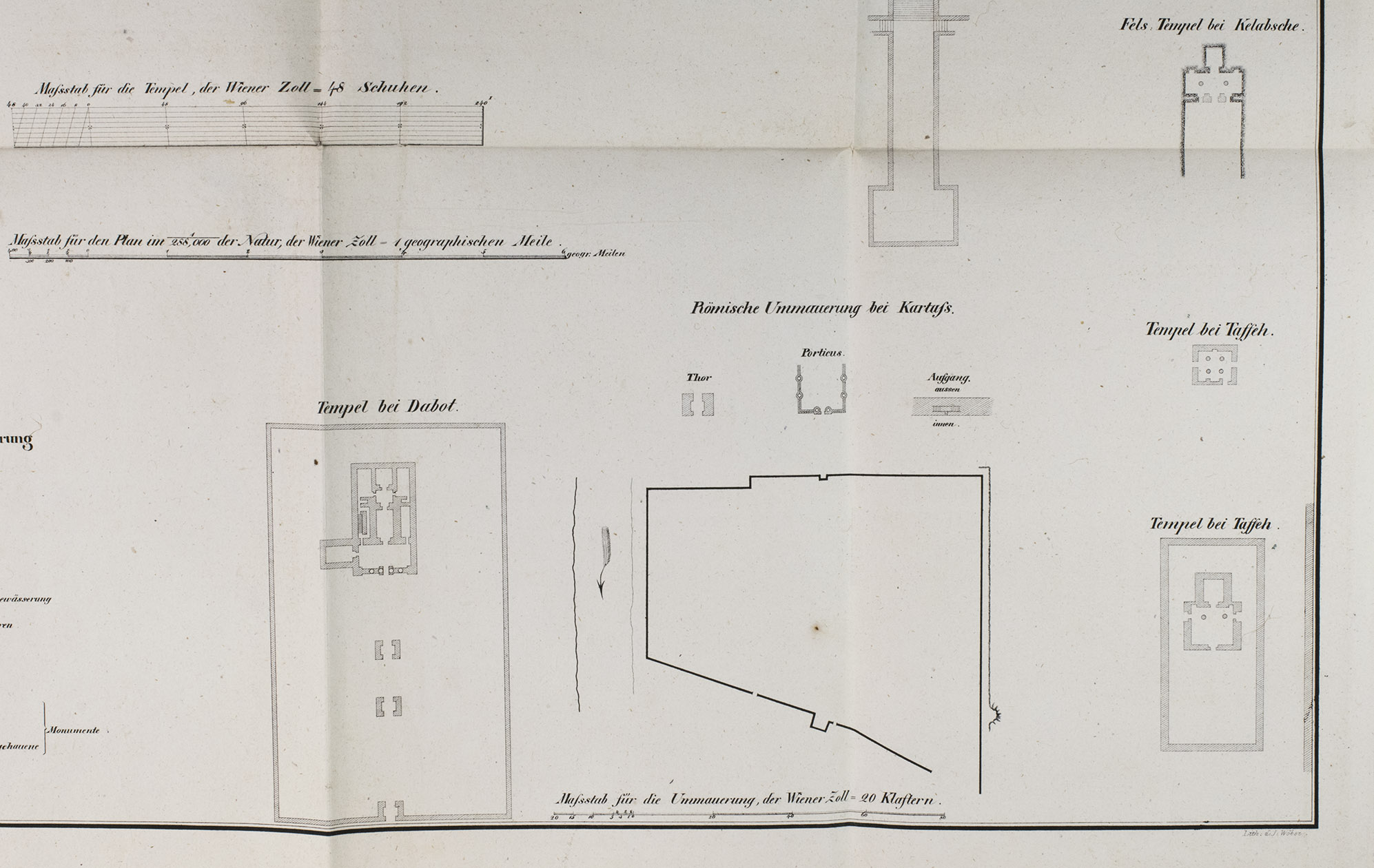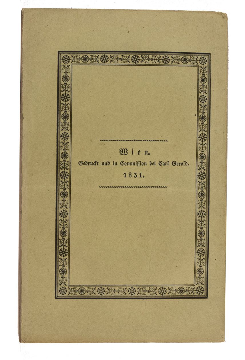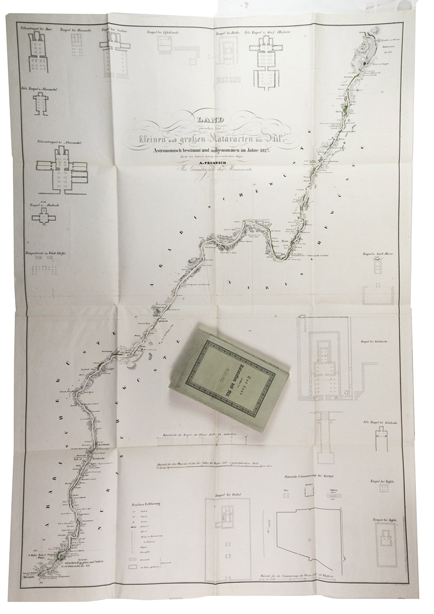 Vienna, Carl Gerold, 1831. 12mo (the book) and 17.5 x 25 cm (the folder with the folded map). With a separate large folding lithographed map (98 x 69 cm; image area 93 x 64 cm) assembled from 2 sheets, with the cultivated areas along the river hand-coloured in green as published, also showing 17 floor plans of temples and a plan of a Roman wall. The book in the publishers original light green paper wrappers and the map in a matching green paper folder. [8], 181, [3 blank] pp. plus folding table and separate map.