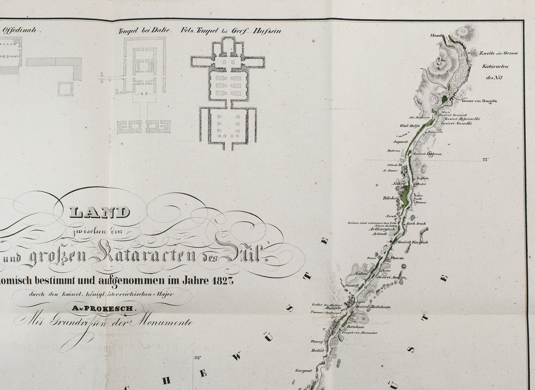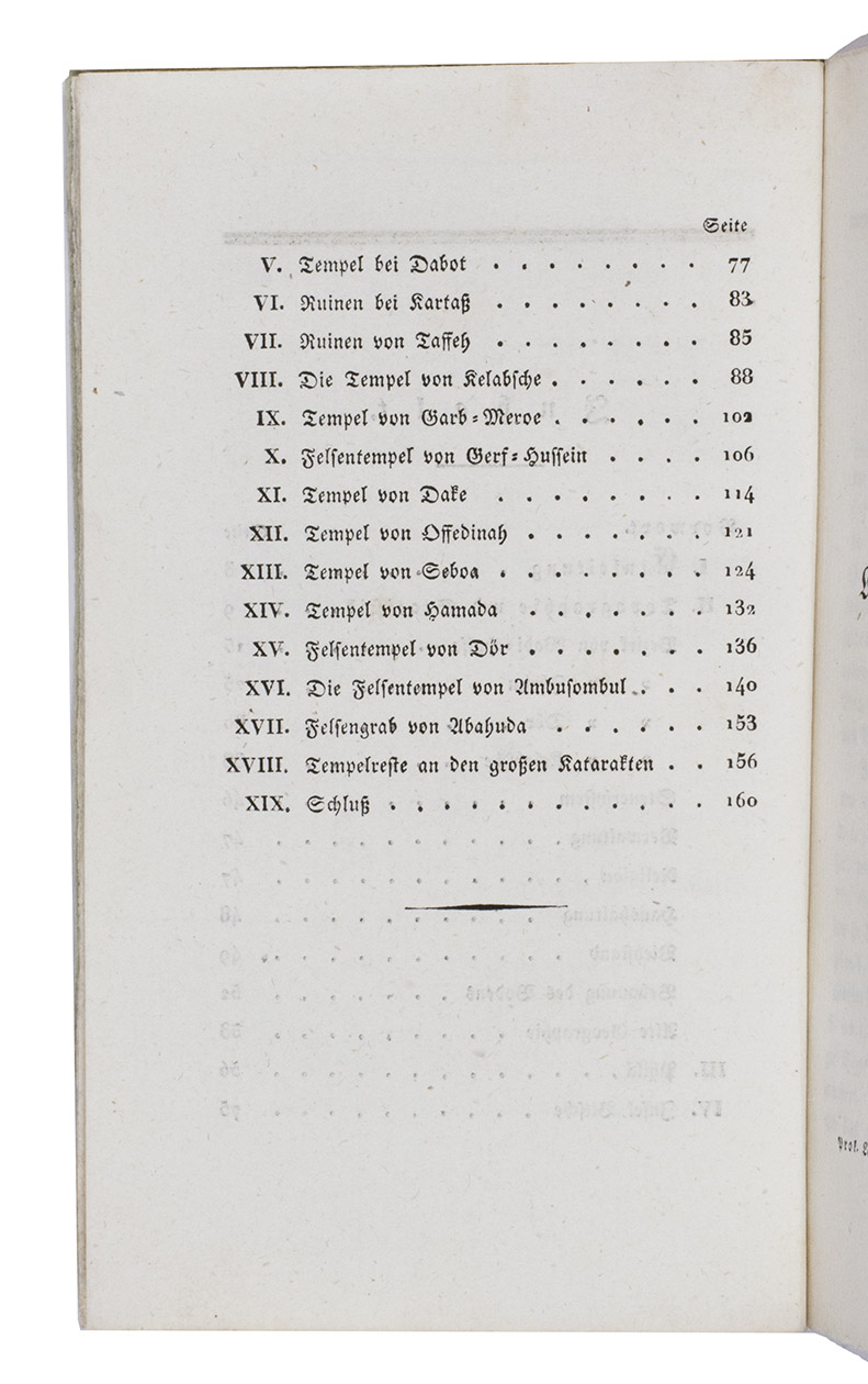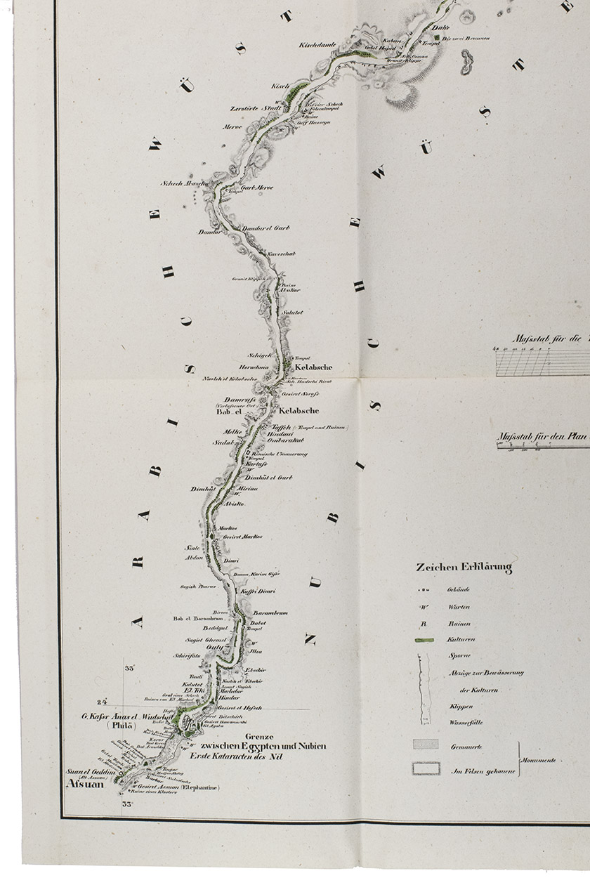 A fine copy of a detailed and important archaeological survey of sites along the Nile and on its islands, between the first and second cataracts (now at the bottom of Lake Nassar). It covers many important ancient Egyptian and Nubian sites in detail. The map itself shows a 270 km stretch of the Nile from 21° 41' to 24° 9' N latitude from south of Wadi Halfa around what is now the border between Egypt and Sudan to Aswan around the ancient border between Egypt and Nubia. The sites covered include Abu Simbel, Wadi Halfa, the temple of Kalabsha, the island of Philae and many other famous cities and temples. Many copies lack the map, which was probably published separately as well.