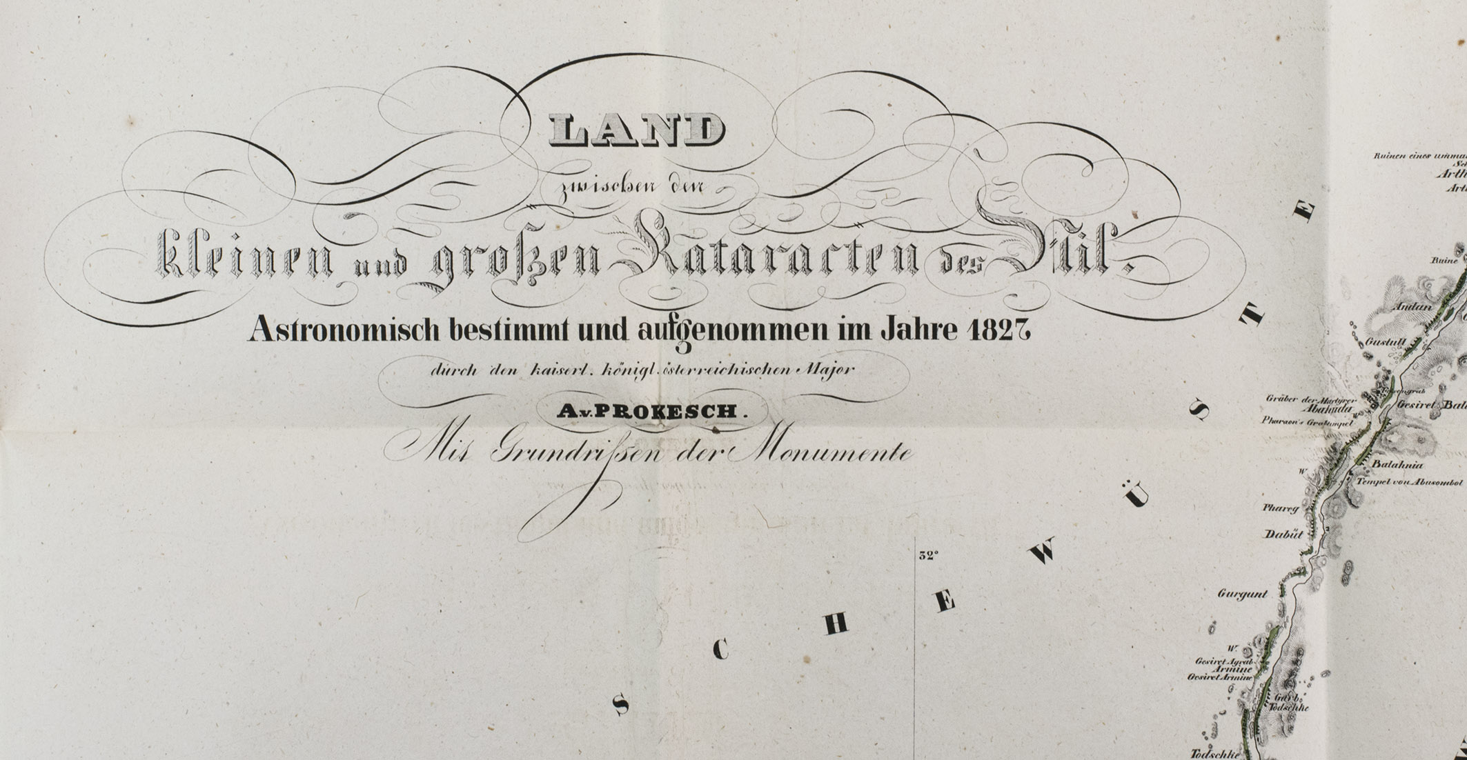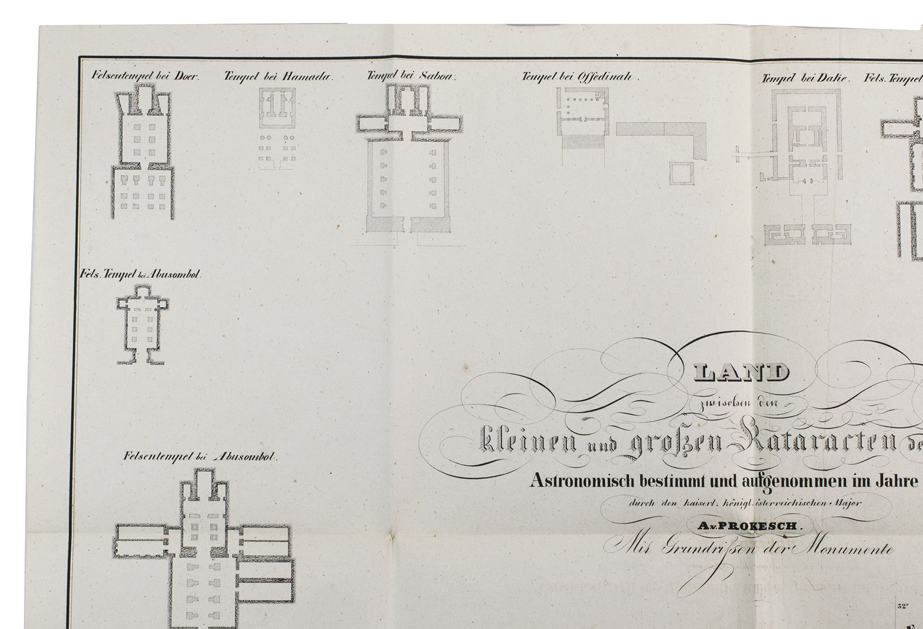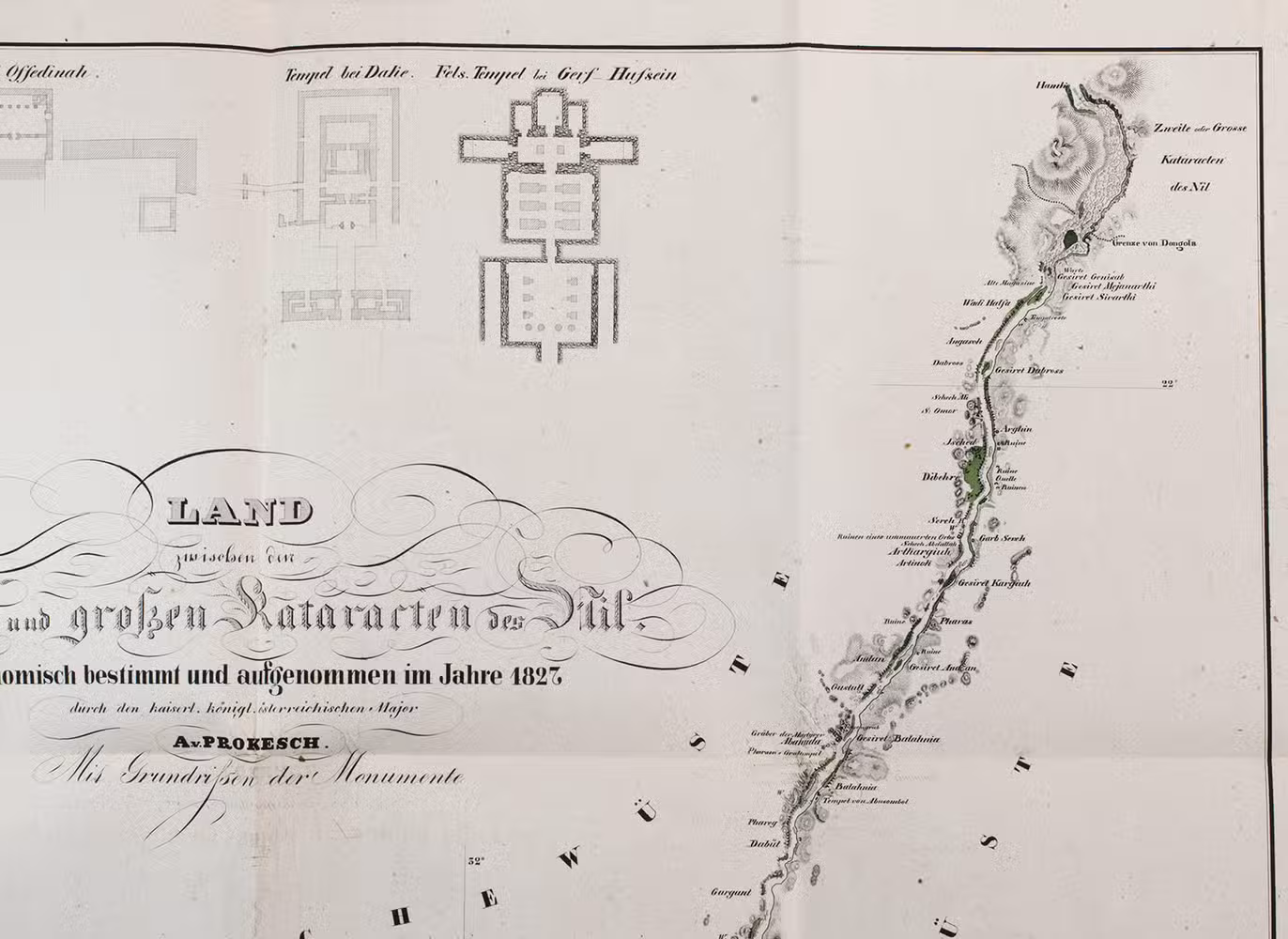 A fine copy of a detailed and important archaeological survey of sites along the Nile and on its islands, between the first and second cataracts (now at the bottom of Lake Nassar). It covers many important ancient Egyptian and Nubian sites in detail. The map itself shows a 270 km stretch of the Nile from 21° 41' to 24° 9' N latitude from south of Wadi Halfa around what is now the border between Egypt and Sudan to Aswan around the ancient border between Egypt and Nubia. The sites covered include Abu Simbel, Wadi Halfa, the temple of Kalabsha, the island of Philae and many other famous cities and temples. Many copies lack the map, which was probably published separately as well.