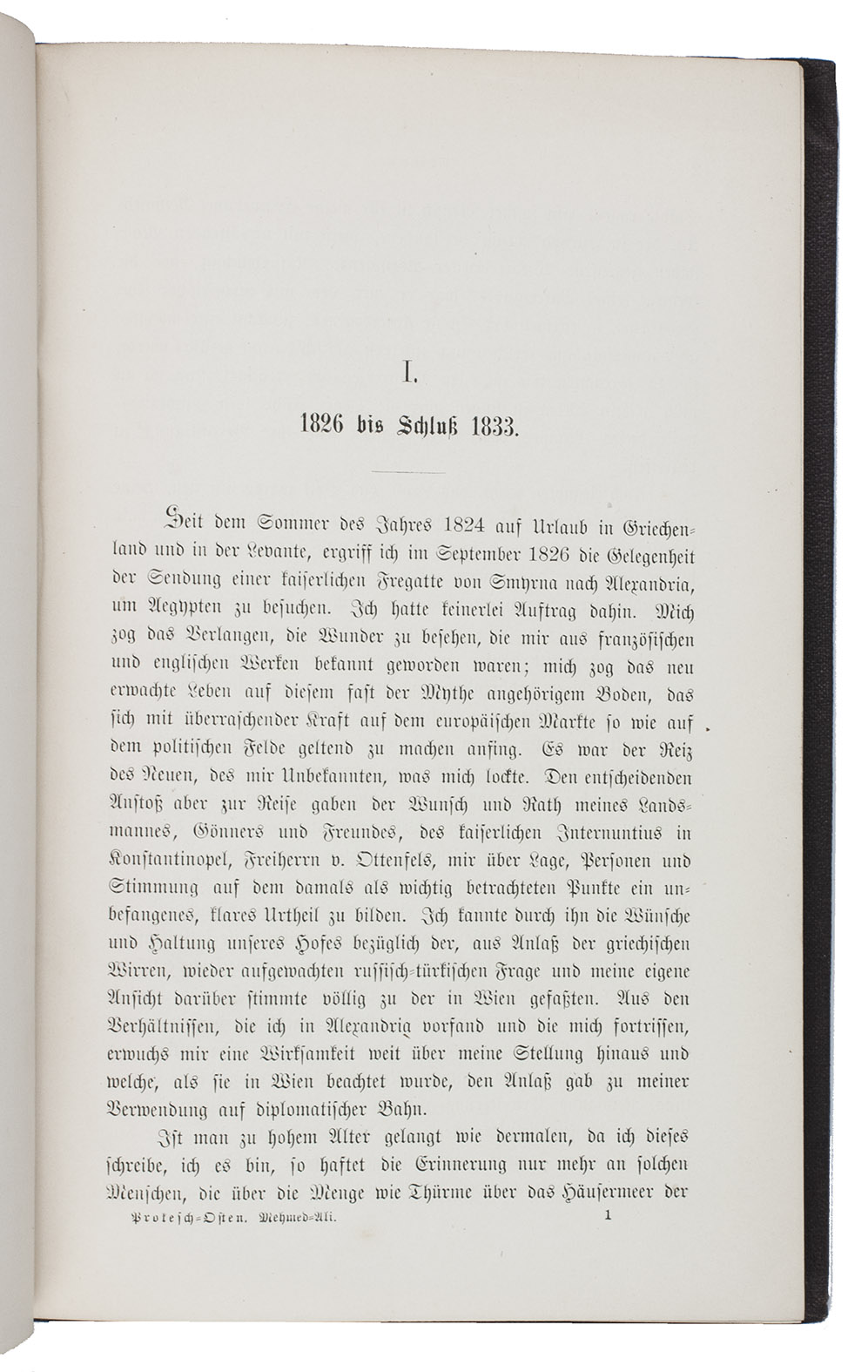 First and only edition of a work on Muhammad Ali (1769-1849), Pasha of Egypt, written by the Austrian diplomat Anton Prokesch (1795-1876). From 1824 onwards Prokesch was active in the Middle East, surveying the region and negotiating in various conflicts. In this work he describes his activities during these years especially those relating to Muhammad Ali, for example the peace treaty between Muhammad Ali and the Ottoman Sultan Mahmud II, where Prokesch was present.