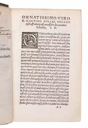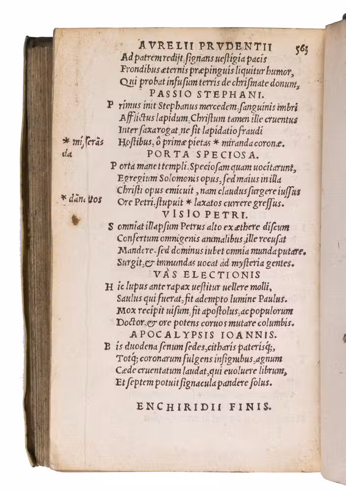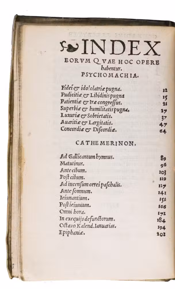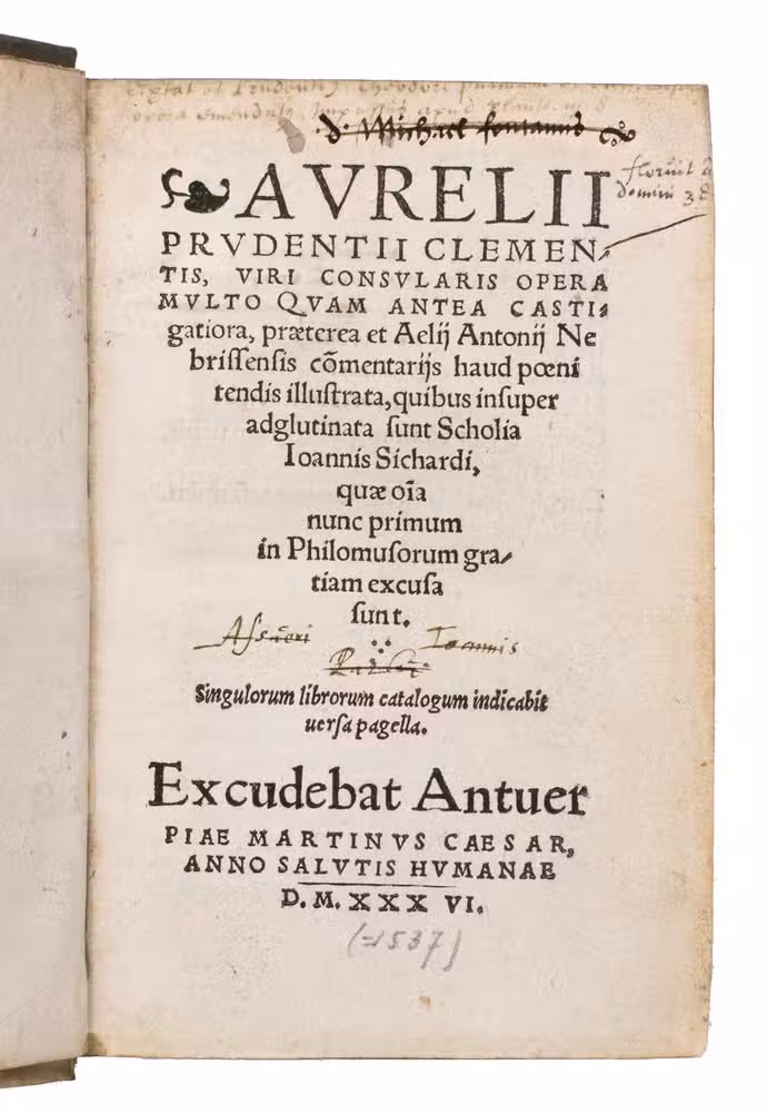 The present work was published in 1536, although the dedicatory epistle by Johannes Sichard (ca. 1499-1557) to Martinus Golias is dated from Basel, March 1537. It features extensive commentaries by the Spanish humanist Elio Antonio de Nebrija (1441-1522), renowned for his pioneering work in Latin and Spanish grammar, alongside annotations by the German humanist Sichard. The edition consolidates insights from earlier Basel and Aldine manuscripts, and it contains Psychomachia, the first allegorical poem in Latin literature depicting the battle of virtues against vices, here in a meticulously edited form.