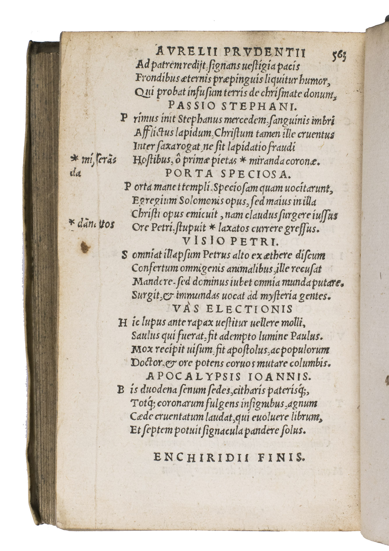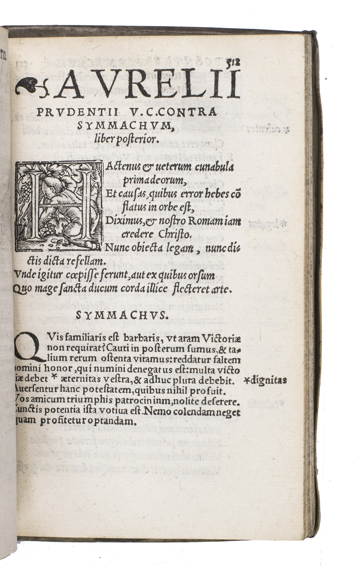 Other works included are the famous Cathemerinon, twelve hymns structured around the hours of the day and church festivals, the Peristephanon, fourteen poems celebrating the martyrdom of Spanish and Roman saints, Apotheosis, a polemic defending the divinity of Christ, Hamartigenia, a theological poem on the origin of sin, opposing Gnostic dualism, Libri contra Symmachum, two books opposing the pagan senator Symmachus demands regarding the altar of victory, and finally Enchiridion Novi et Veteris Testamenti.