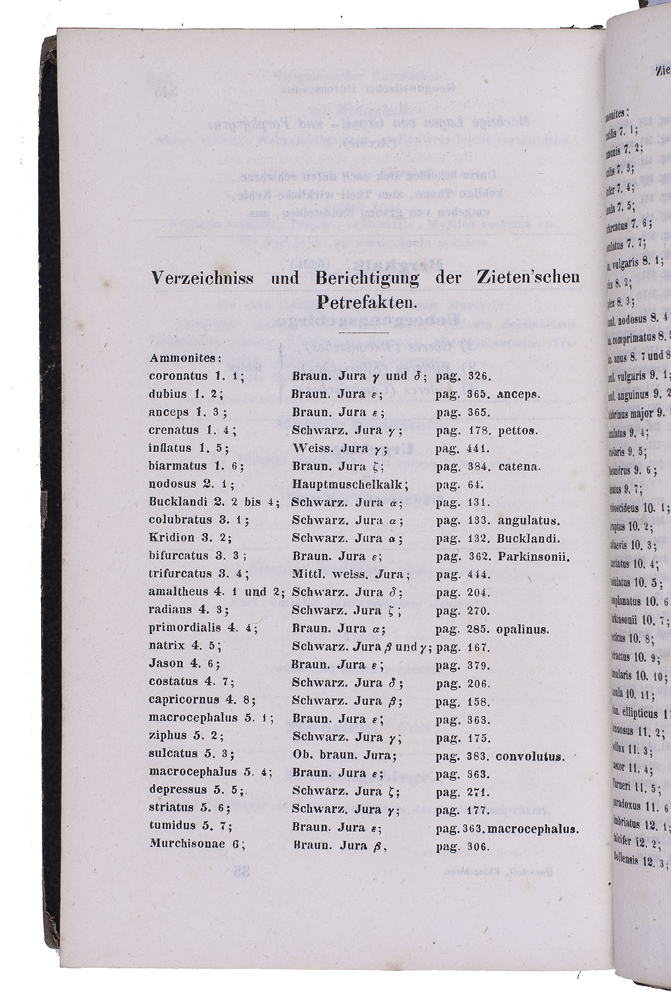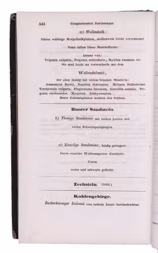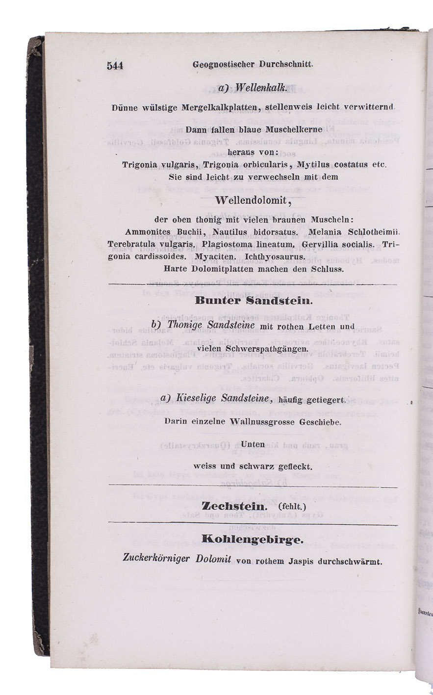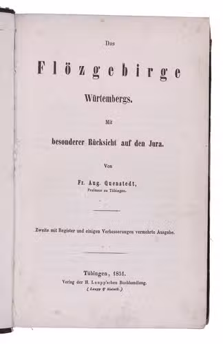 Enlarged second edition of an important treatise on strata from the Jurassic period by the German mineralogist Friedrich August von Quenstedt (1809-1889). The work can be seen as a precursor of Quenstedt's famous work Der Jura, published in 1858. Quenstedt distinguished 18 zones from the Jurassic period in the earth of Württemberg based on petrifications and paleontological features. He describes the various stones, petrifications and fossils found in the strata, paying attention to different species and the quantity of fossils in specifying areas and periods. Included at the end is a list of fossils and petrifications.