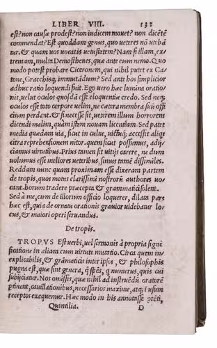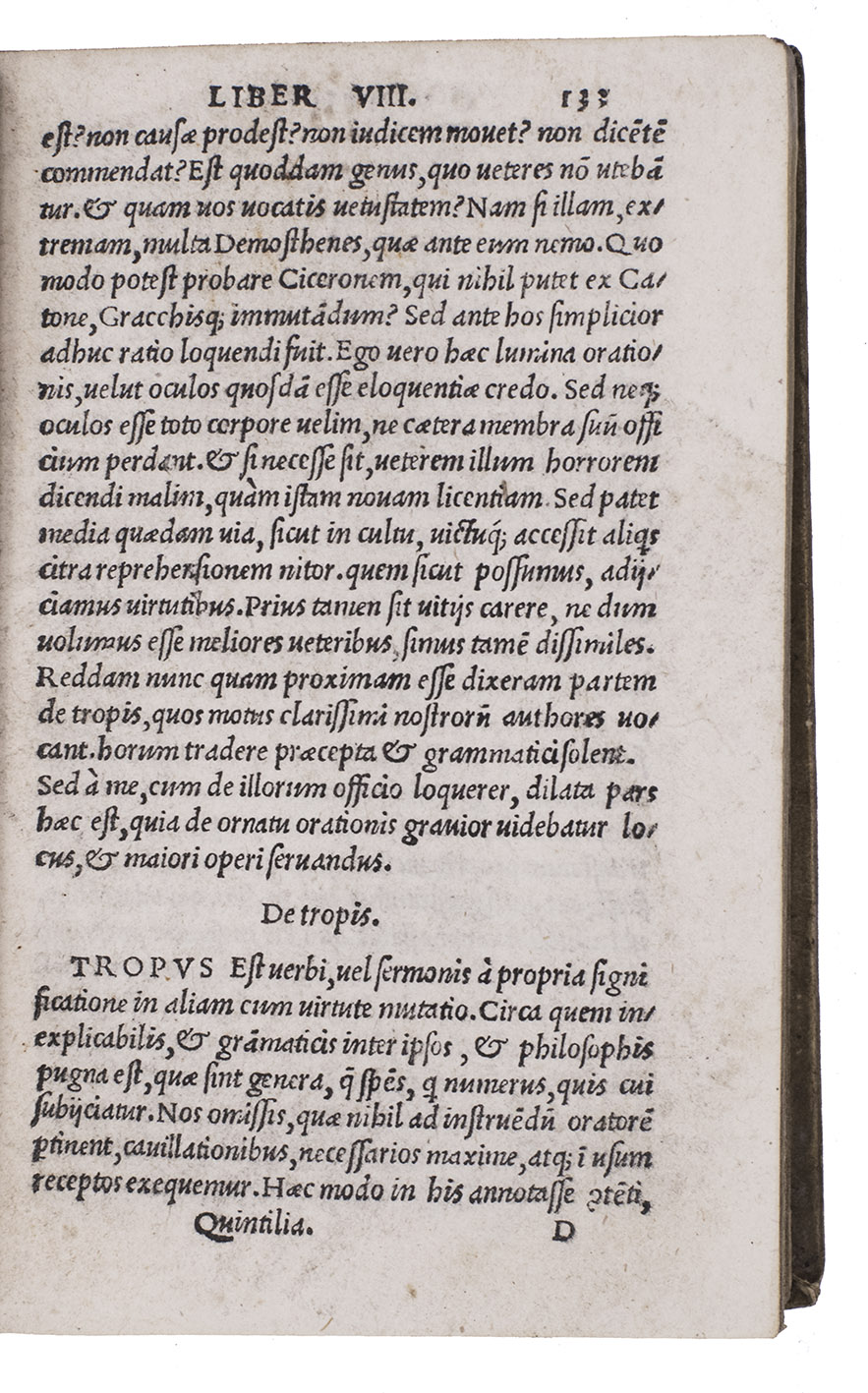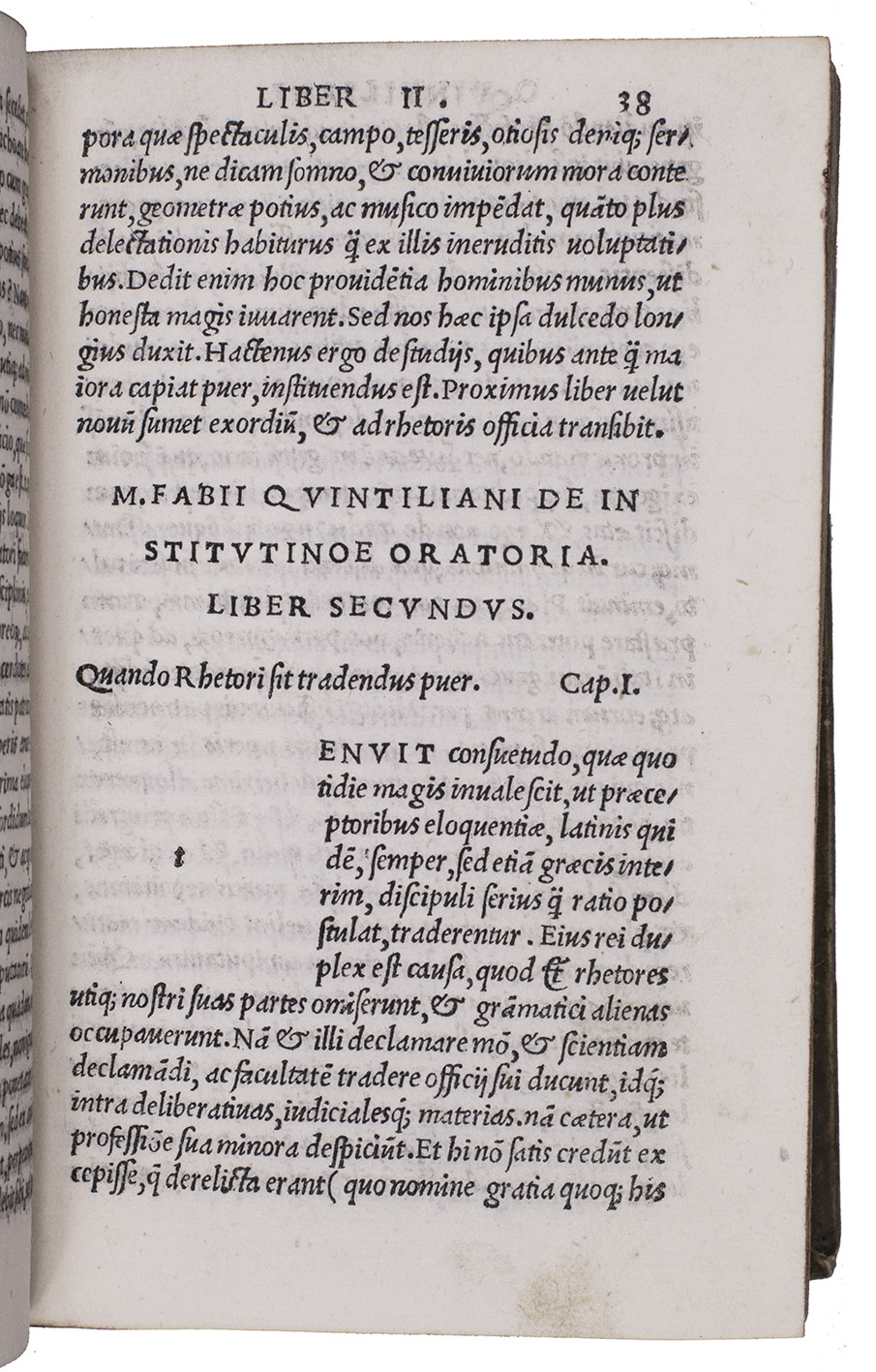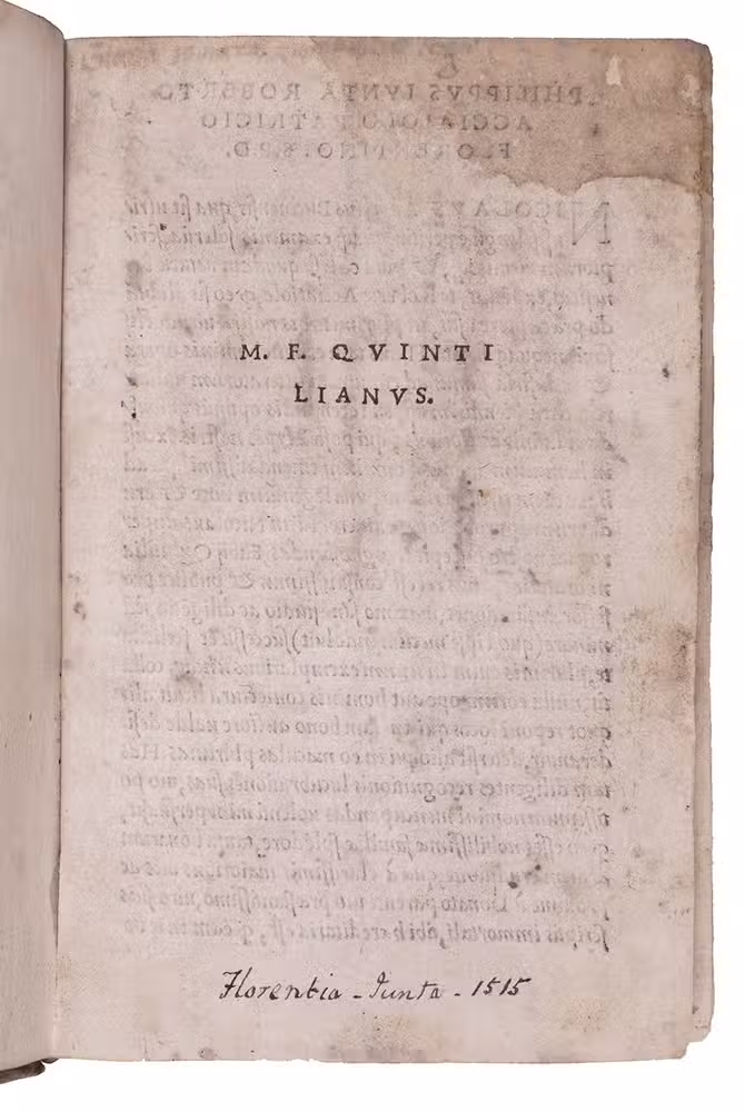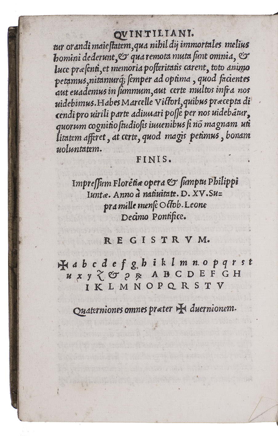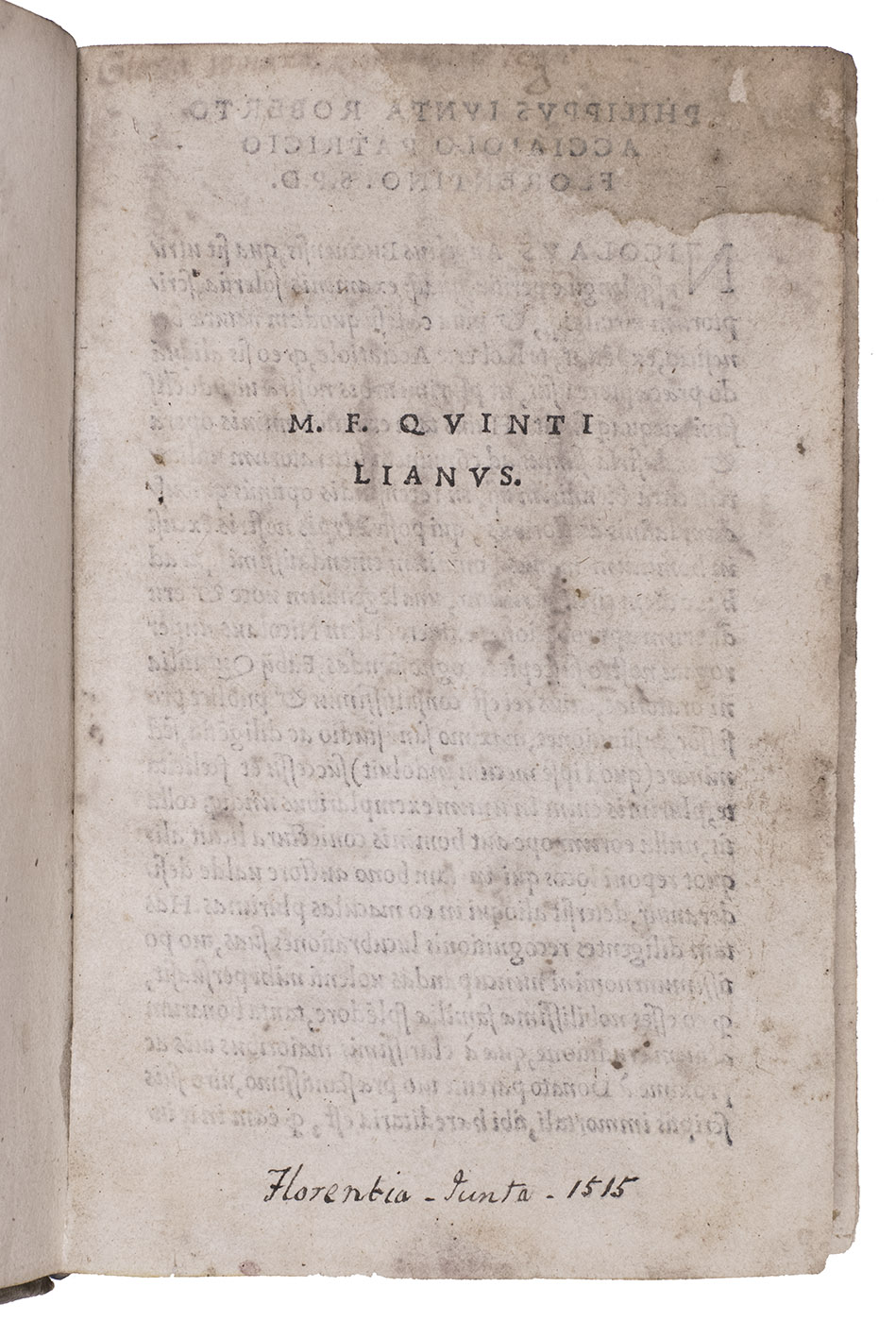 The first and only Giunta edition (one of the first in small format), in the original Latin, of the standard classical textbook on oratory and rhetoric by Quintilian (ca. 35-ca. 95/100 AD), in many respects the greatest orator between Cicero and Quintilian's own student Pliny the younger. It is refreshing today for its emphasis on the importance of the speaker's integrity, arguing that to speak well for a good cause requires character and morality. The Cicero-Quintilian-Pliny school was critical of orators they saw as promoting causes using clever tricks or florid language, or by appealing to the listener's worst qualities. Quintilian's Institutiones oratoriae, his only surviving work, also serves as one of our most important sources of information about education and culture in Roman antiquity. It not only teaches the theory and practice of rhetoric in speaking and writing, but also discusses the education and life-long development that an orator needs. Quintilian also advises the reader on the best authors on the subject, providing a critical examination of the history of rhetoric. Though contemporaries recognized Quintilian's quality and influence, the modern world knew his work only from fragments and by reputation until Poggio found a complete manuscript of the Oratoria in 1416.