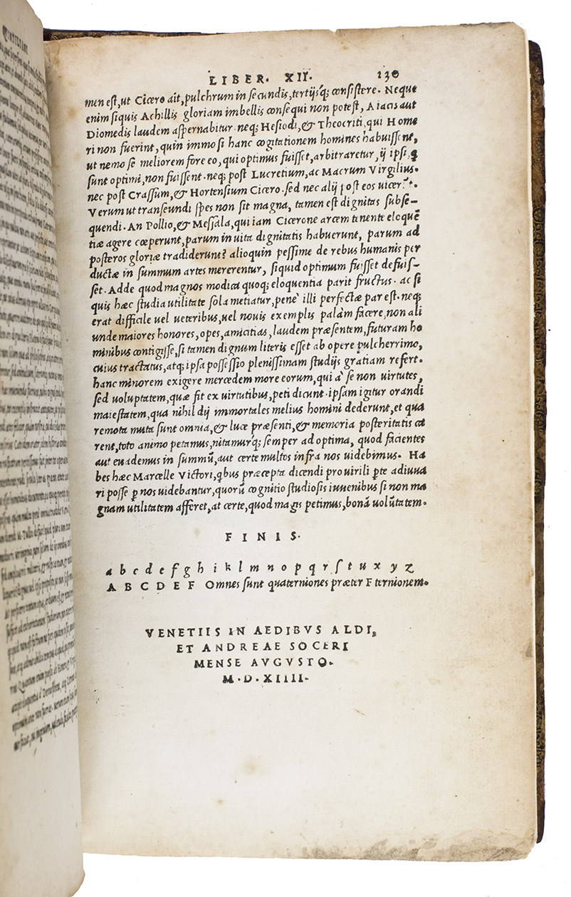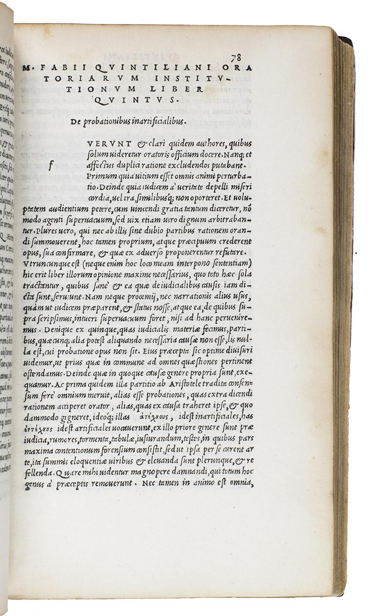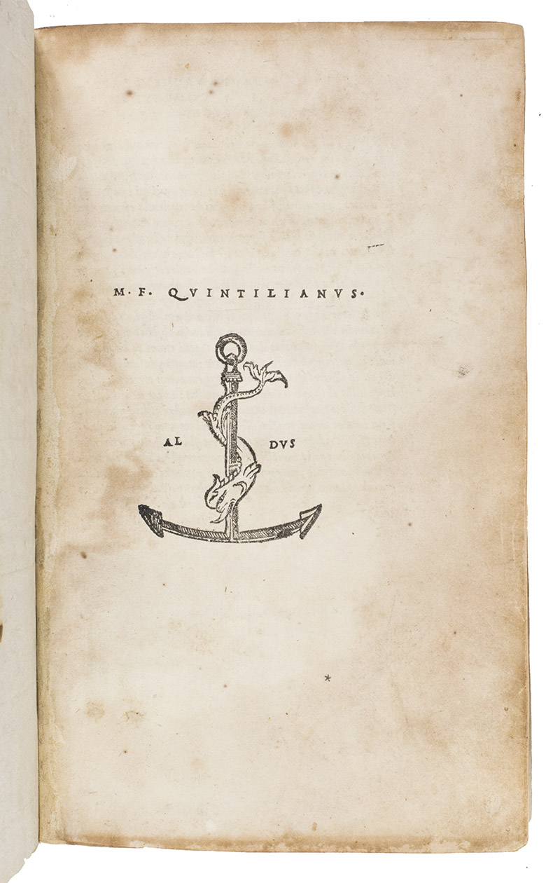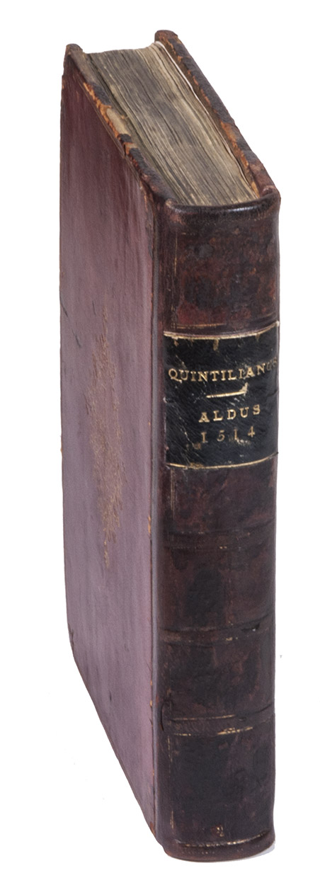 The first Aldine edition (the only one produced by Aldus Manutius himself) of the complete text of Quintilian's De oratoria, on the teaching of speaking and writing. It covers not only the theory and practice of rhetoric, but also the foundational education and development of the orator himself. For Quintilian, the ideal orator or rhetorician was skilled in speaking and also a moral man. The Institutiones can therefore be described as a treatise on education, a manual of rhetoric, a reader's guide to the best authors and a handbook of the moral duties of the orator. Although much of what he writes is similar to Cicero, Quintilian emphasizes teaching. He was recognized by his contemporaries and strongly influenced the schools that the Romans spread throughout the Empire until the fifth century. The present edition is well printed and set entirely in one size of italic type, a style Aldus introduced in 1501.